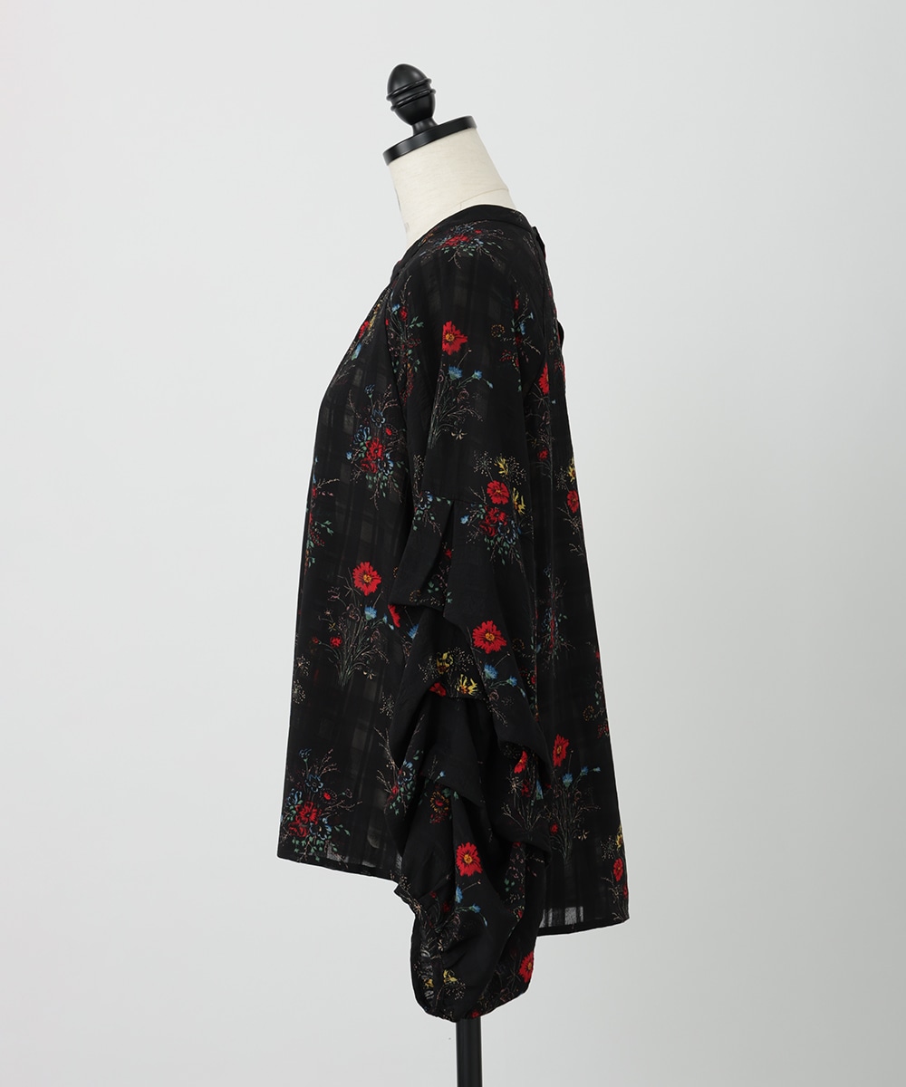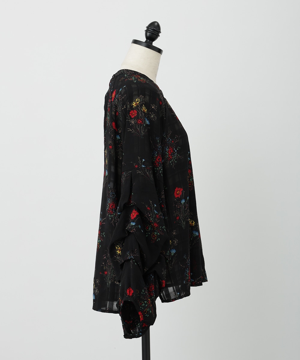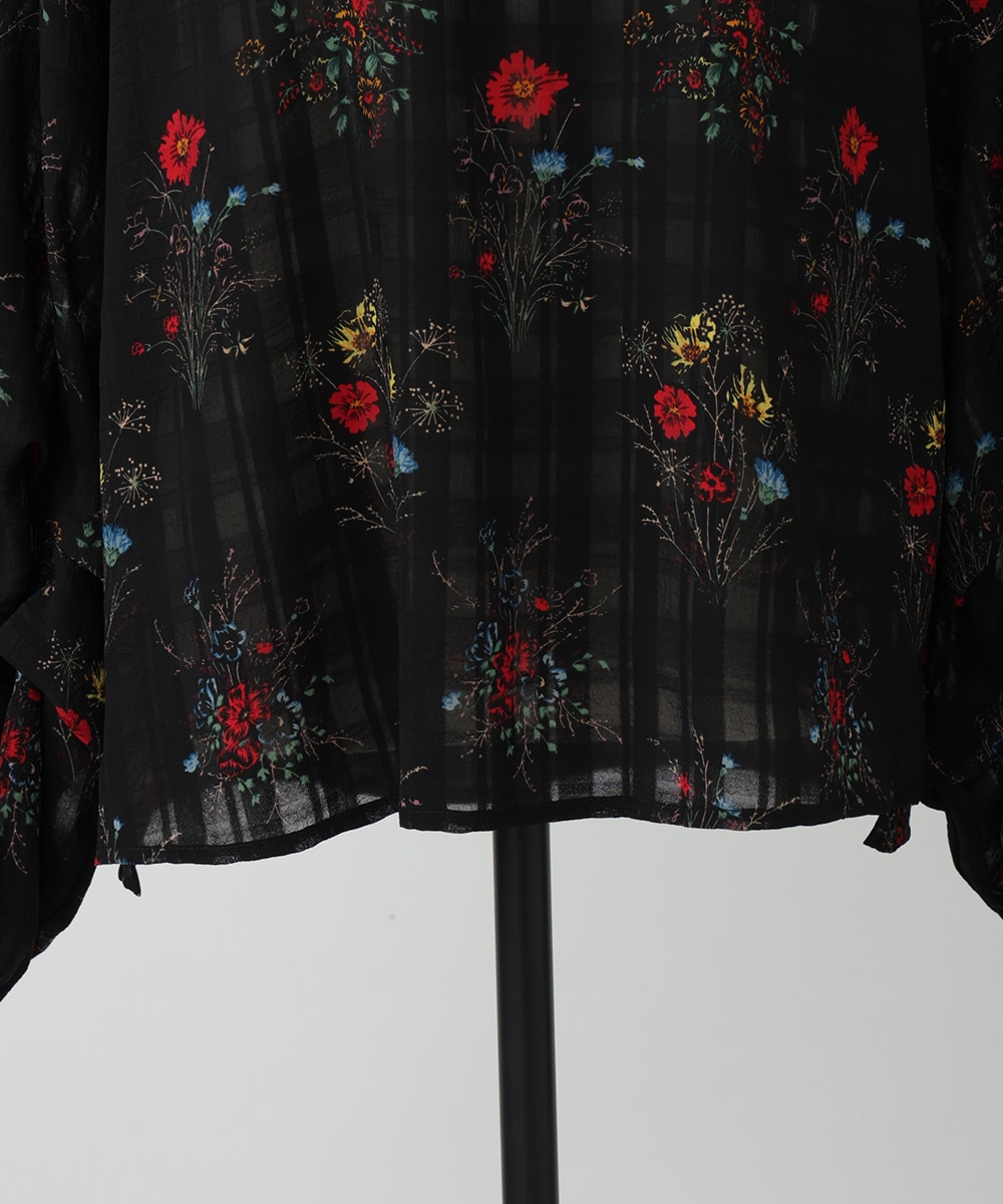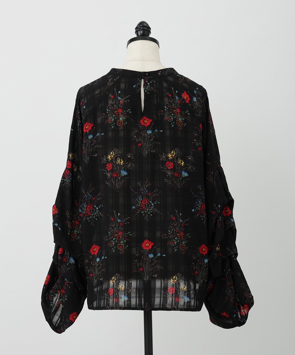 薄手のチェック地にフラワープリントを添えた、やわらかな女性らしさ漂うブラウス。スリーブはくしゅっとしたギャザーを寄せ、立体感のあるシルエットを楽しめるデザインです。シワ感のある軽やかな素材が魅力的。パンツスタイルと合わせれば、大人フェミニンなスタイリングが完成するアイテムです。