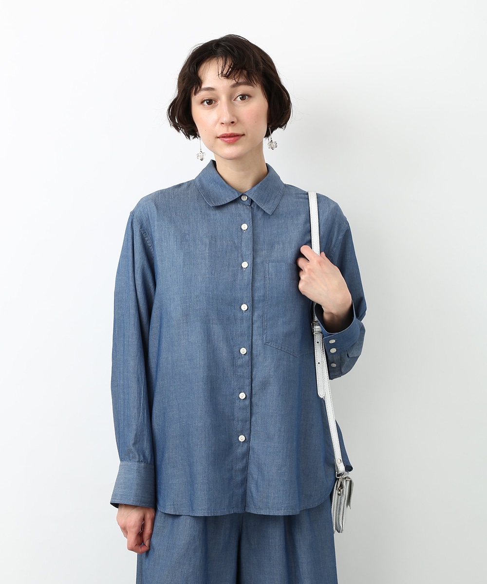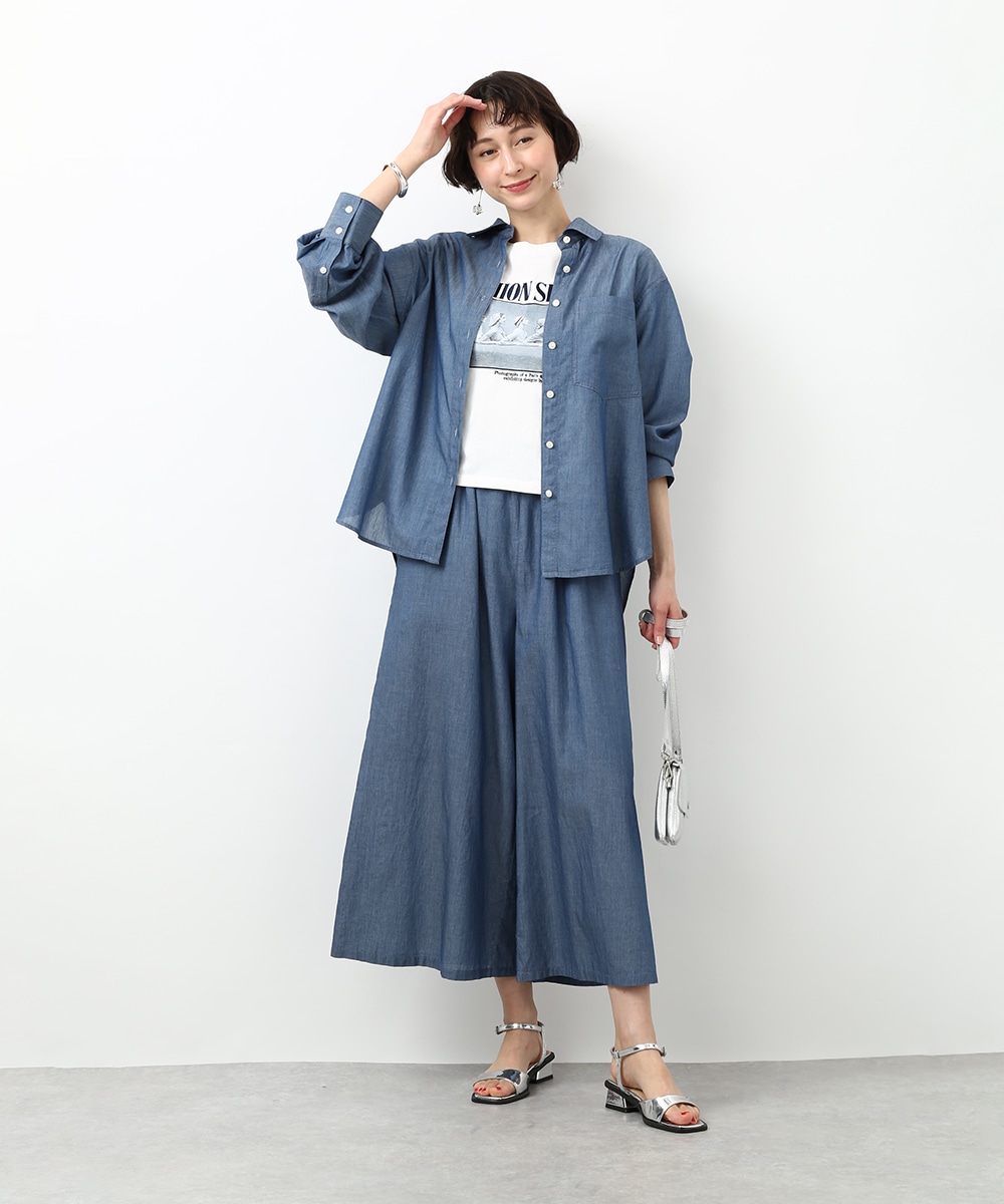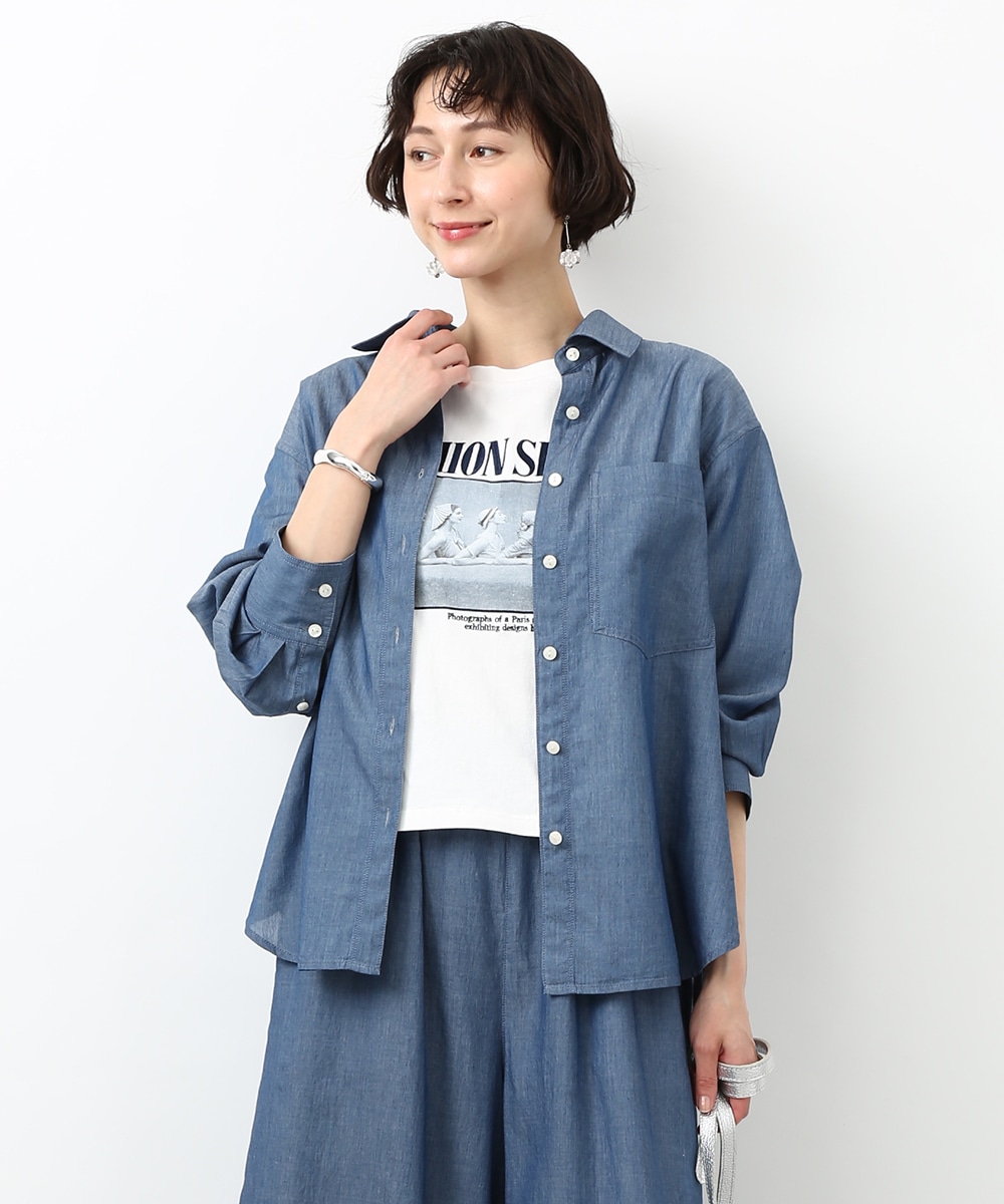 人気のシアーデニム素材を使用したシャツ。デニムならではの風合いを残しつつ、軽やかに着られるのが魅力です。ほどよくゆとりのあるシルエットでリラックス感があり、さらっと羽織るだけで軽さのある印象に仕上がるのもポイント。同素材のボトムスと合わせたセットアップスタイルもおすすめです。季節の変わり目にも重宝する1枚です。