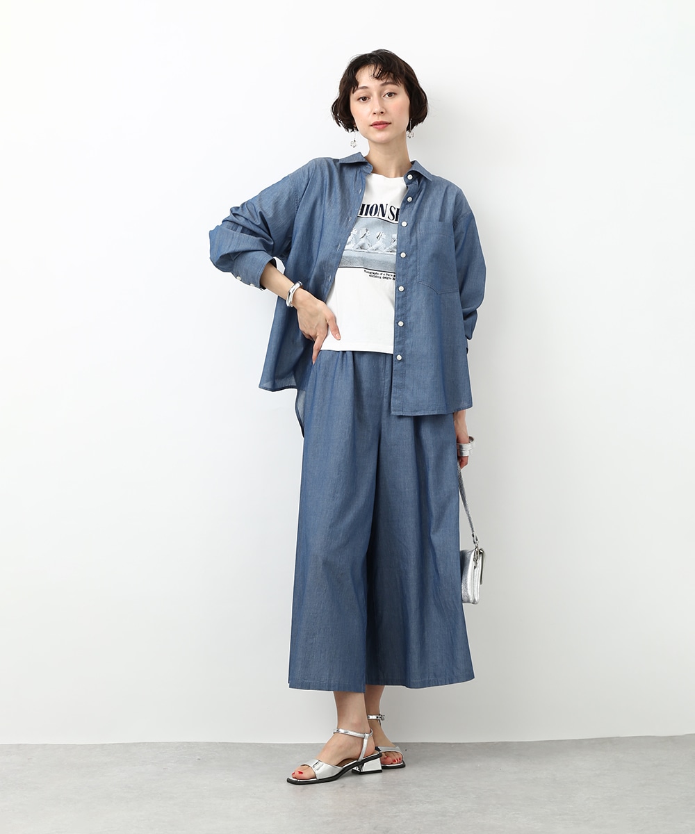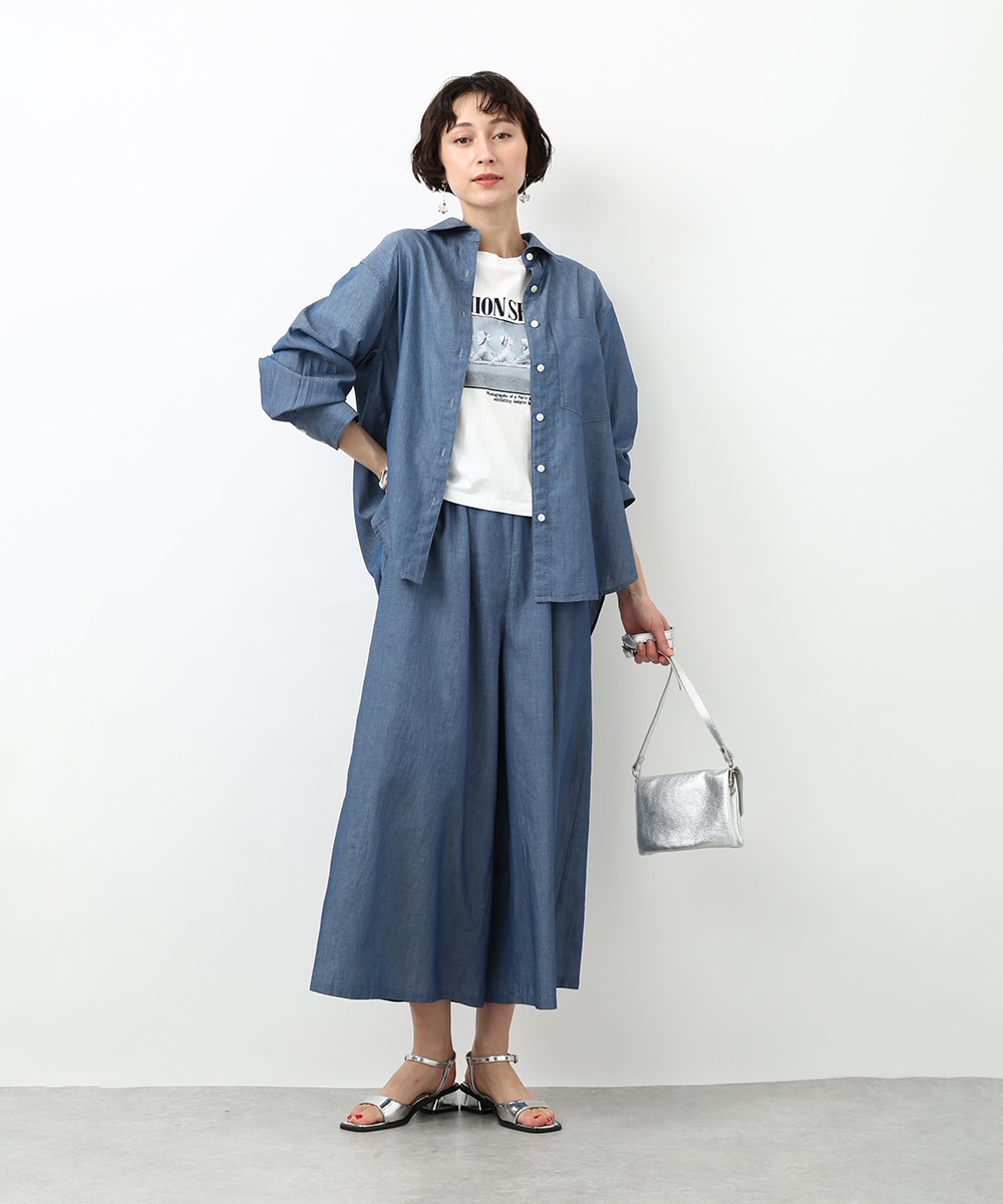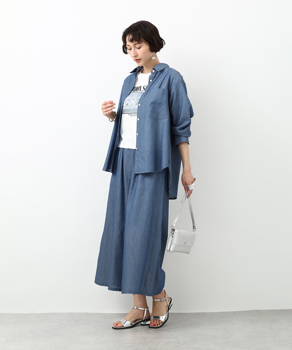 人気のシアーデニム素材を使用したシャツ。デニムならではの風合いを残しつつ、軽やかに着られるのが魅力です。ほどよくゆとりのあるシルエットでリラックス感があり、さらっと羽織るだけで軽さのある印象に仕上がるのもポイント。同素材のボトムスと合わせたセットアップスタイルもおすすめです。季節の変わり目にも重宝する1枚です。