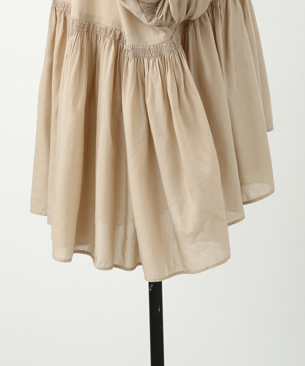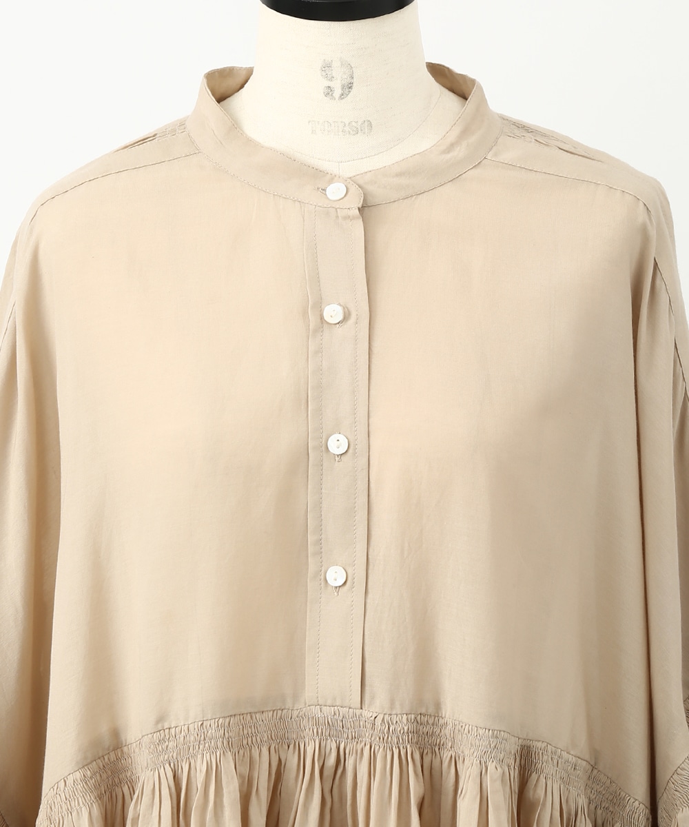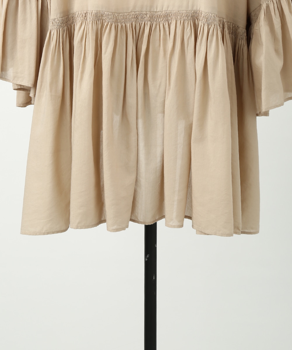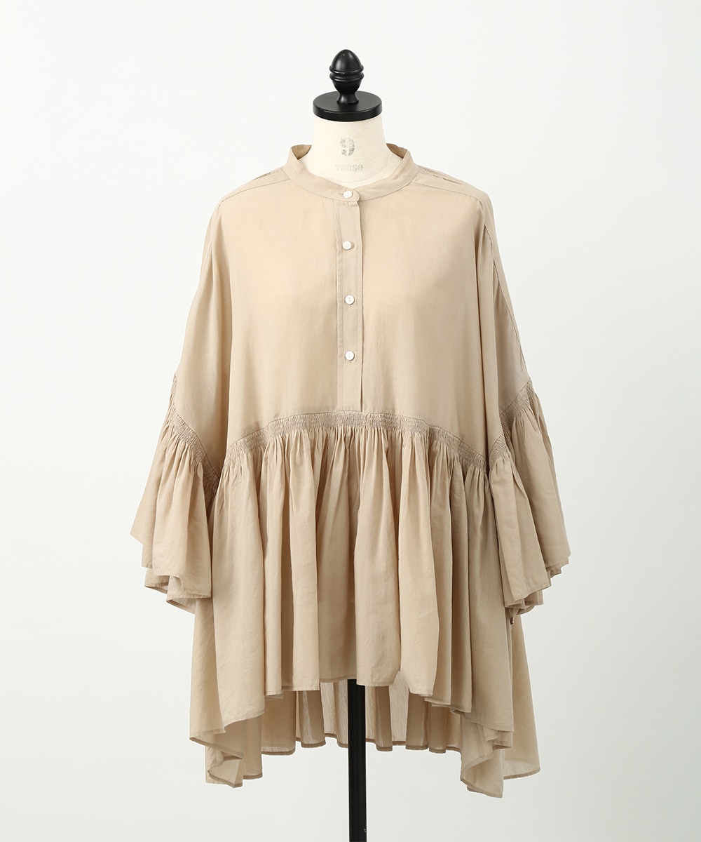 贅沢にあしらったギャザーと、やわらかなコットン素材が魅力のブラウス。通気性のよい軽やかな着心地で、暑い季節にも取り入れやすい仕上がりです。発色のきれいなカラーがスタイリングのアクセントになり、白系のパンツを合わせて明るいトーンでまとめた着こなしもおすすめです。ナチュラルな雰囲気で季節感を楽しめる1着です。