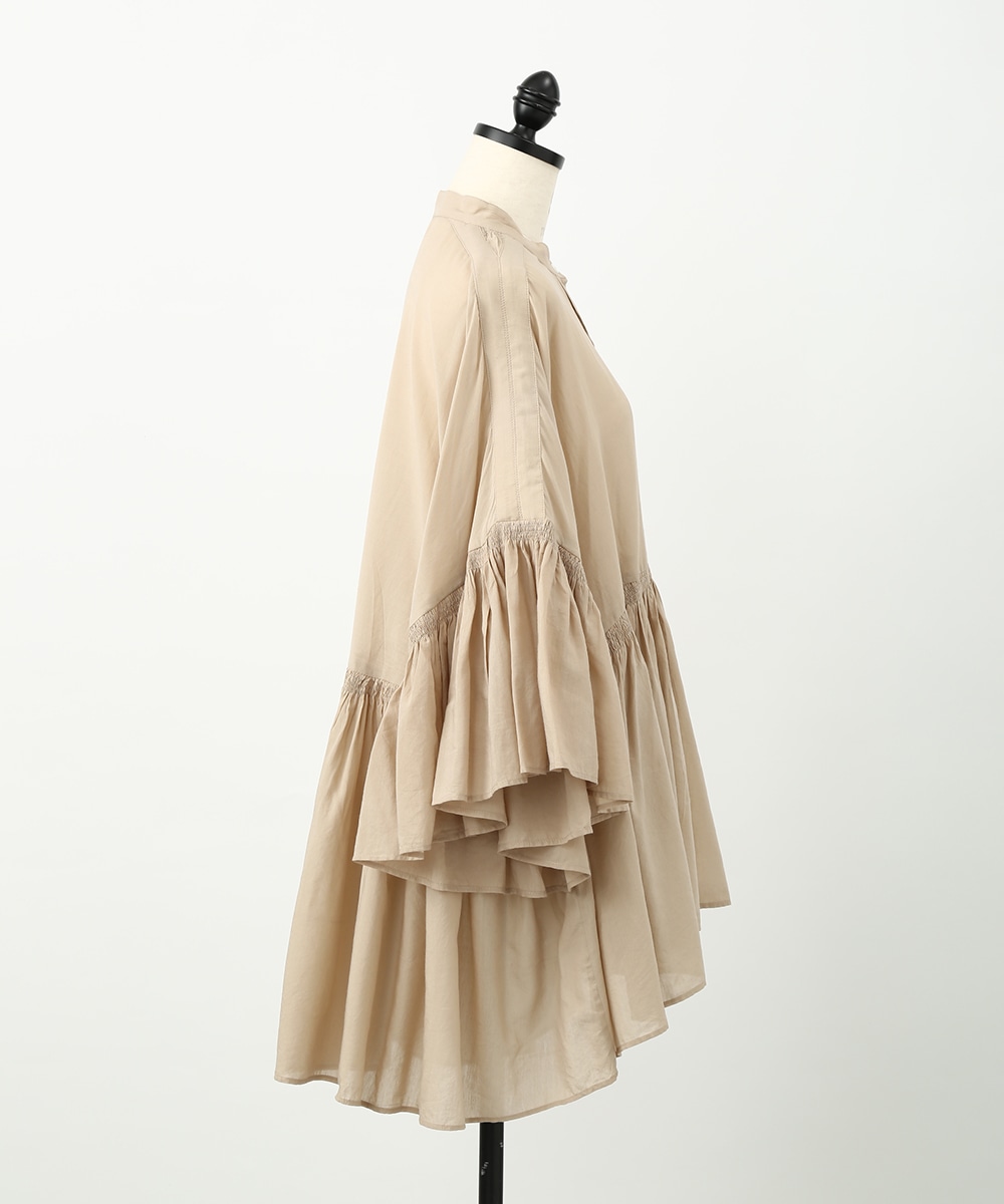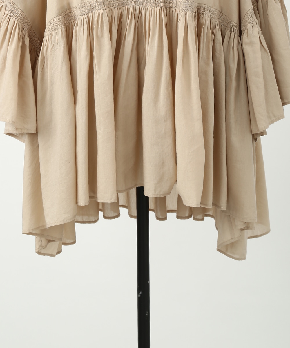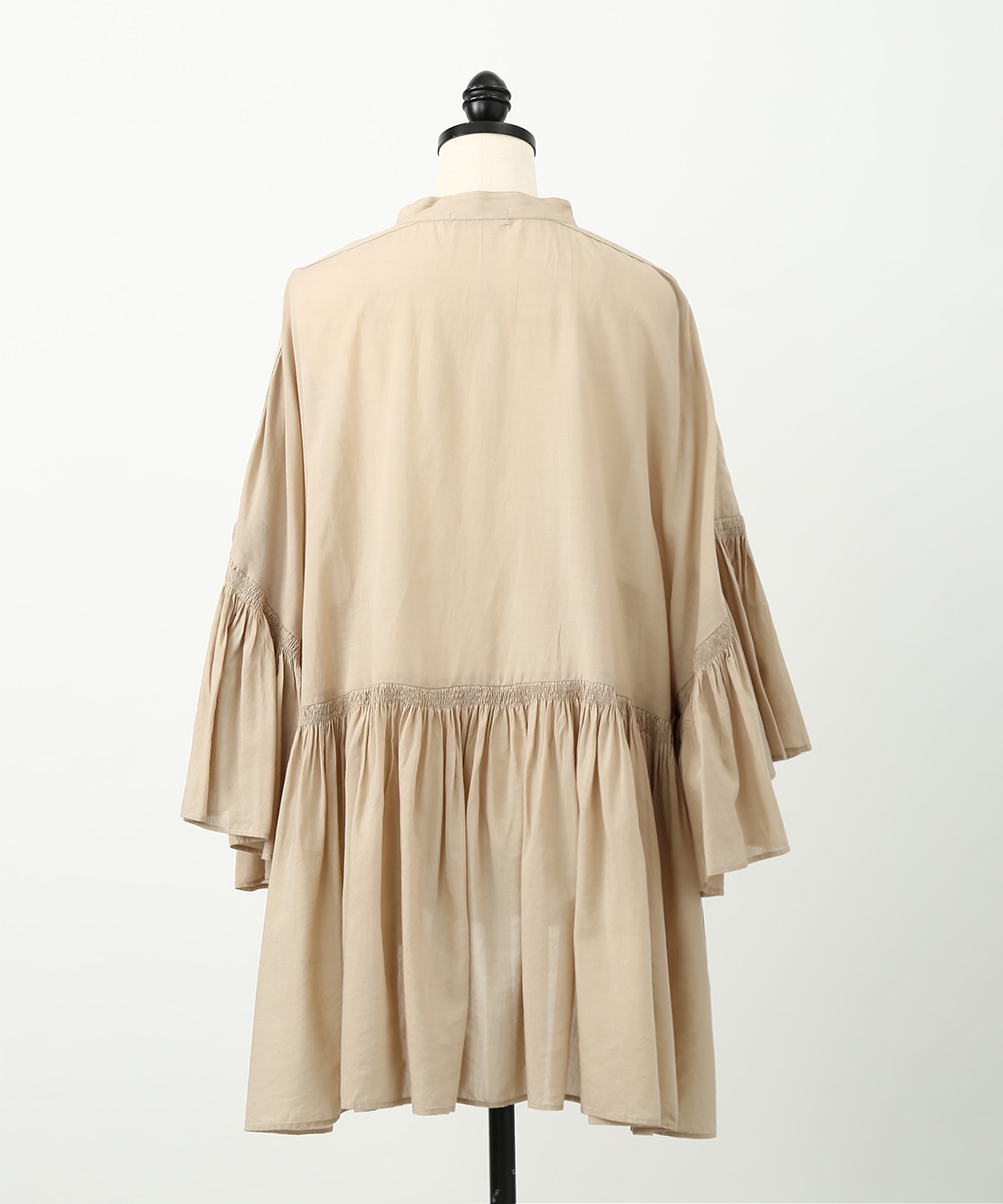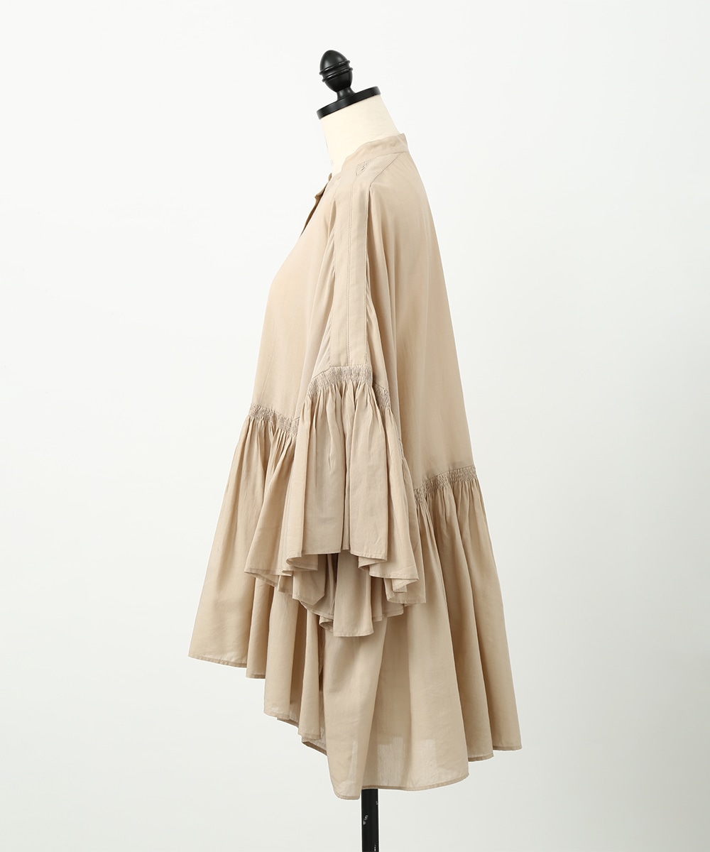 贅沢にあしらったギャザーと、やわらかなコットン素材が魅力のブラウス。通気性のよい軽やかな着心地で、暑い季節にも取り入れやすい仕上がりです。発色のきれいなカラーがスタイリングのアクセントになり、白系のパンツを合わせて明るいトーンでまとめた着こなしもおすすめです。ナチュラルな雰囲気で季節感を楽しめる1着です。