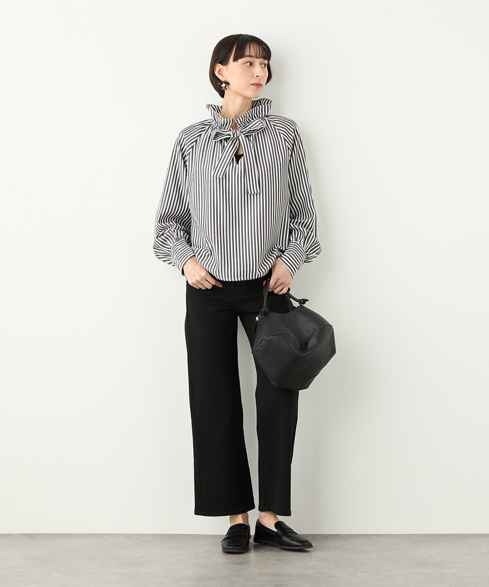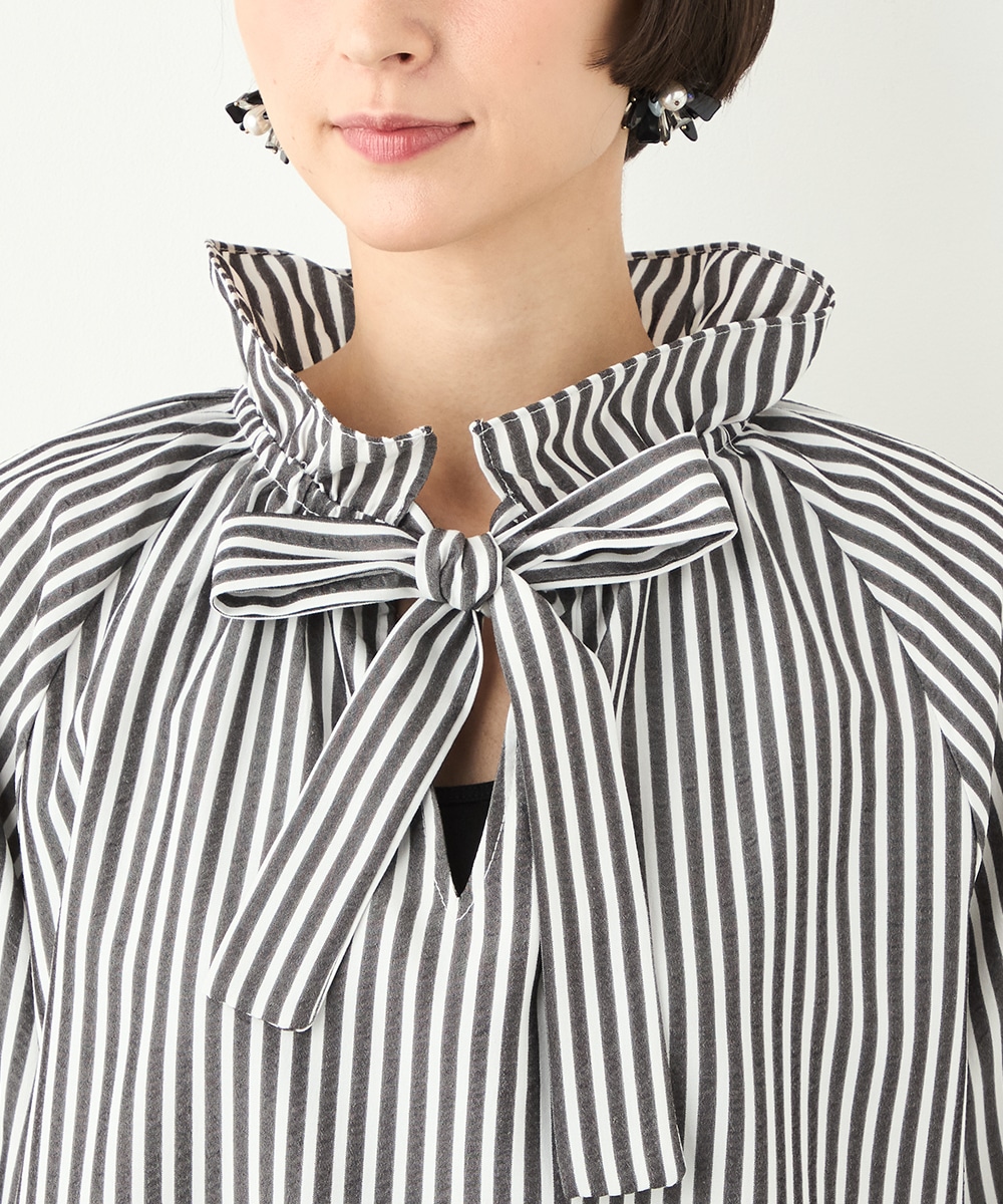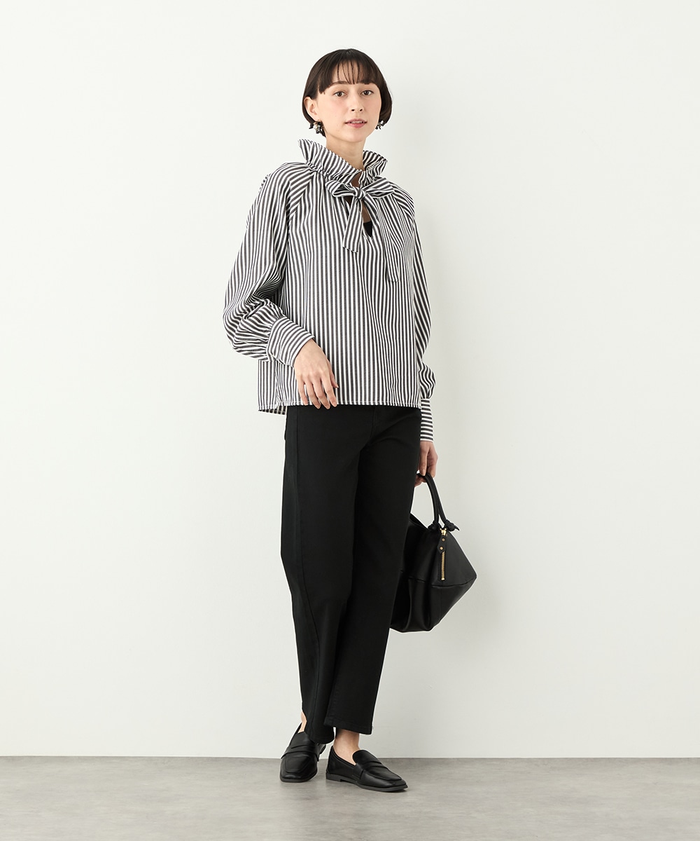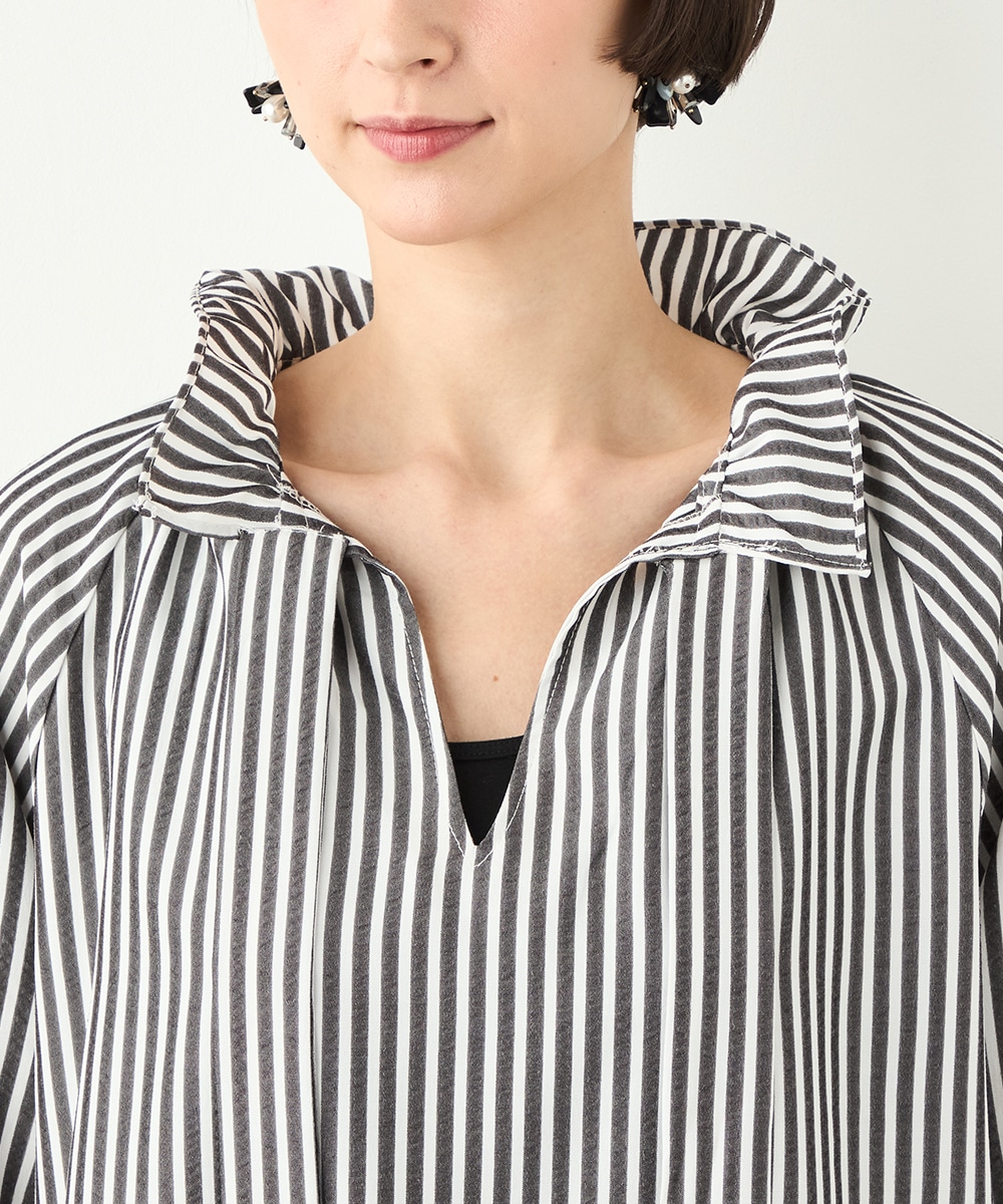 カラーリングと柄が甘さを抑え、大人可愛い印象に着こなせます。シルエットはゆとりがあり、トレンドのリラックスムードを演出。長めにデザインした袖口の切り替えはクラシカル感をプラスします。コットン素材のほどよいラフさはデイリーカジュアルにもぴったりです。