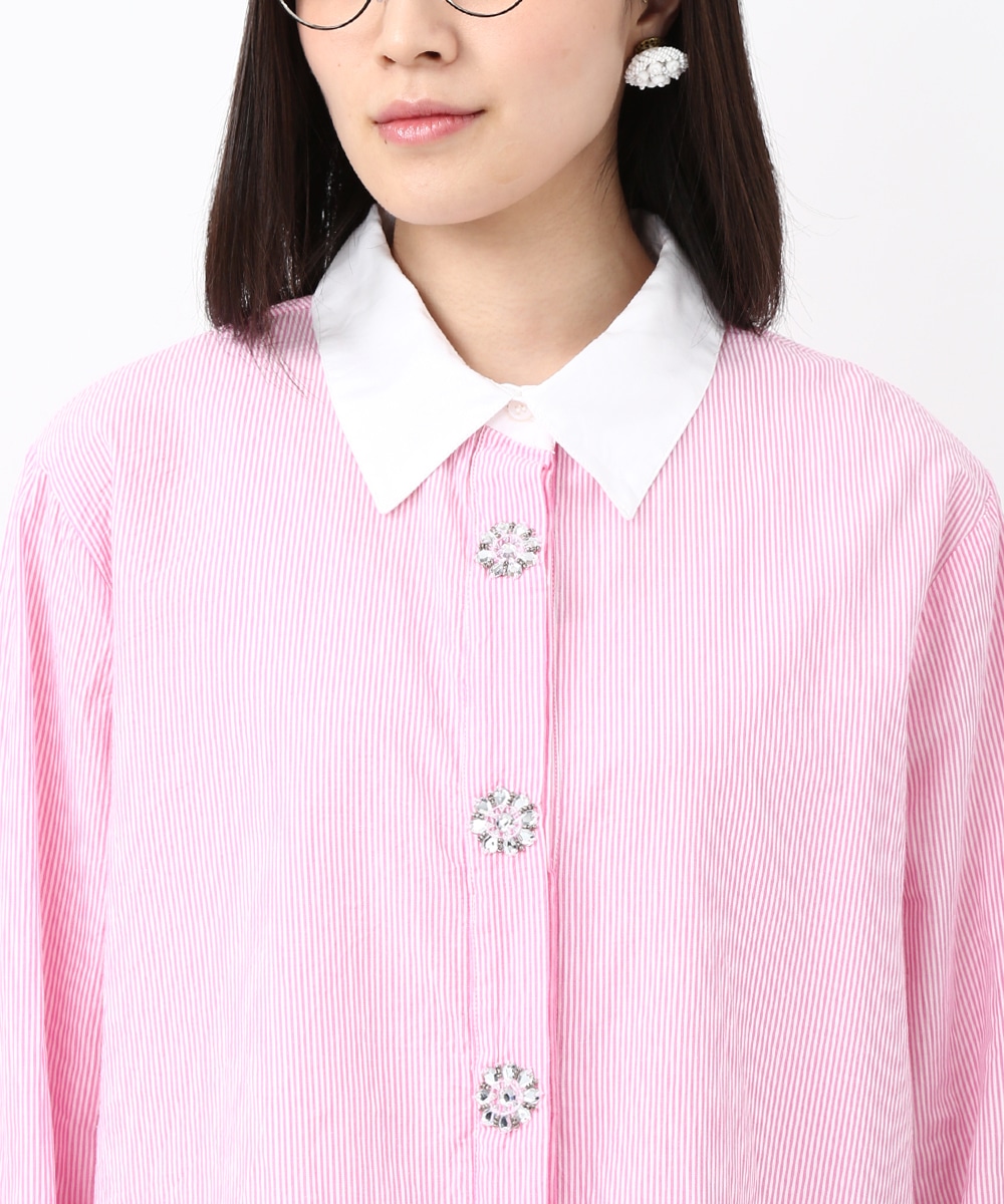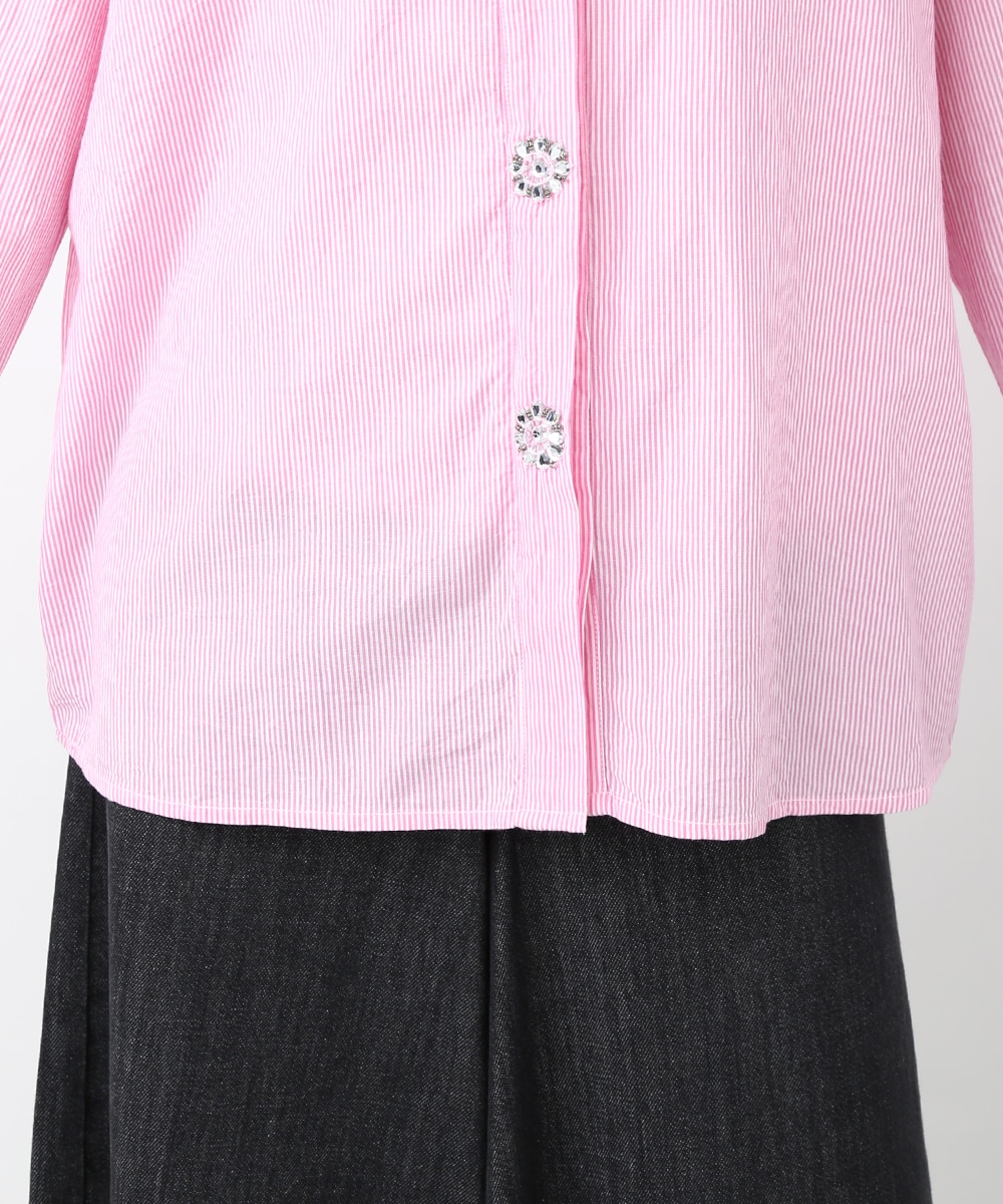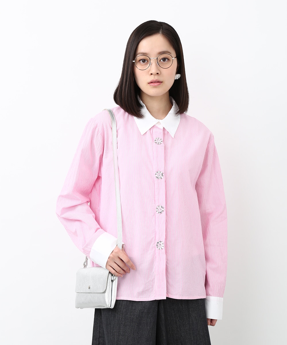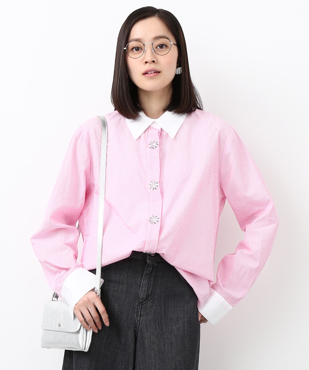 ピンクのストライプにビジュー釦をあしらい、配色デザインのシャツをフェミニンな印象へアップデートさせた1着。程よくゆとりのあるシルエットで、きちんと感がありながらもかしこまりすぎず着られるのもポイント。カジュアルなボトムスと合わせてほどよく抜け感をプラスし、甘さを抑えたバランスの良い着こなしもおすすめです。