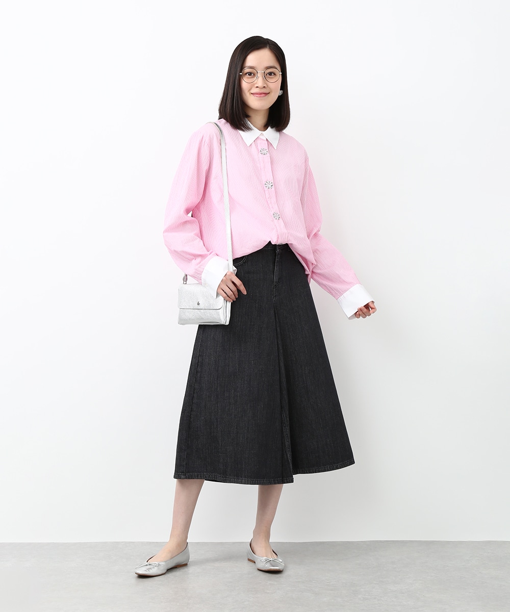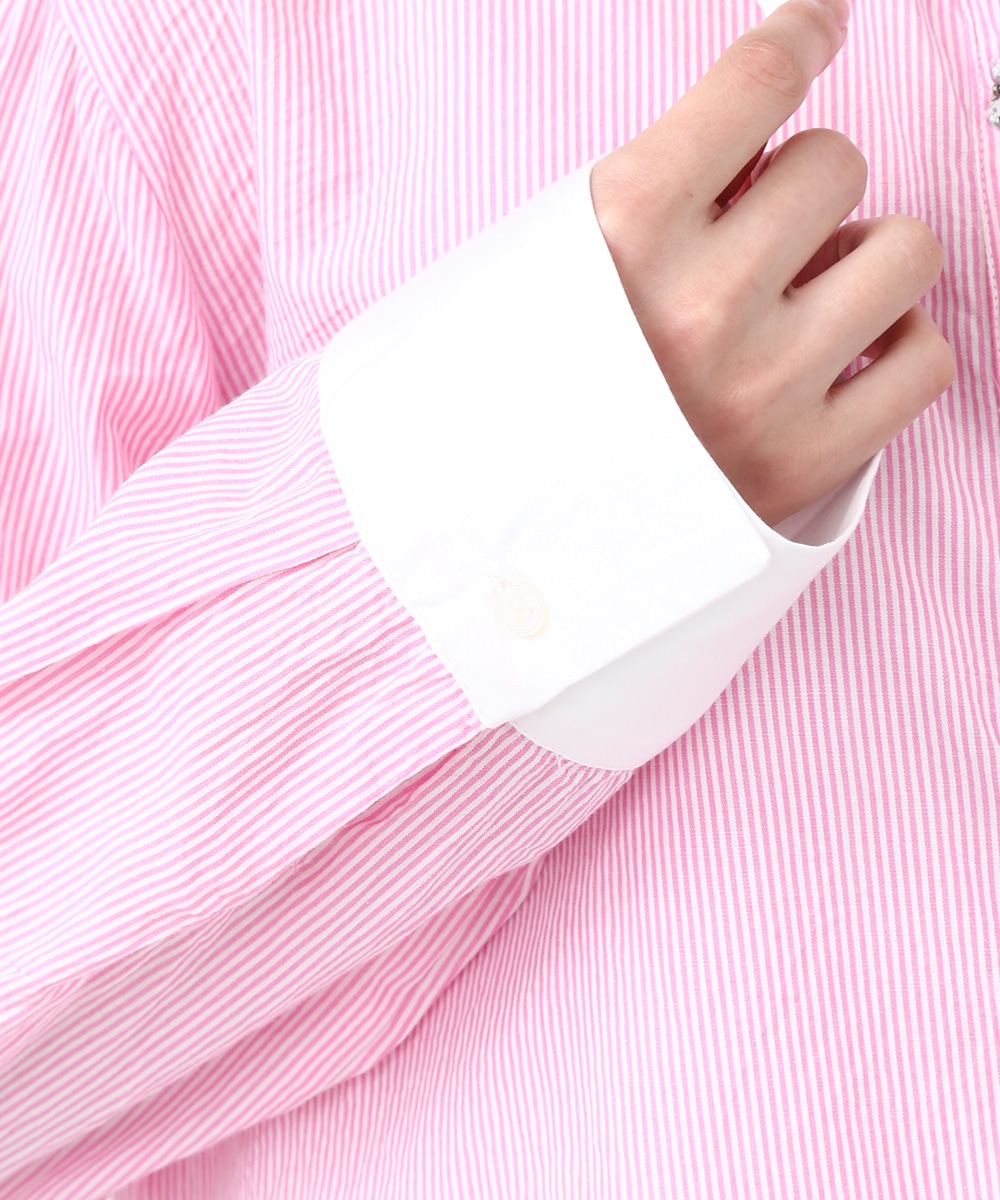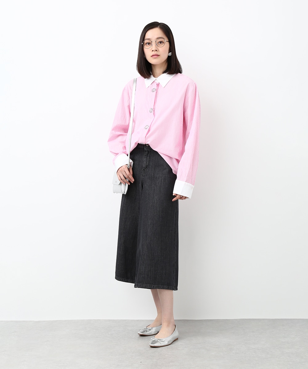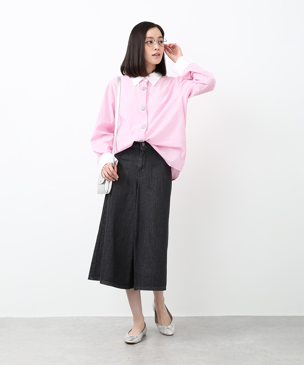 ピンクのストライプにビジュー釦をあしらい、配色デザインのシャツをフェミニンな印象へアップデートさせた1着。程よくゆとりのあるシルエットで、きちんと感がありながらもかしこまりすぎず着られるのもポイント。カジュアルなボトムスと合わせてほどよく抜け感をプラスし、甘さを抑えたバランスの良い着こなしもおすすめです。