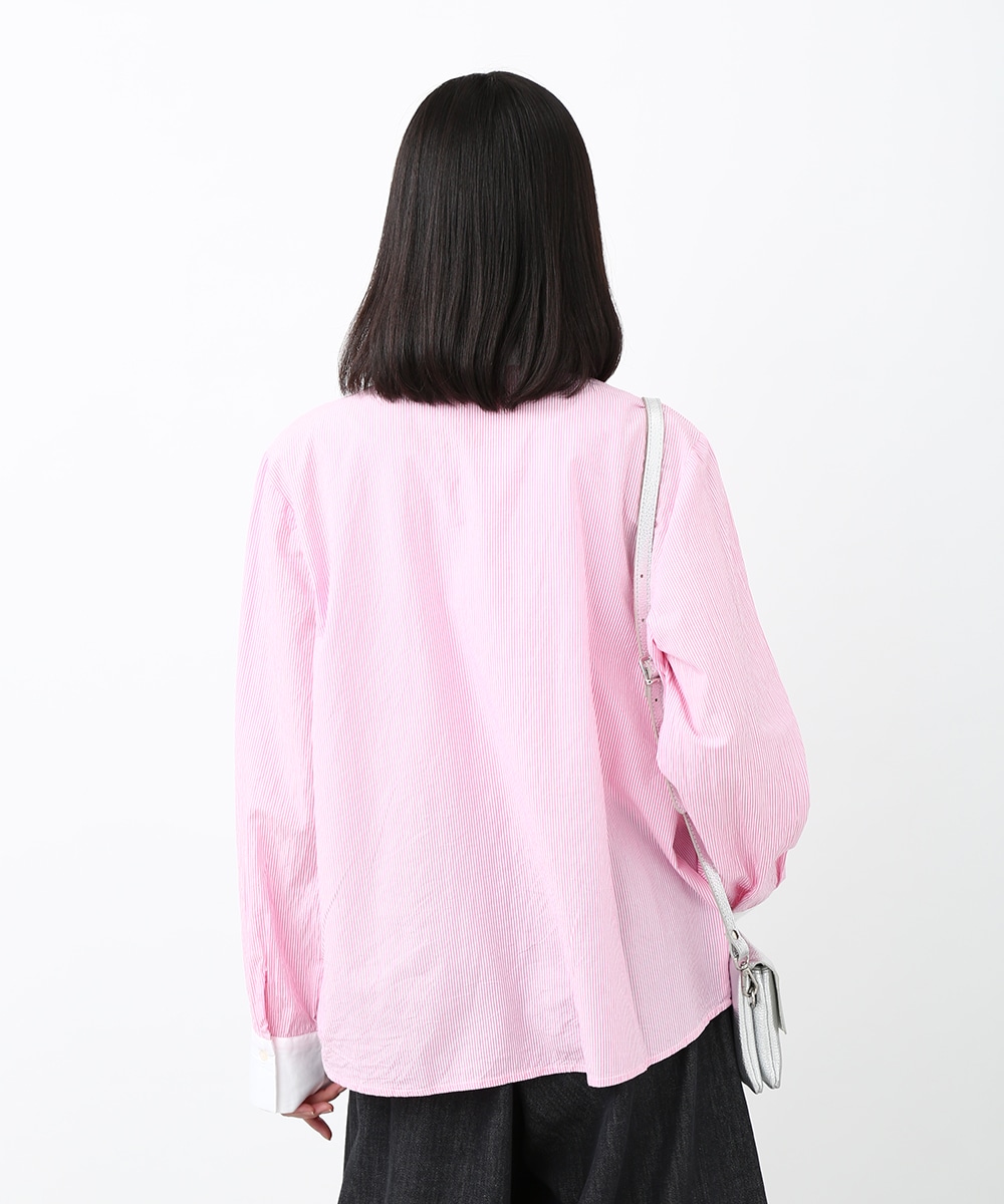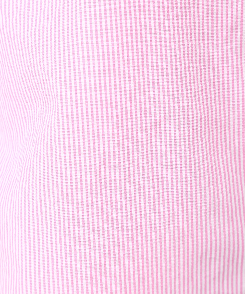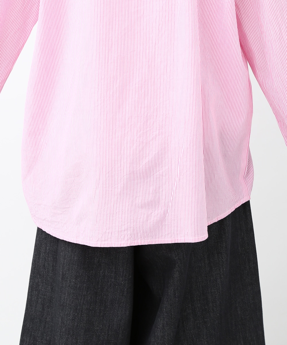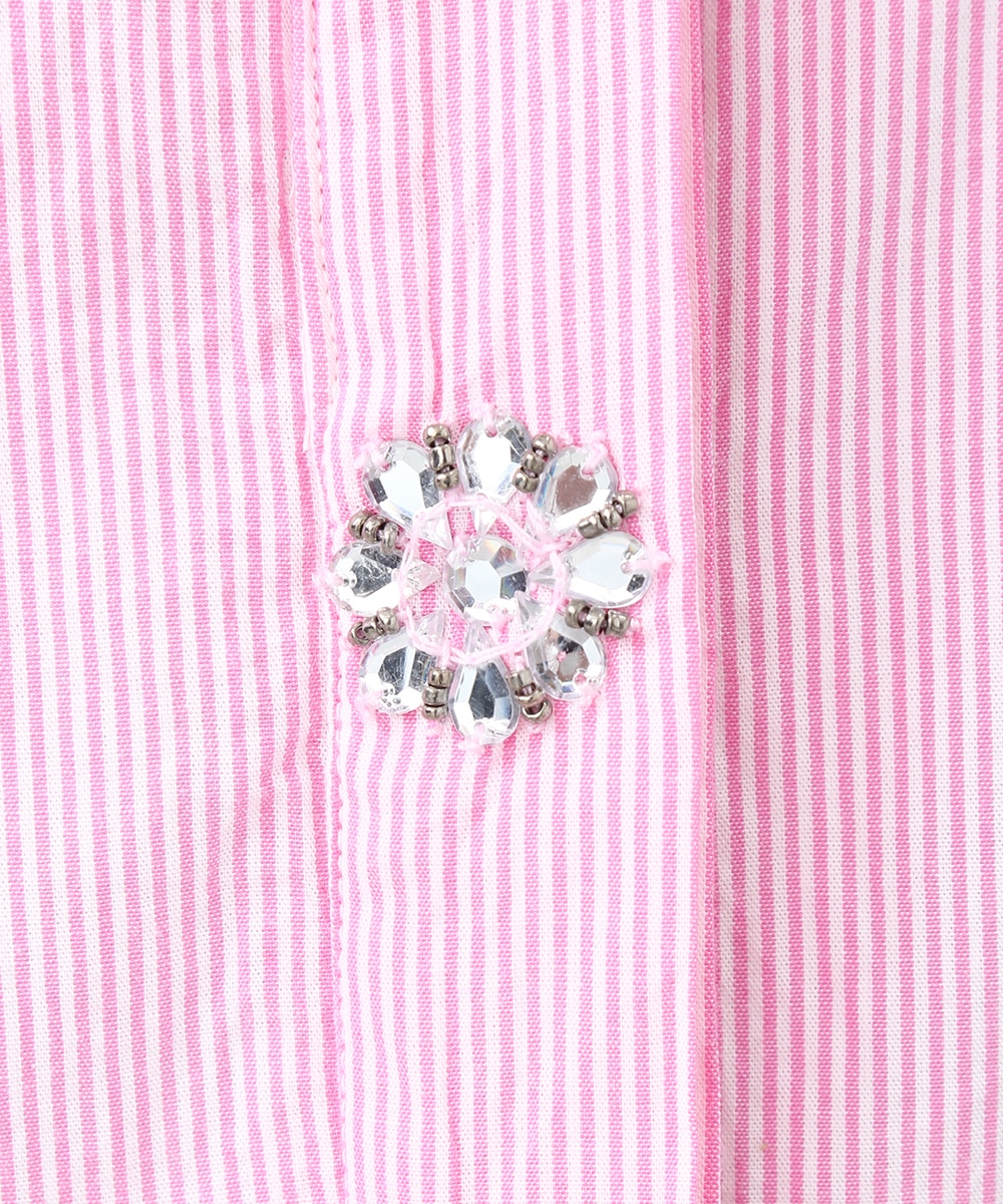 ピンクのストライプにビジュー釦をあしらい、配色デザインのシャツをフェミニンな印象へアップデートさせた1着。程よくゆとりのあるシルエットで、きちんと感がありながらもかしこまりすぎず着られるのもポイント。カジュアルなボトムスと合わせてほどよく抜け感をプラスし、甘さを抑えたバランスの良い着こなしもおすすめです。