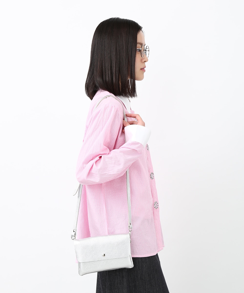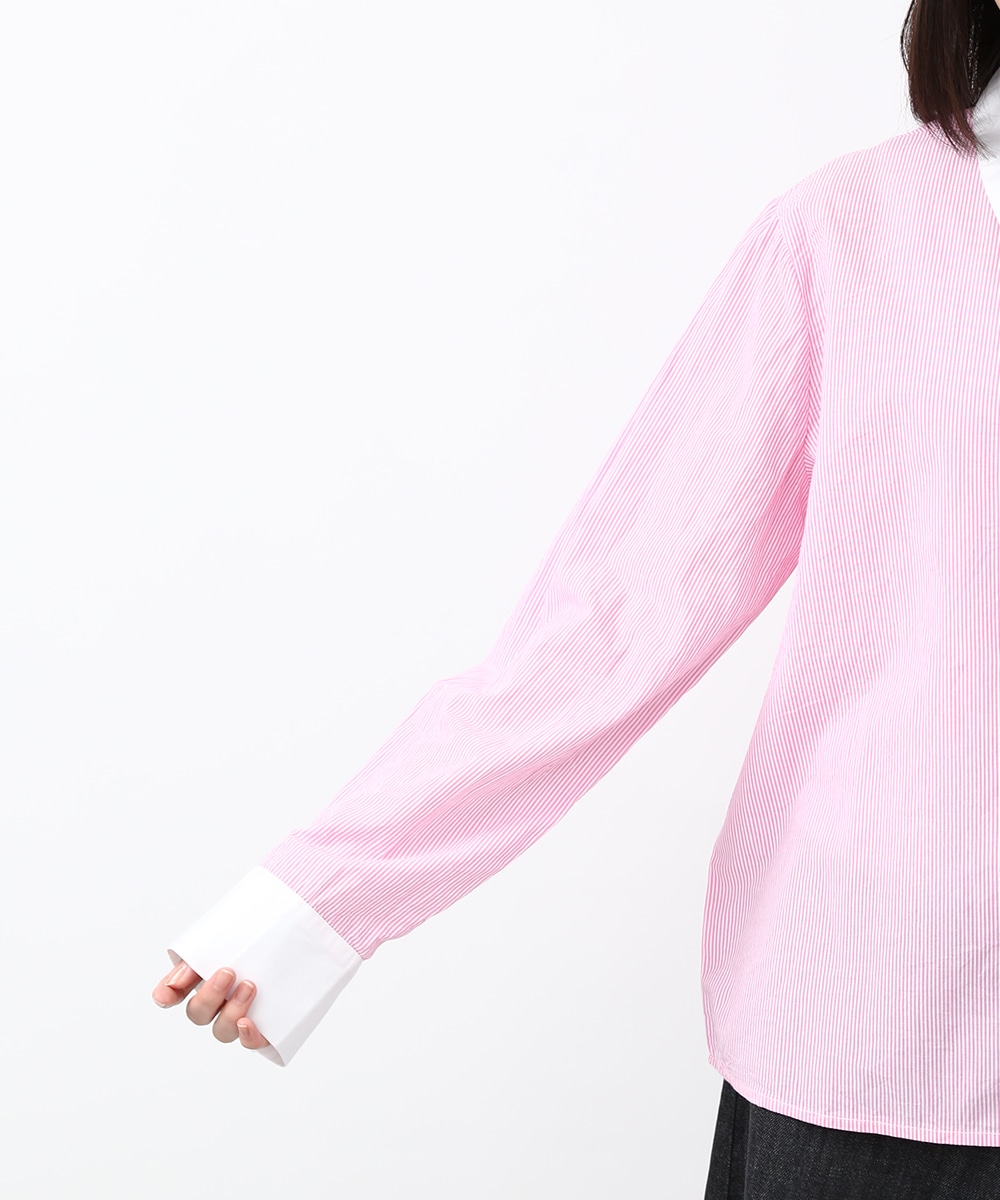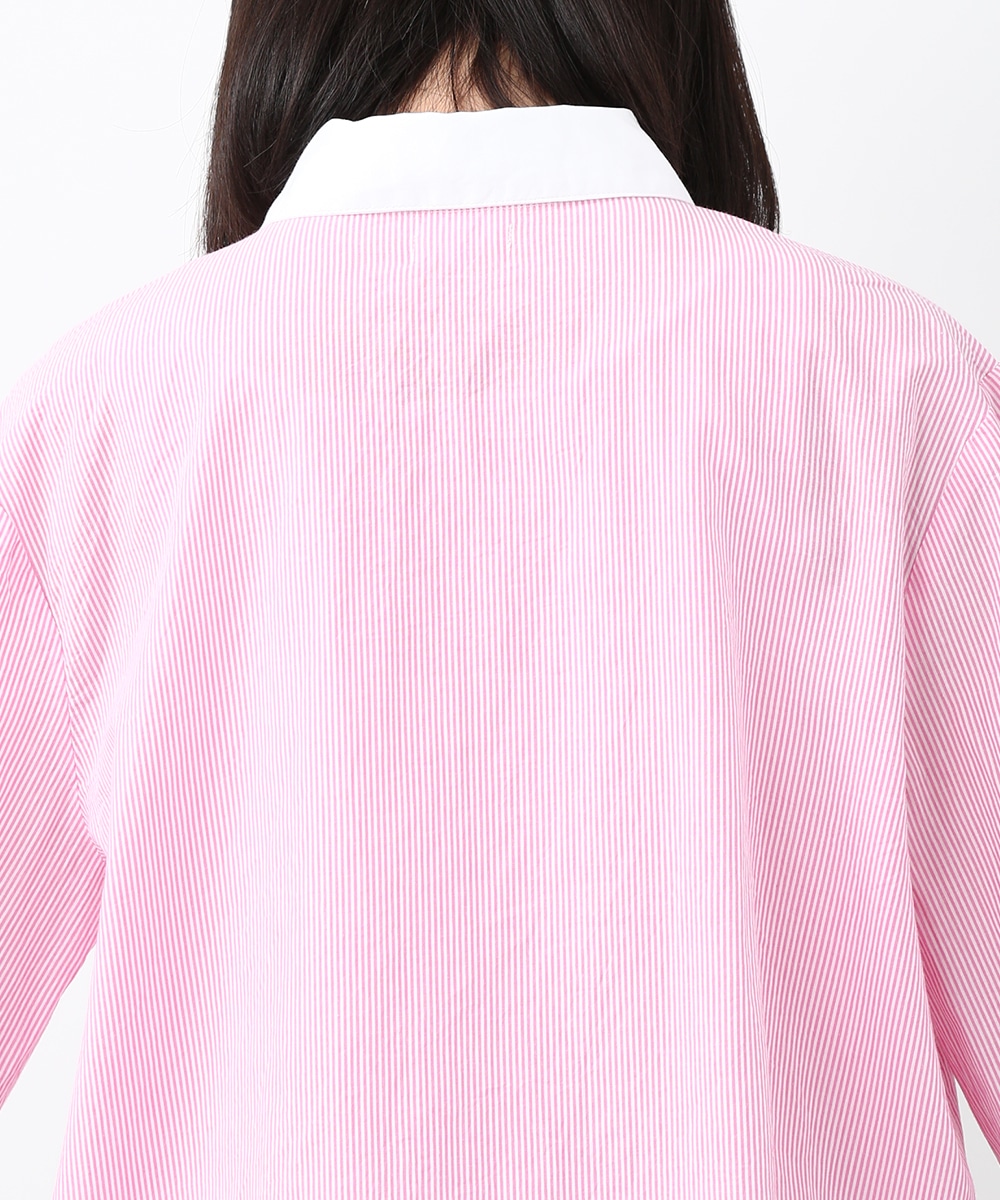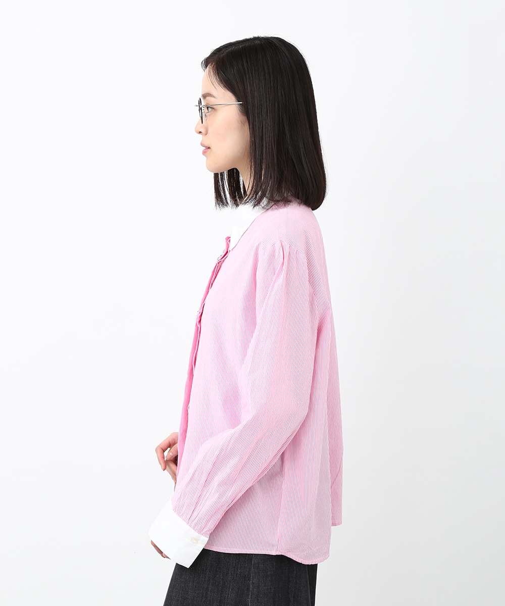 ピンクのストライプにビジュー釦をあしらい、配色デザインのシャツをフェミニンな印象へアップデートさせた1着。程よくゆとりのあるシルエットで、きちんと感がありながらもかしこまりすぎず着られるのもポイント。カジュアルなボトムスと合わせてほどよく抜け感をプラスし、甘さを抑えたバランスの良い着こなしもおすすめです。