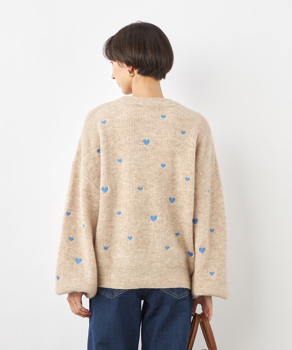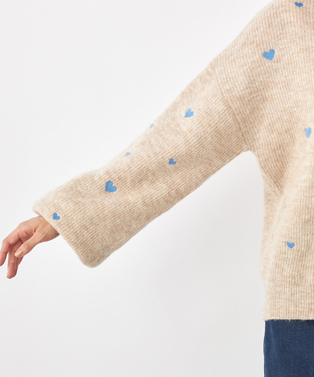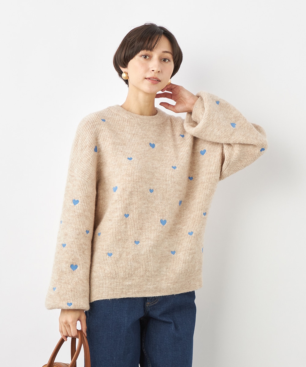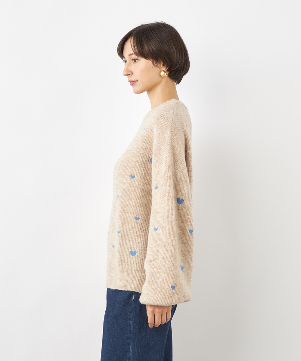 大小のハートをバランス良くミックスしています。柄の配置にランダム感があるのもデザインのポイントです。ドロップショルダーのゆったりとしたシルエットや袖の適度なボリュームがトレンドライクな印象。サイドにはゴールドカラーのハートチャームをあしらっています。