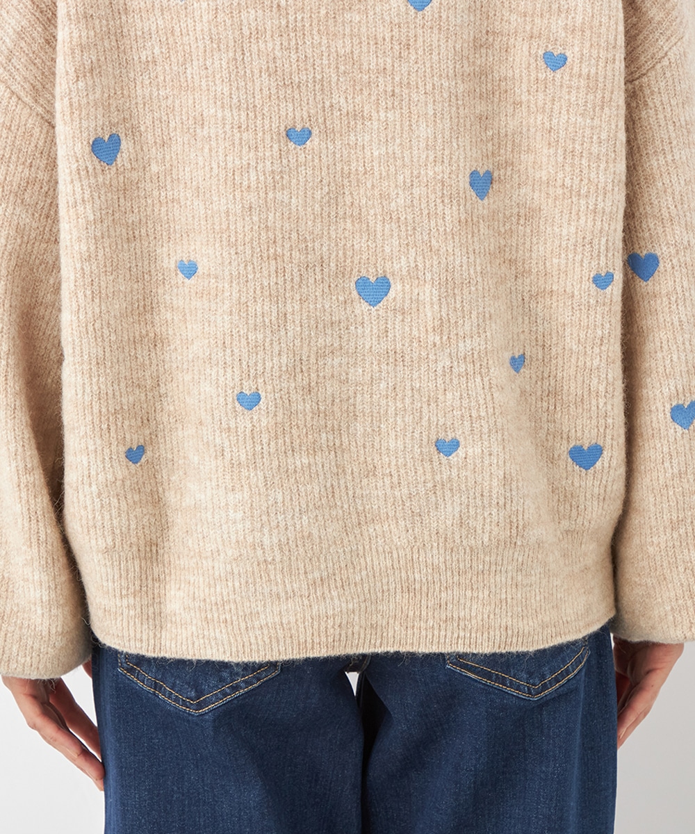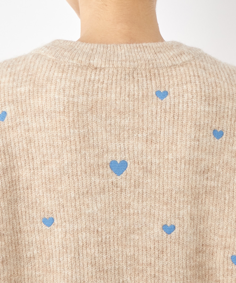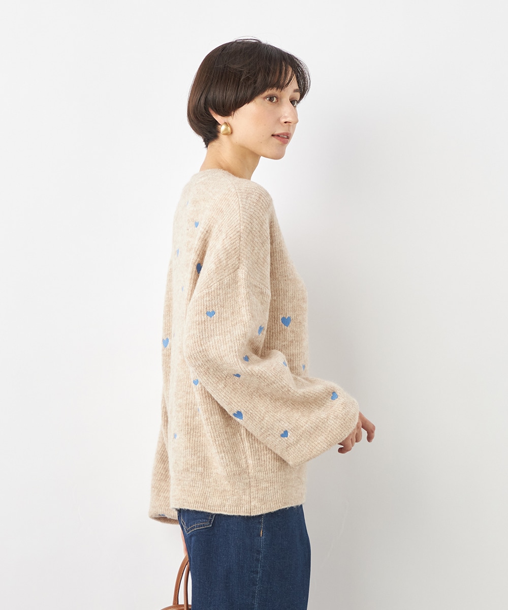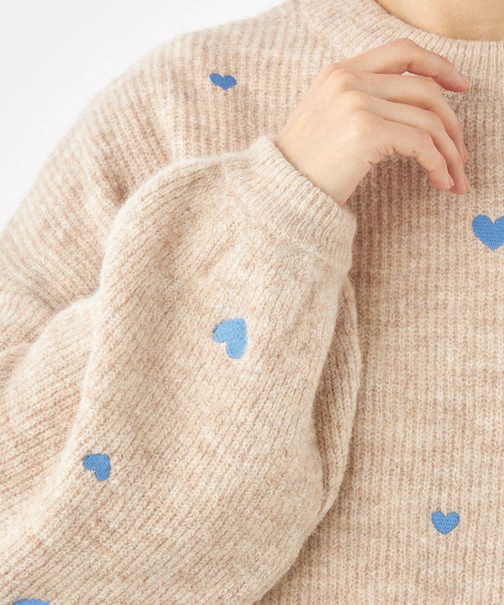 大小のハートをバランス良くミックスしています。柄の配置にランダム感があるのもデザインのポイントです。ドロップショルダーのゆったりとしたシルエットや袖の適度なボリュームがトレンドライクな印象。サイドにはゴールドカラーのハートチャームをあしらっています。