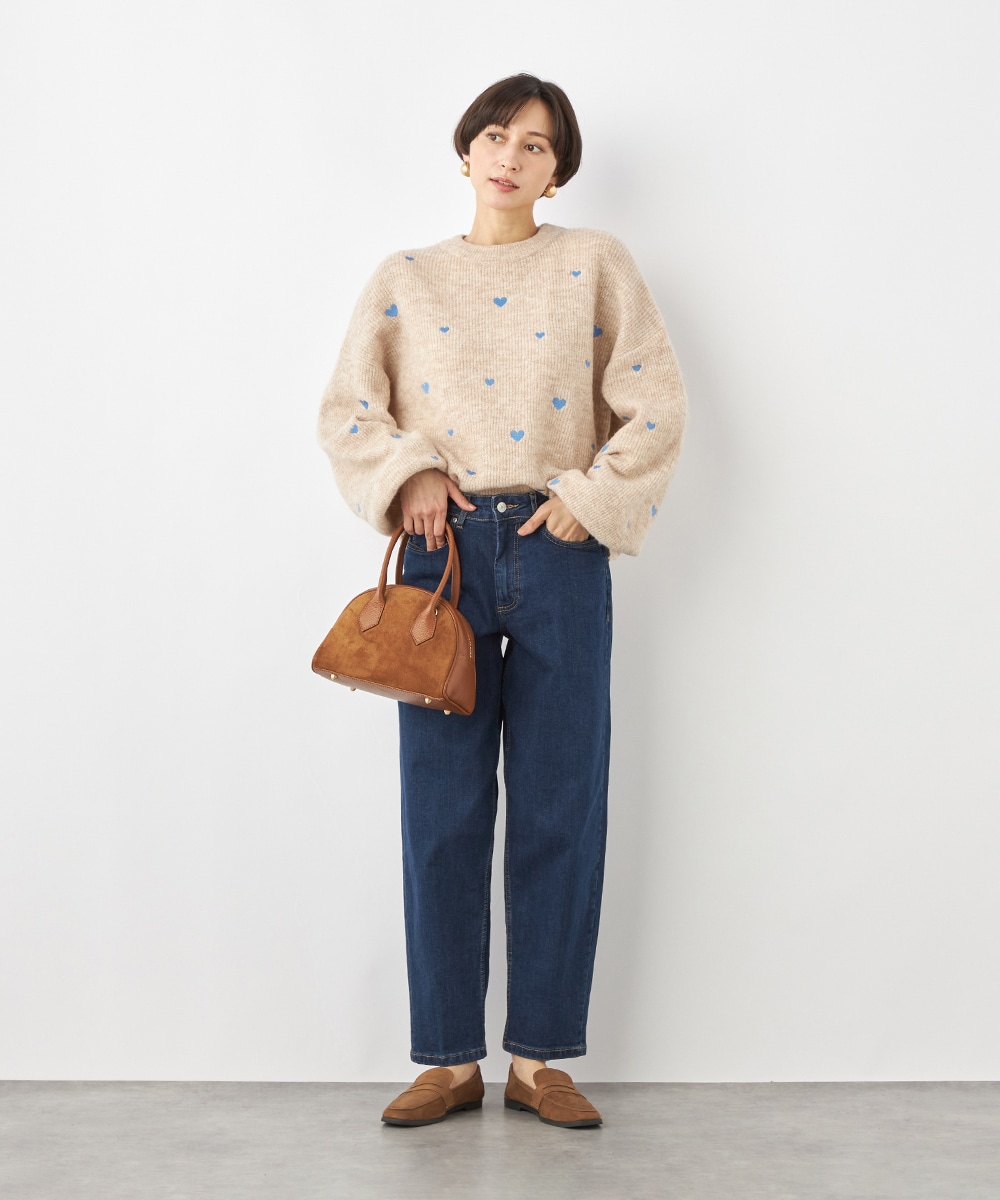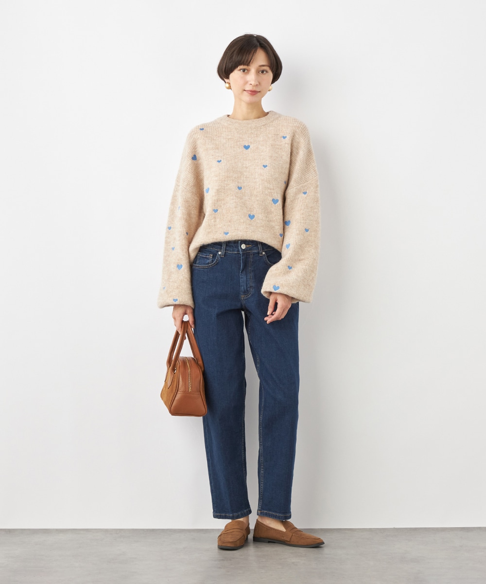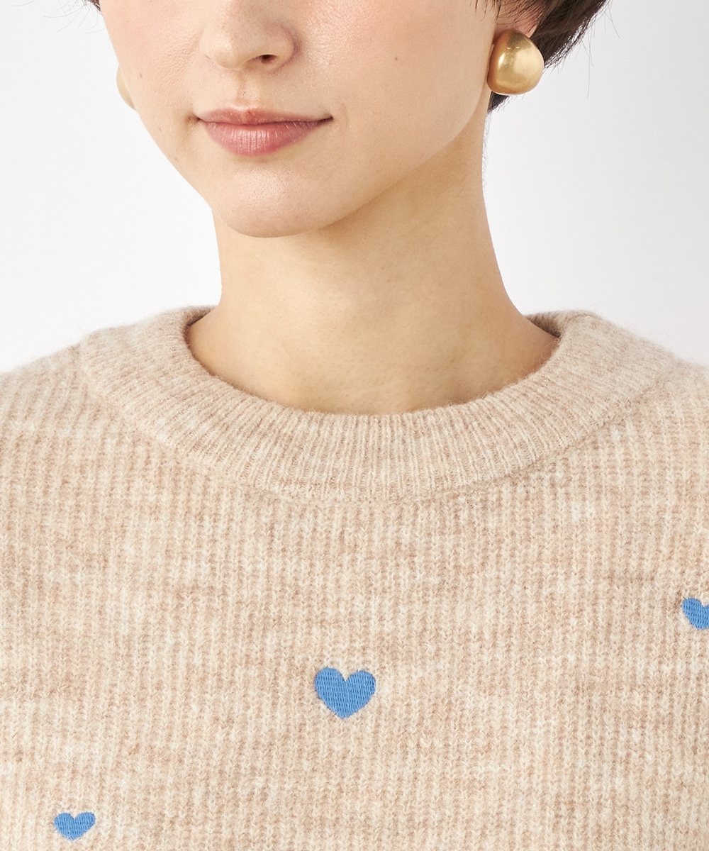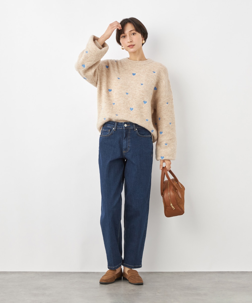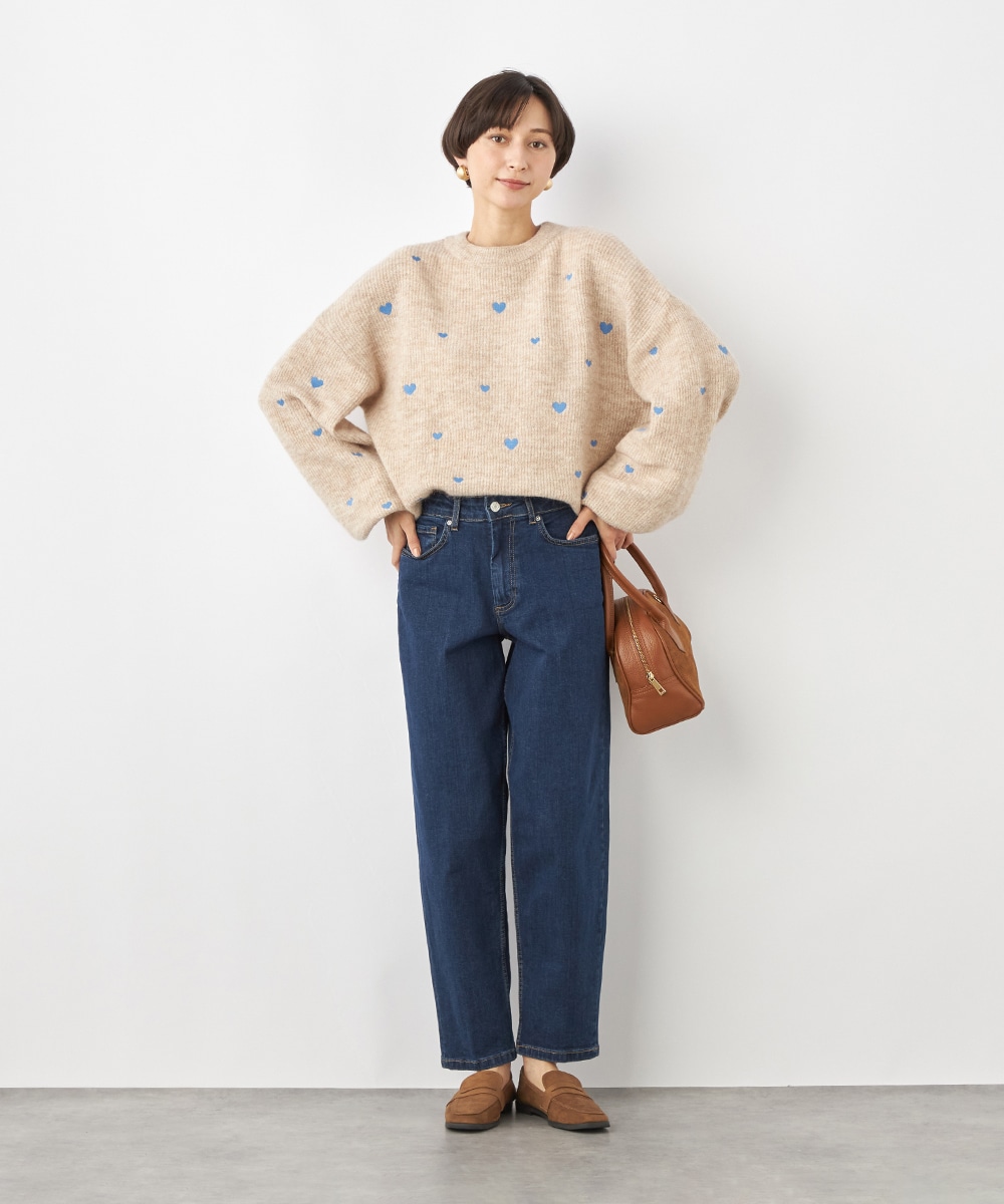 大小のハートをバランス良くミックスしています。柄の配置にランダム感があるのもデザインのポイントです。ドロップショルダーのゆったりとしたシルエットや袖の適度なボリュームがトレンドライクな印象。サイドにはゴールドカラーのハートチャームをあしらっています。