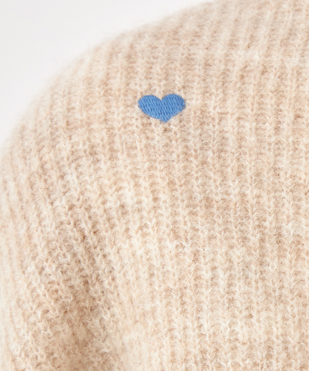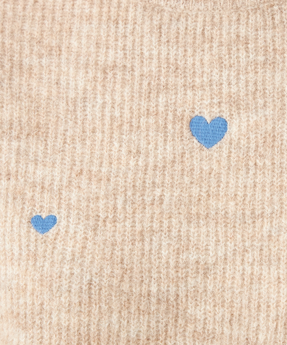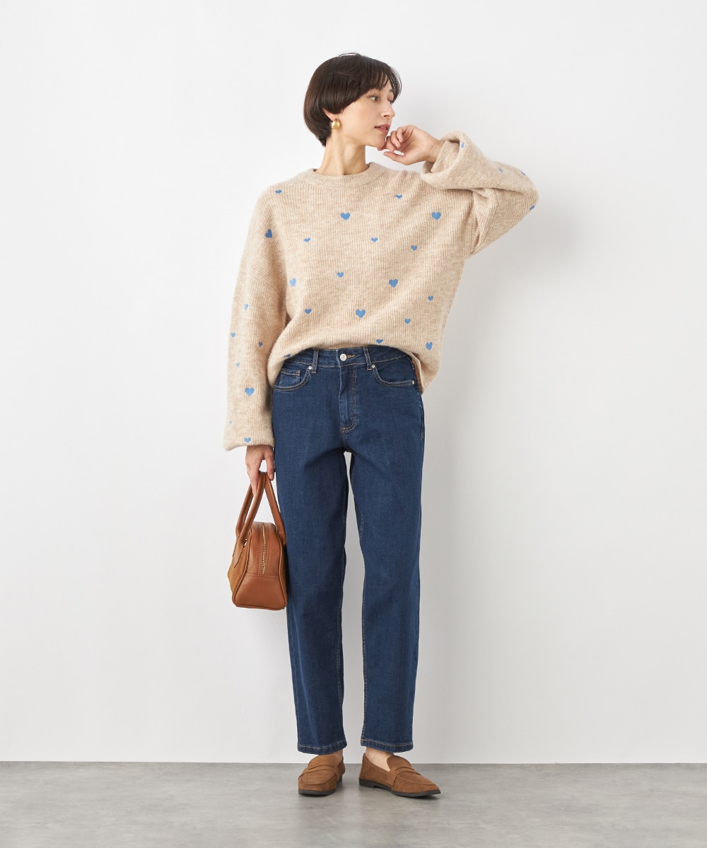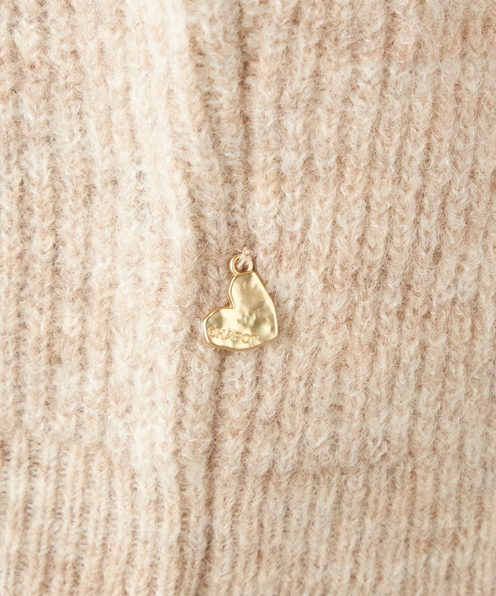 大小のハートをバランス良くミックスしています。柄の配置にランダム感があるのもデザインのポイントです。ドロップショルダーのゆったりとしたシルエットや袖の適度なボリュームがトレンドライクな印象。サイドにはゴールドカラーのハートチャームをあしらっています。