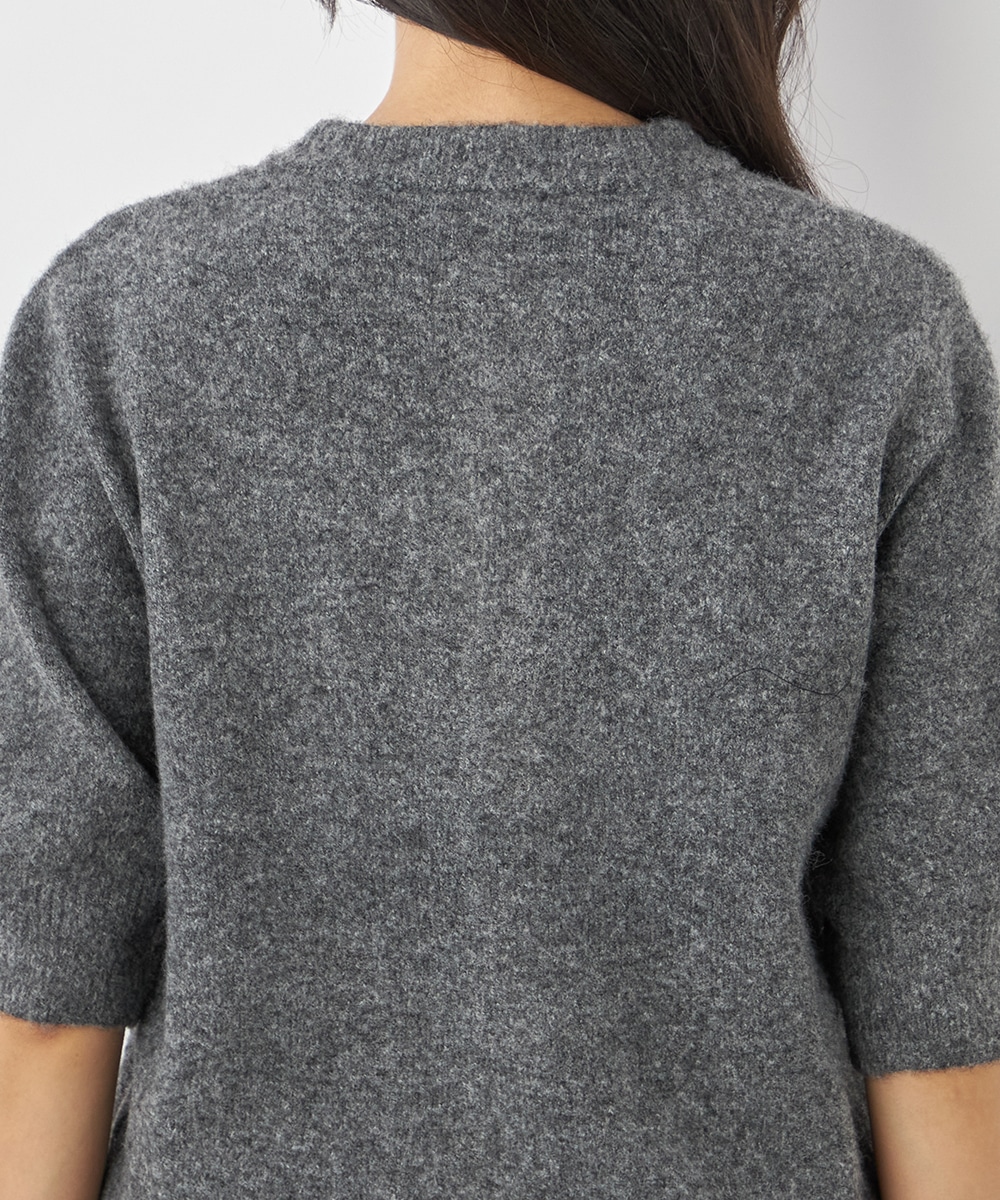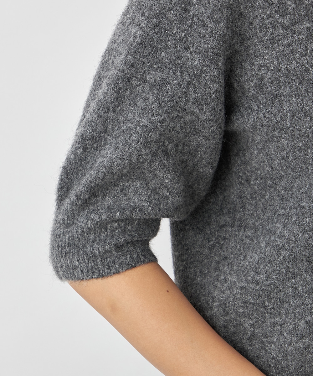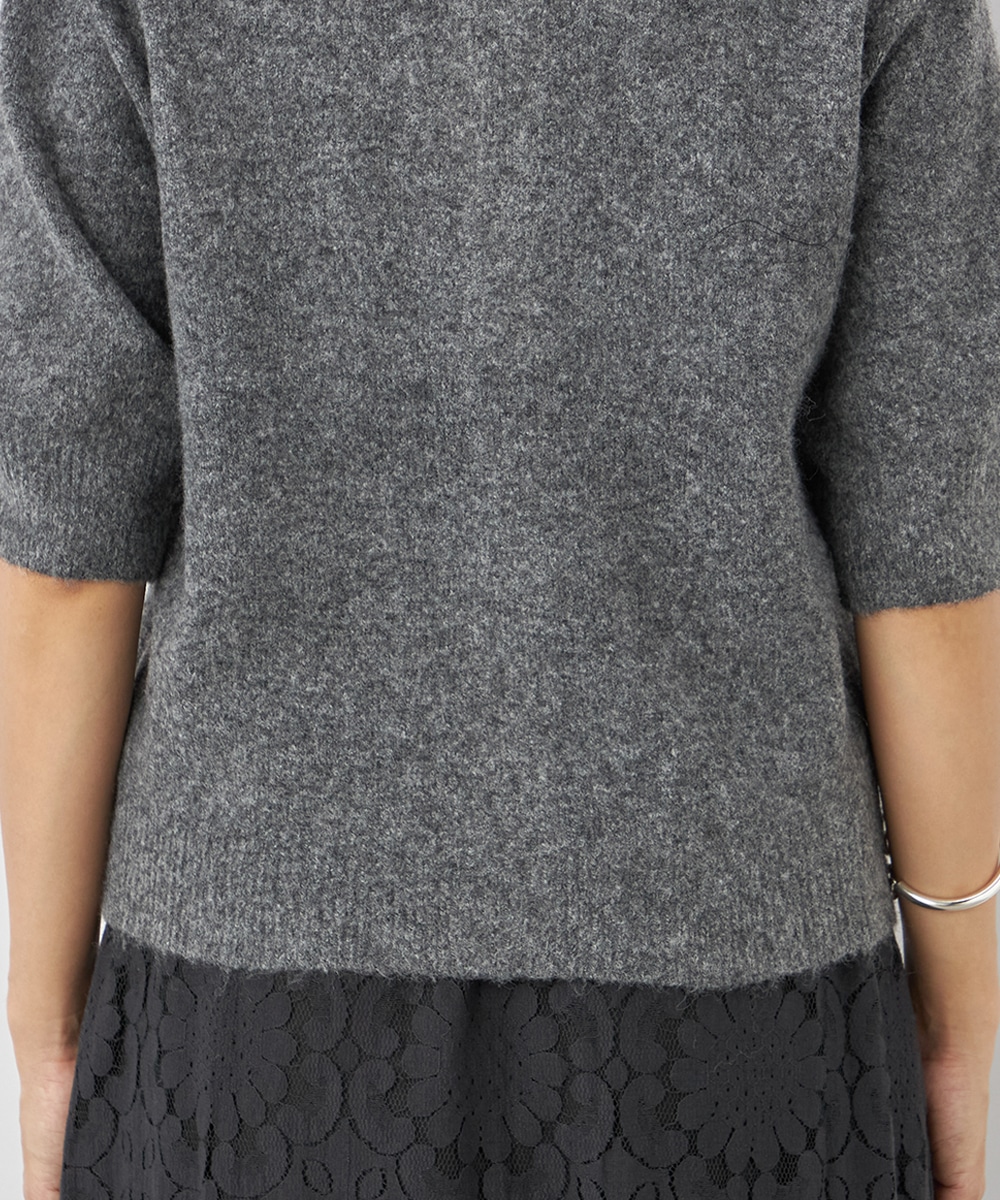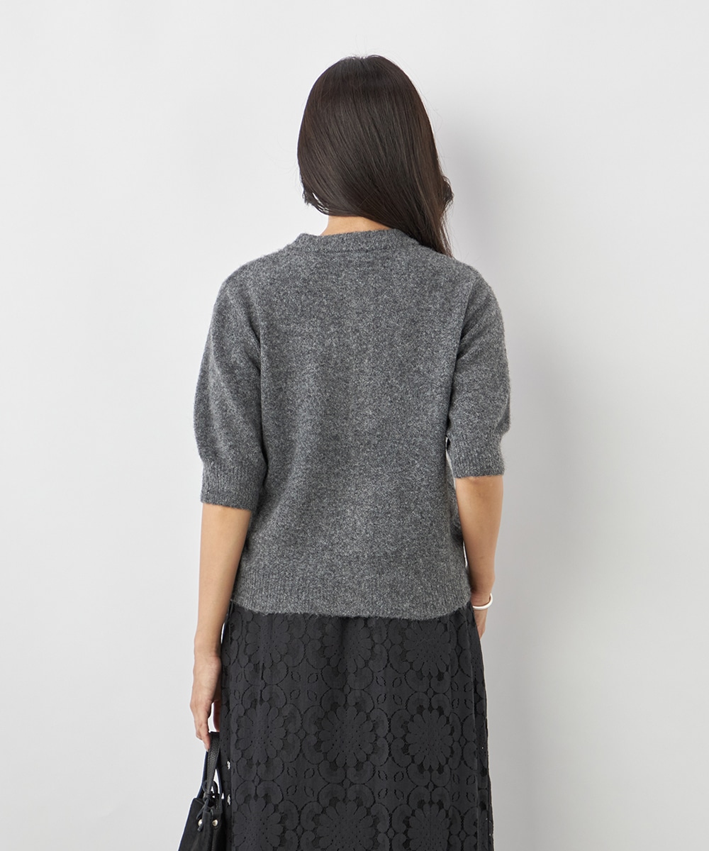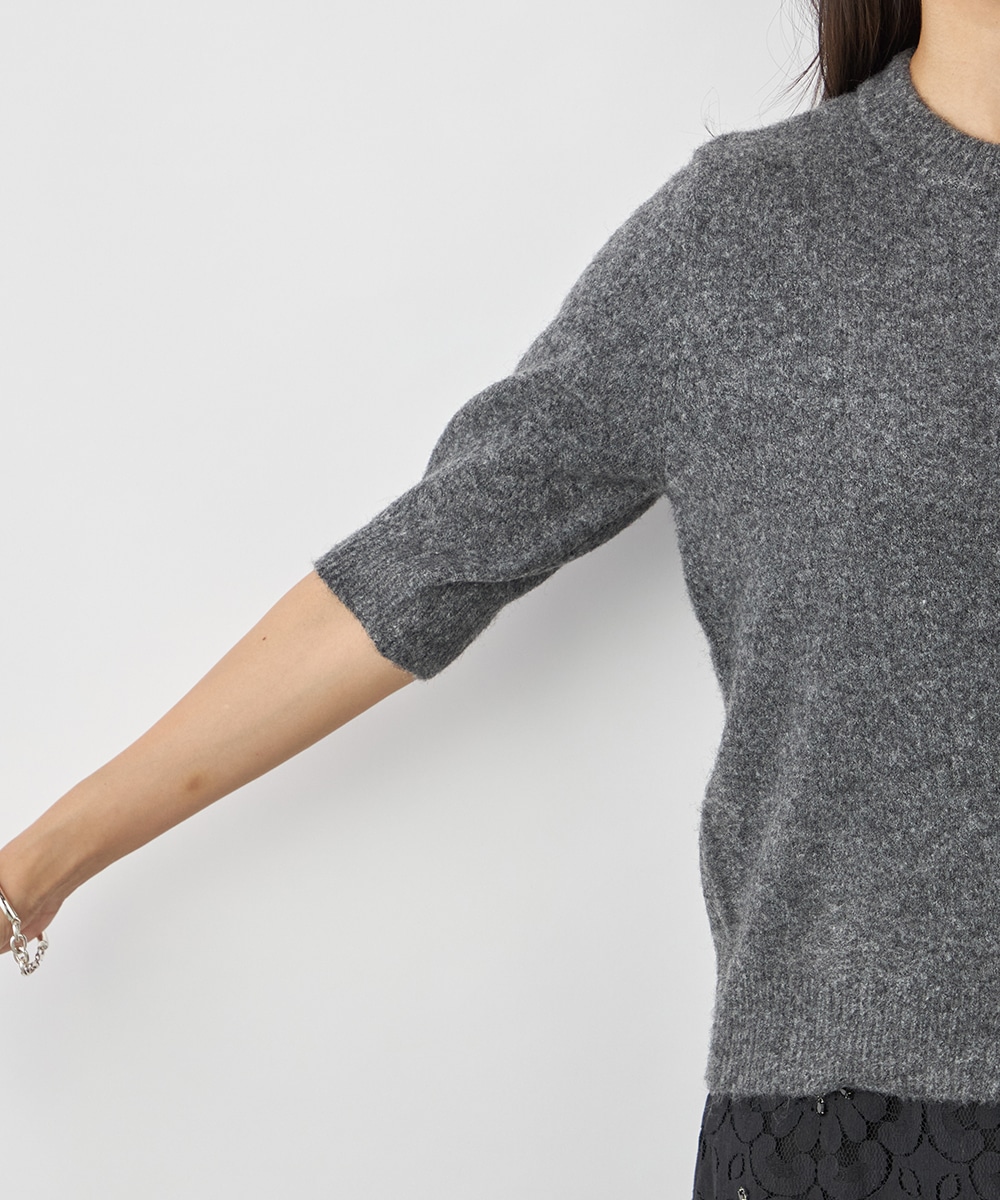 クロップド丈に五分袖でコンパクトにまとまり、すっきりと着こなせます。合わせるボトムスを選ばず、アレンジ力の高さも魅力です。ほどよい毛羽感のある表情が優しくナチュラルな雰囲気をプラスします。肌触りが柔らかくて着心地も良好です。シックなモノトーンカラーでまとめています。