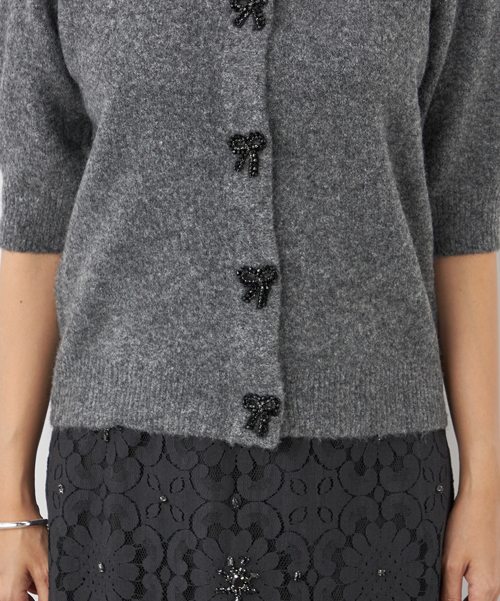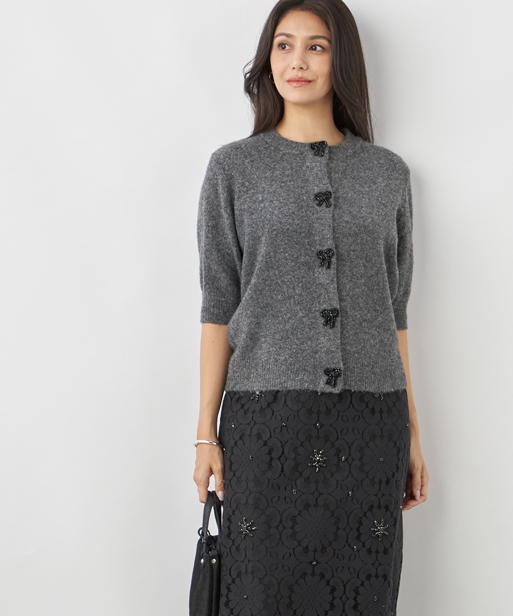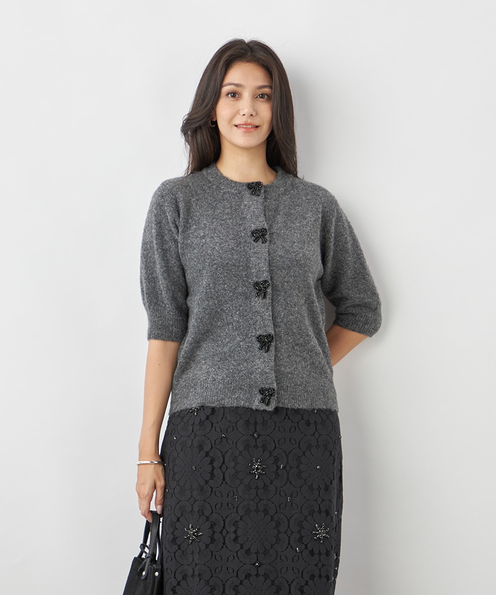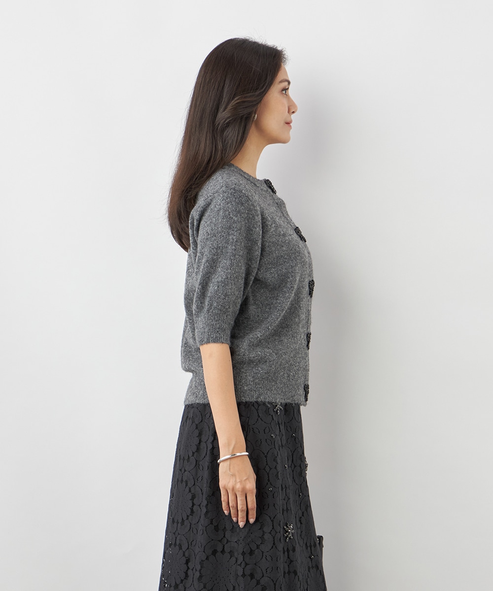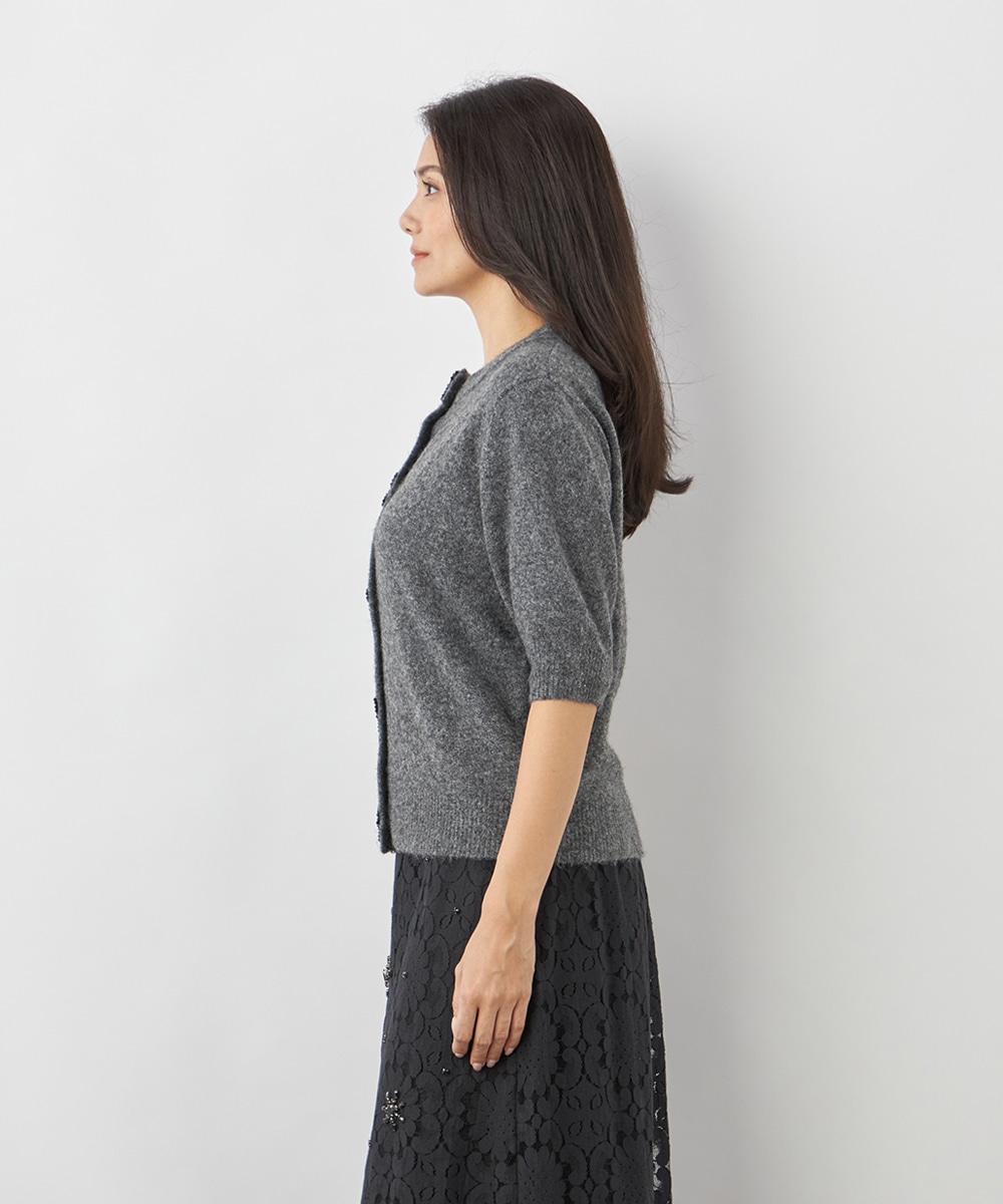 クロップド丈に五分袖でコンパクトにまとまり、すっきりと着こなせます。合わせるボトムスを選ばず、アレンジ力の高さも魅力です。ほどよい毛羽感のある表情が優しくナチュラルな雰囲気をプラスします。肌触りが柔らかくて着心地も良好です。シックなモノトーンカラーでまとめています。
