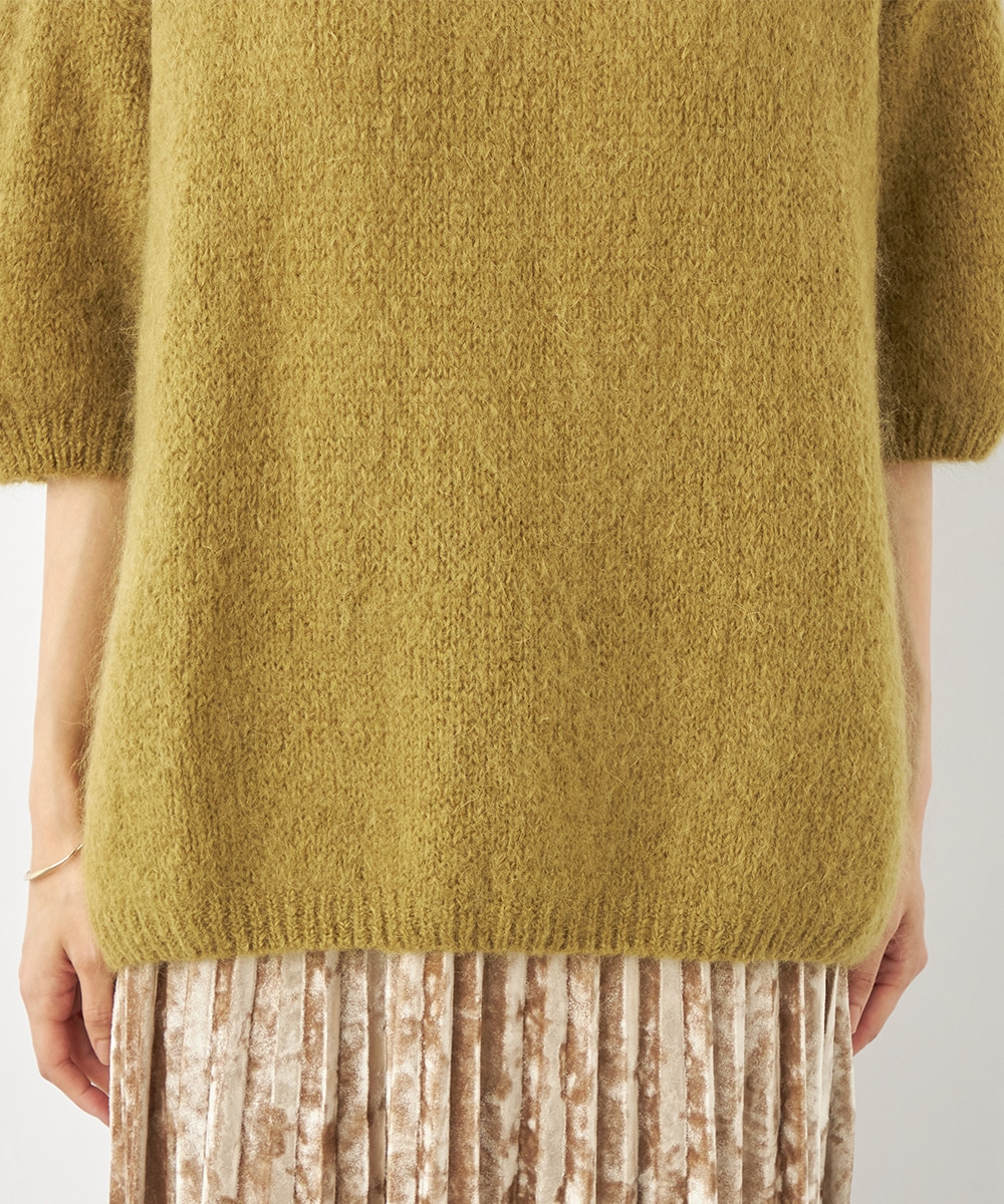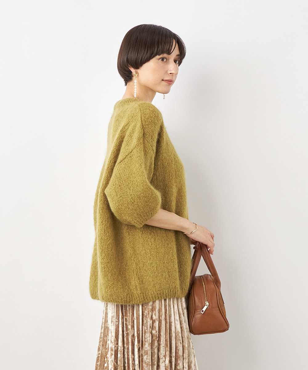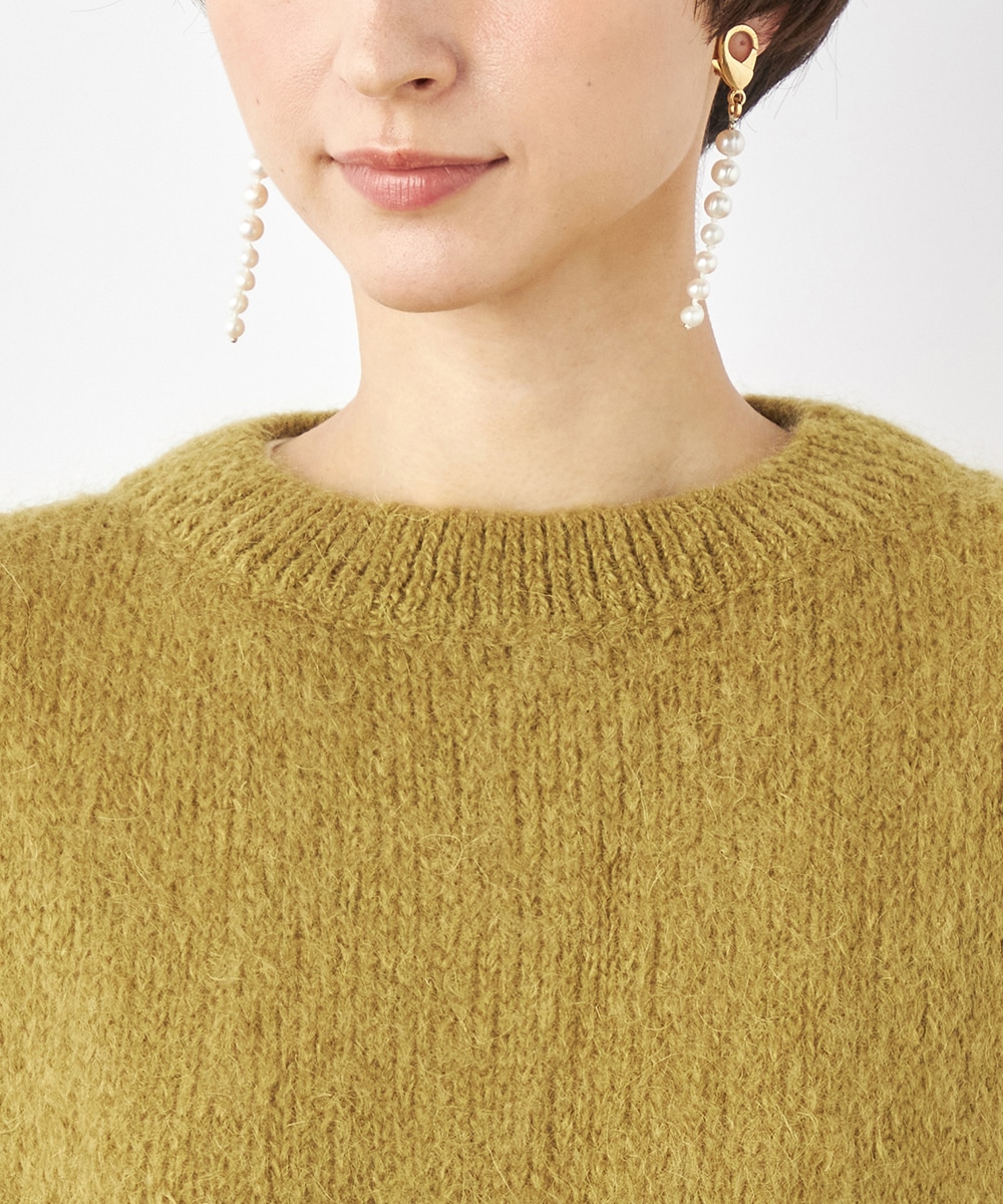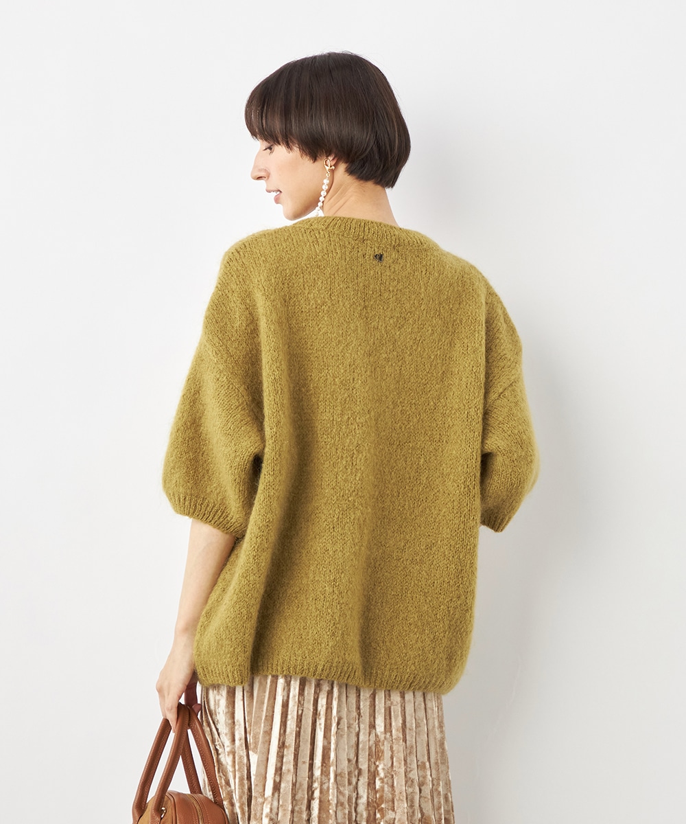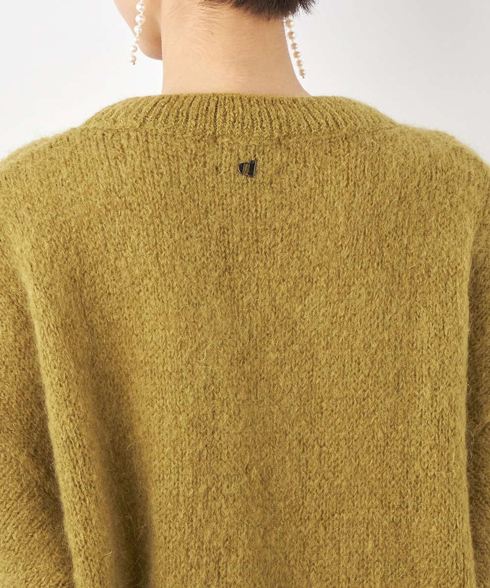 ベーシックで使い勝手が良いワンカラーのデザイン。ほどよい毛羽感のある表情がぬくもりを印象付けて、秋冬コーディネートとも好相性のアイテムです。バックネックにはイニシャルチャームをあしらっています。長袖のアイテムとレイヤードのアレンジもおすすめです。