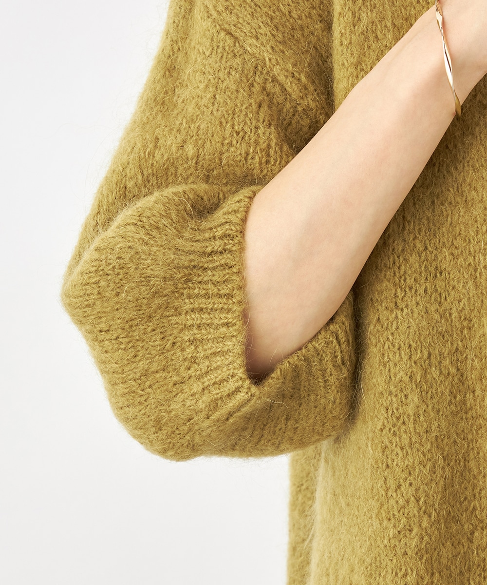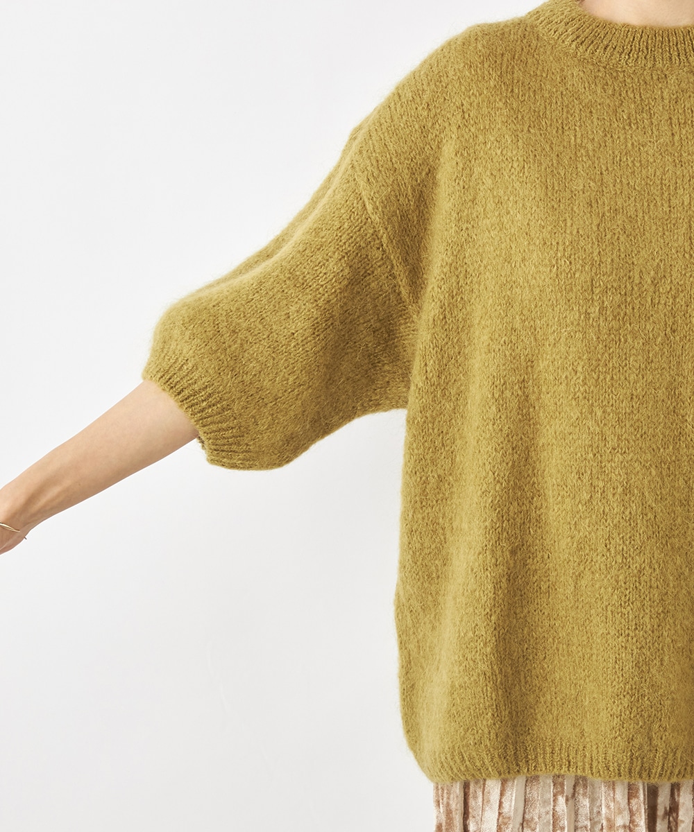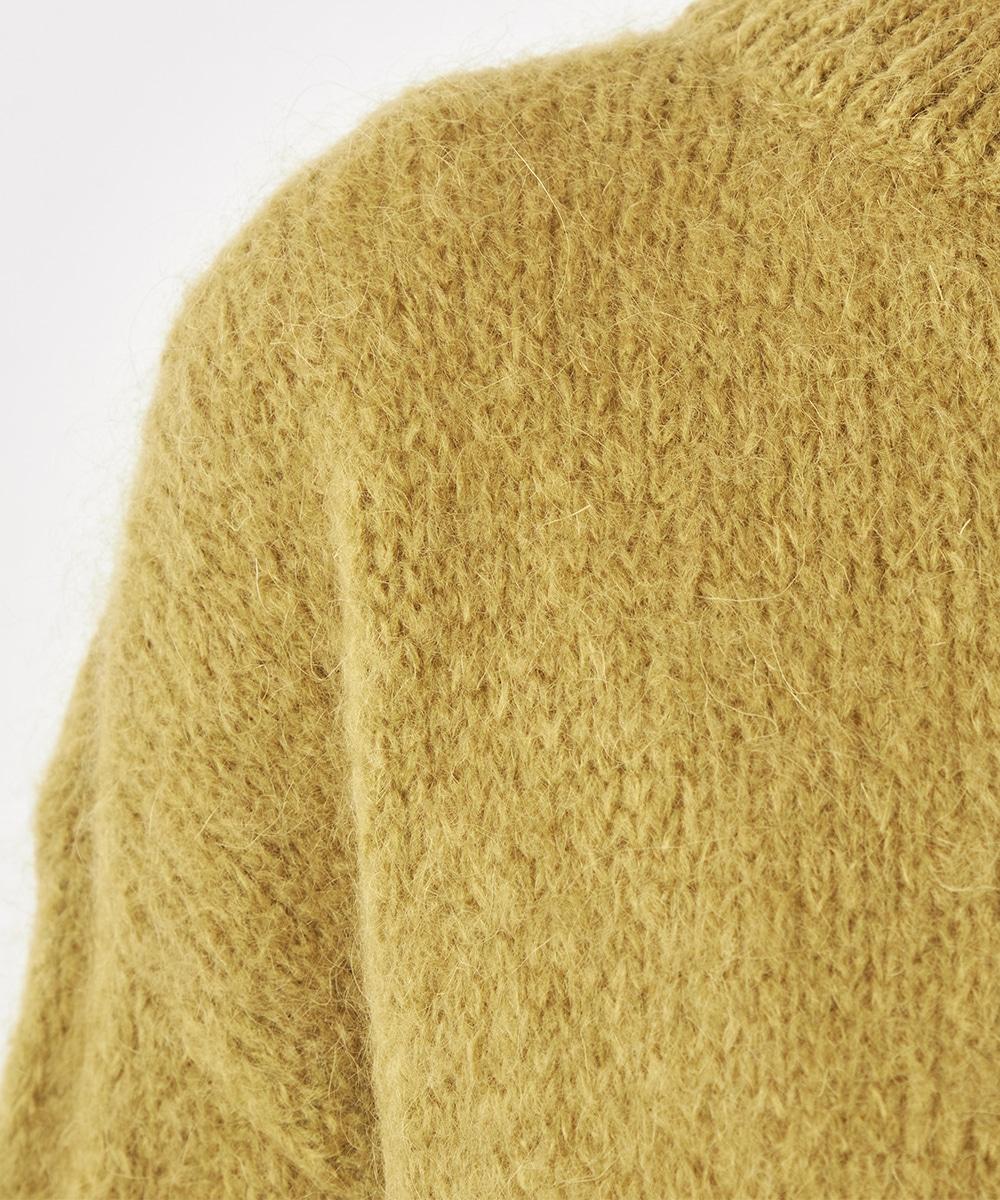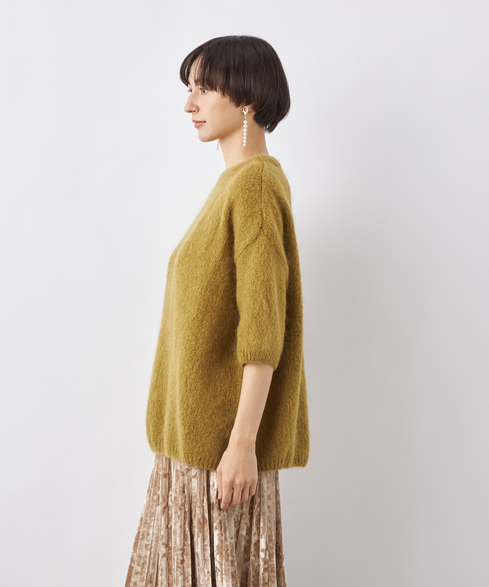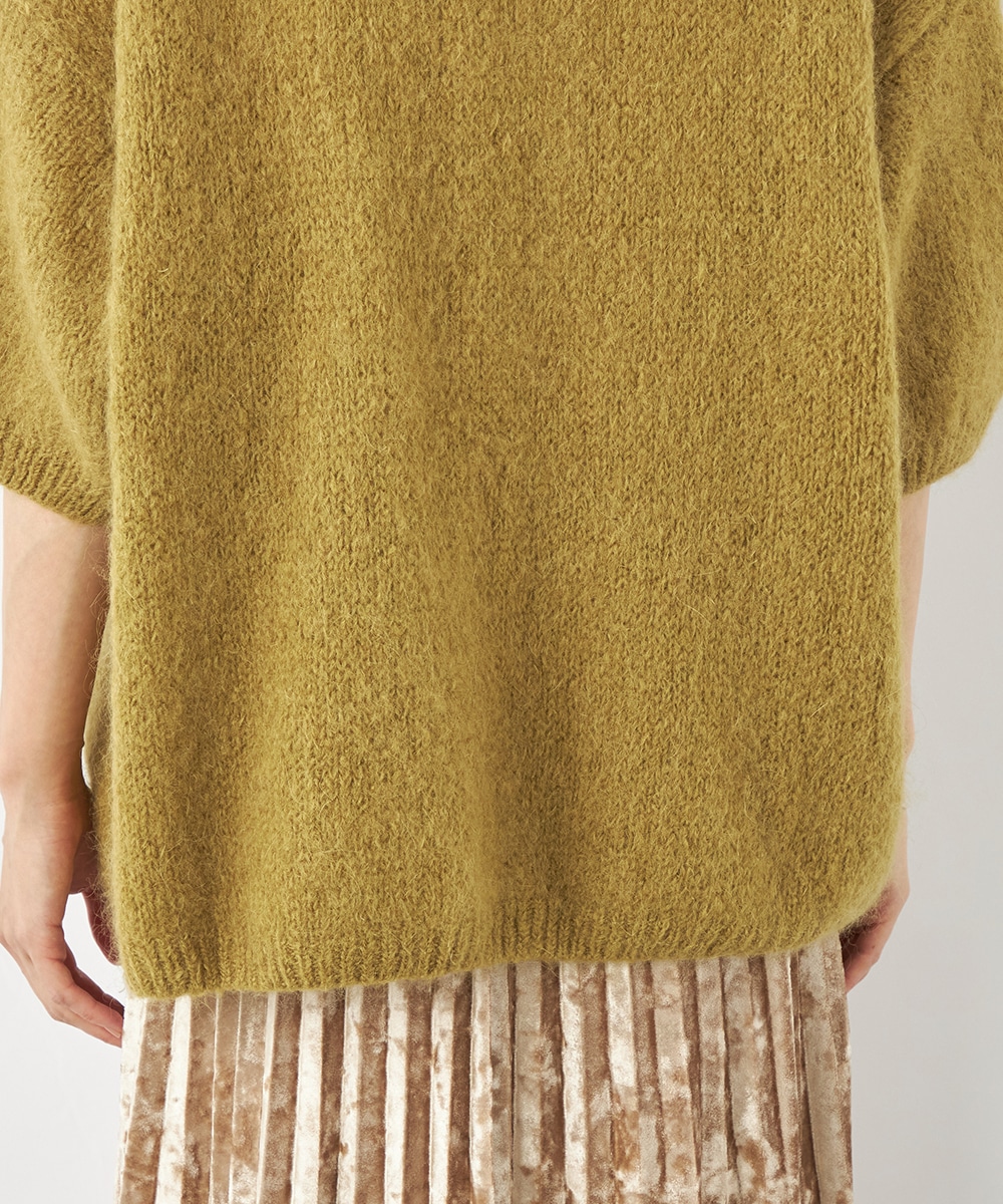 ベーシックで使い勝手が良いワンカラーのデザイン。ほどよい毛羽感のある表情がぬくもりを印象付けて、秋冬コーディネートとも好相性のアイテムです。バックネックにはイニシャルチャームをあしらっています。長袖のアイテムとレイヤードのアレンジもおすすめです。