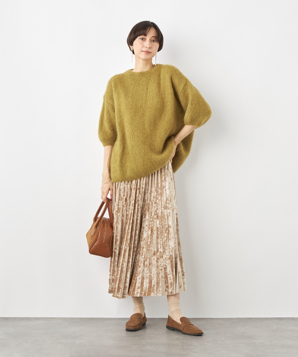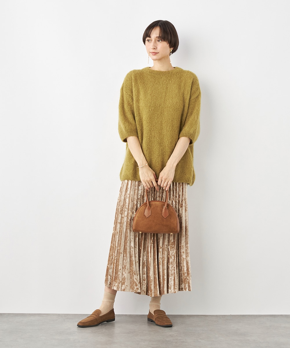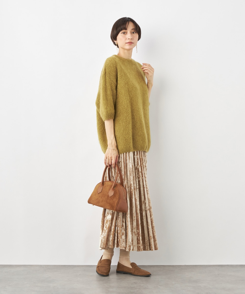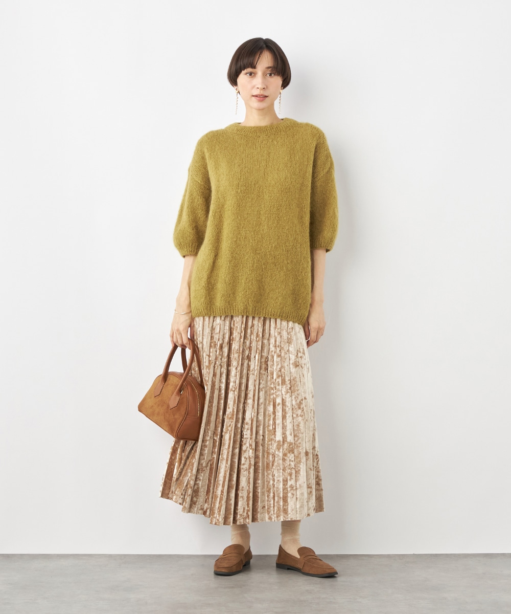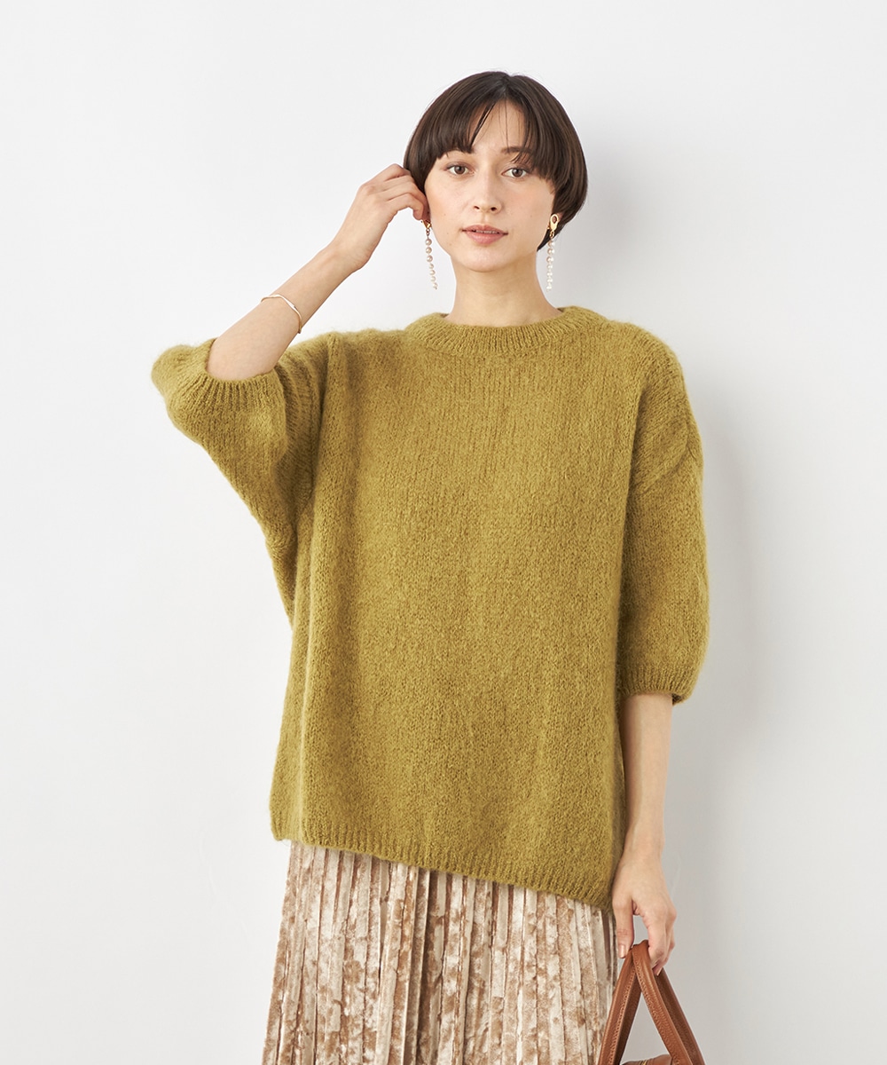 ベーシックで使い勝手が良いワンカラーのデザイン。ほどよい毛羽感のある表情がぬくもりを印象付けて、秋冬コーディネートとも好相性のアイテムです。バックネックにはイニシャルチャームをあしらっています。長袖のアイテムとレイヤードのアレンジもおすすめです。