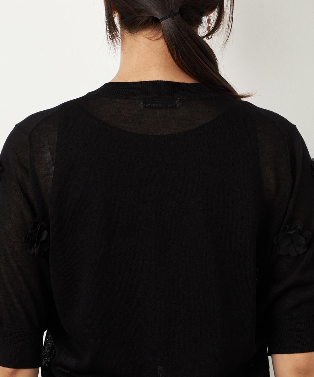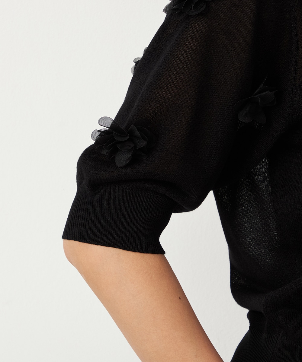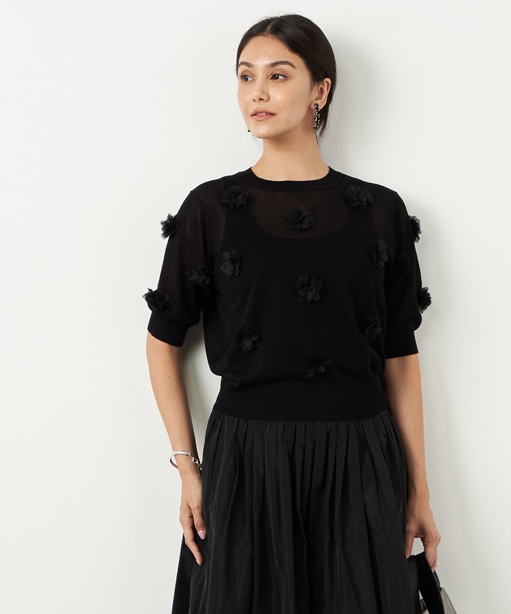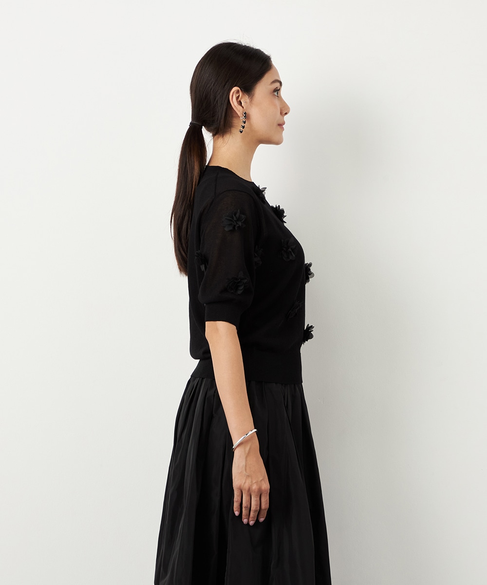 1つずつフラワーモチーフを手付けして、丁寧に仕上げています。編み地は薄手で繊細な透け感が見られ、トレンドライクな印象です。半袖のデザイン×短めの着丈のすっきりと着こなせるフォルム。ボリュームシルエットのスカートと合わせるのもおすすめのアレンジです。