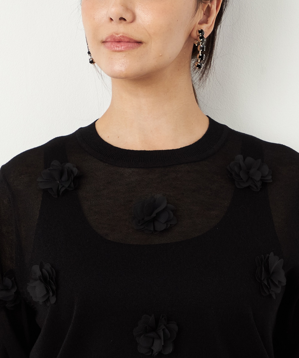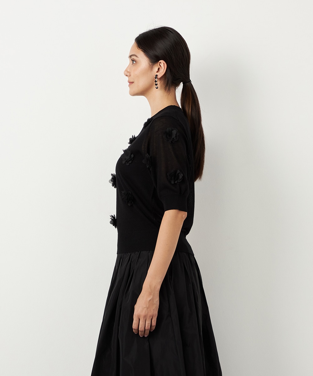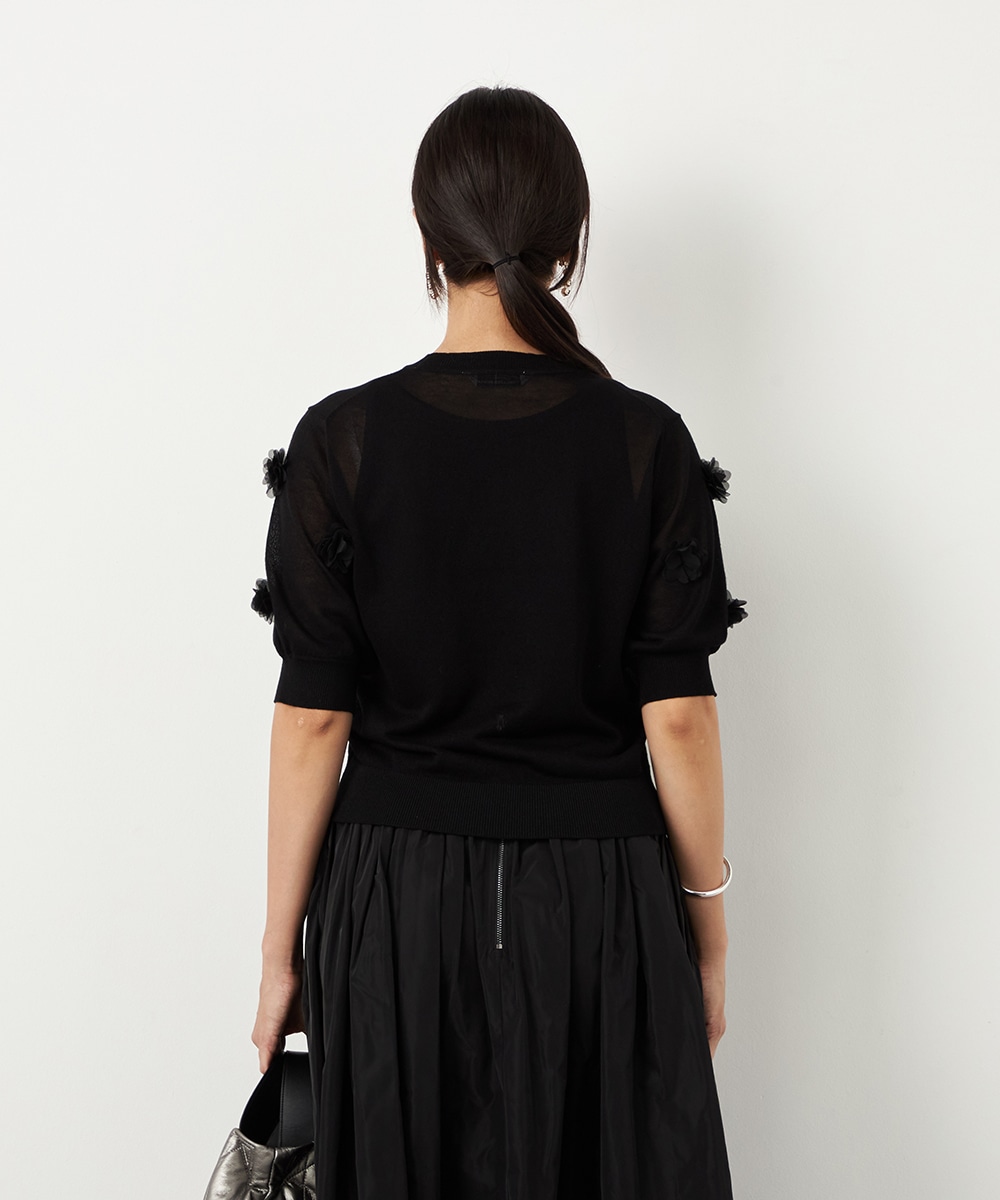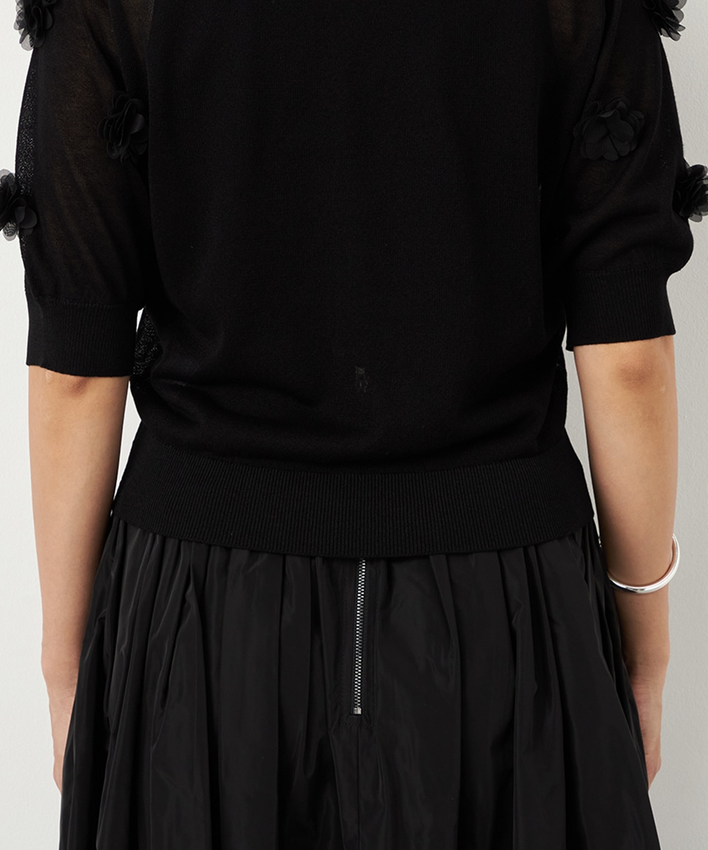 1つずつフラワーモチーフを手付けして、丁寧に仕上げています。編み地は薄手で繊細な透け感が見られ、トレンドライクな印象です。半袖のデザイン×短めの着丈のすっきりと着こなせるフォルム。ボリュームシルエットのスカートと合わせるのもおすすめのアレンジです。