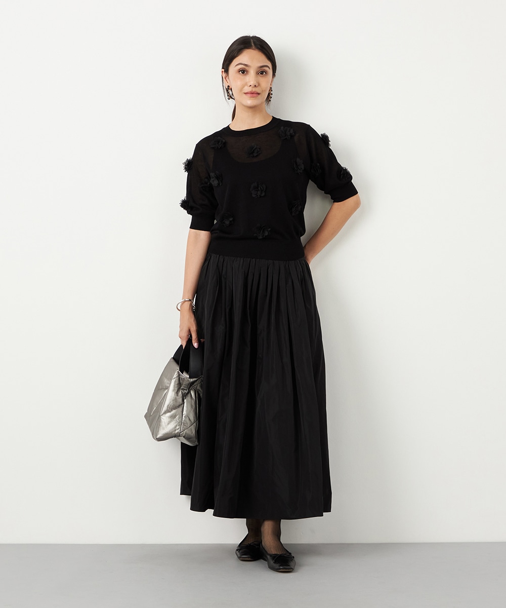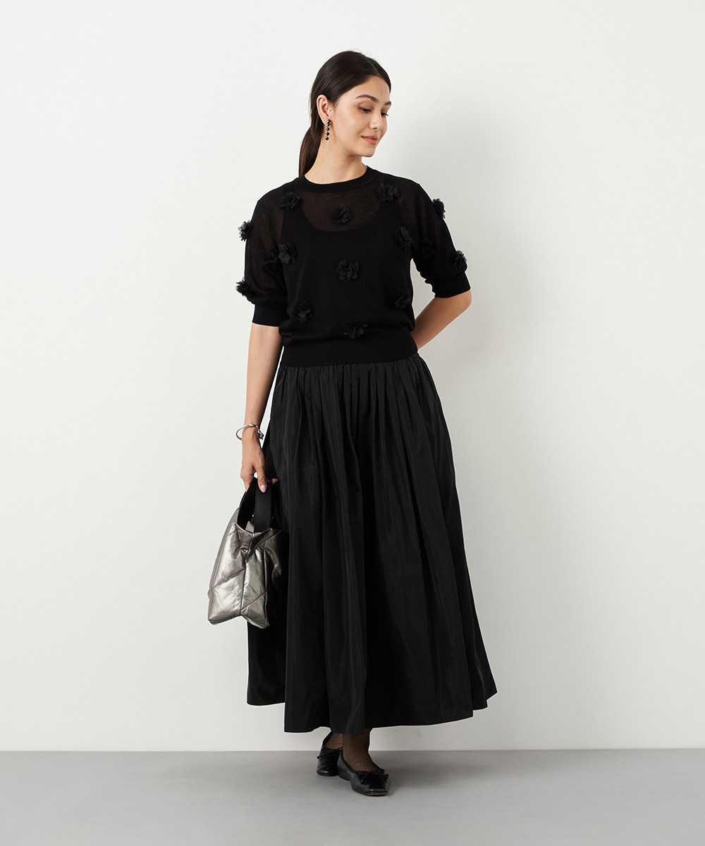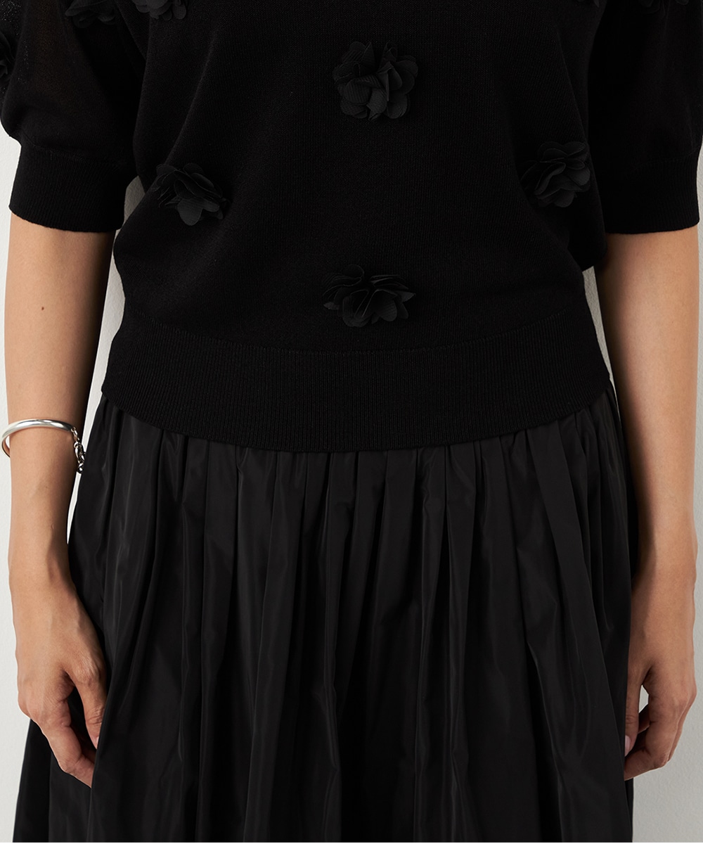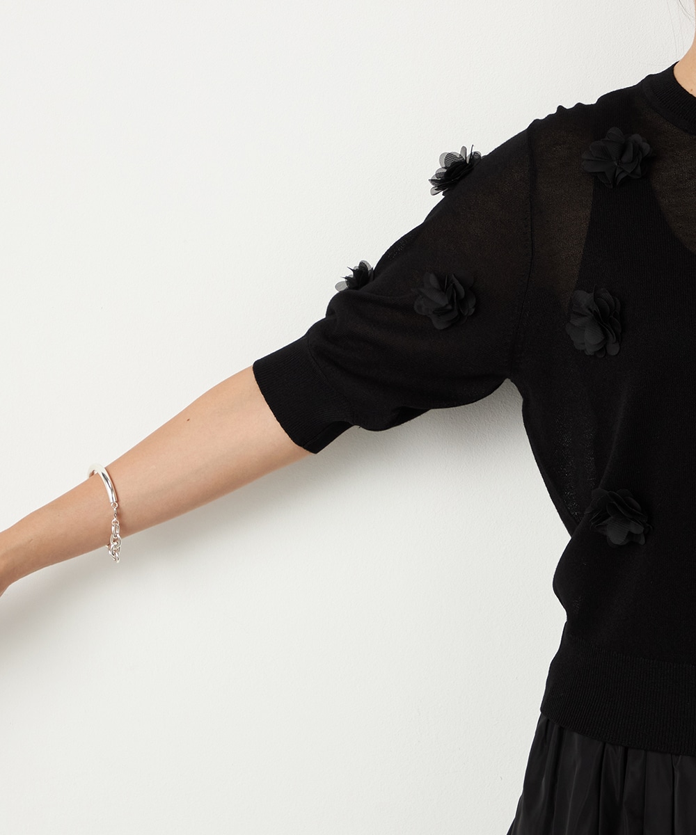 1つずつフラワーモチーフを手付けして、丁寧に仕上げています。編み地は薄手で繊細な透け感が見られ、トレンドライクな印象です。半袖のデザイン×短めの着丈のすっきりと着こなせるフォルム。ボリュームシルエットのスカートと合わせるのもおすすめのアレンジです。