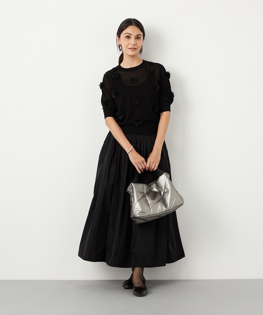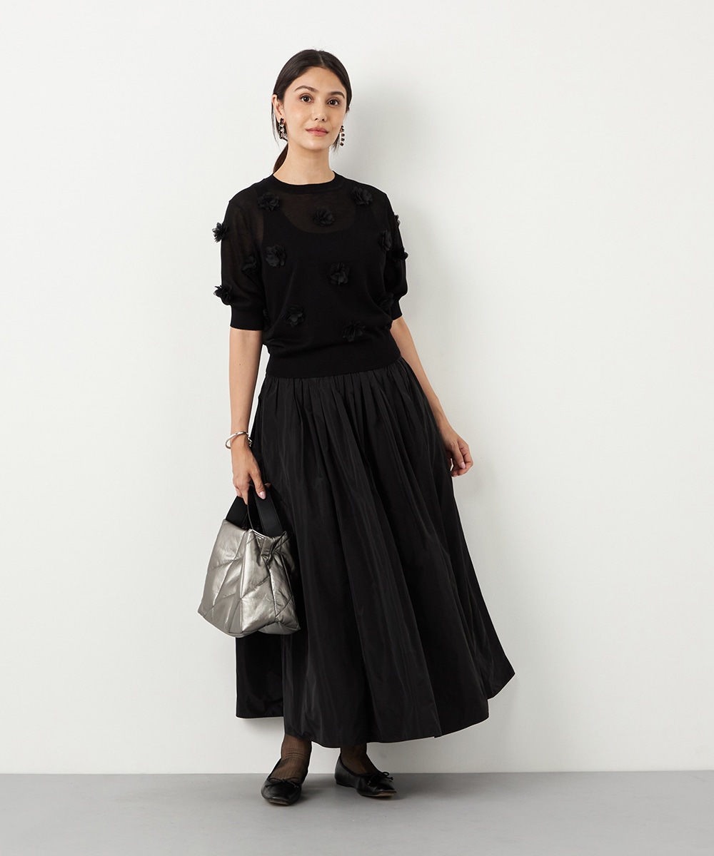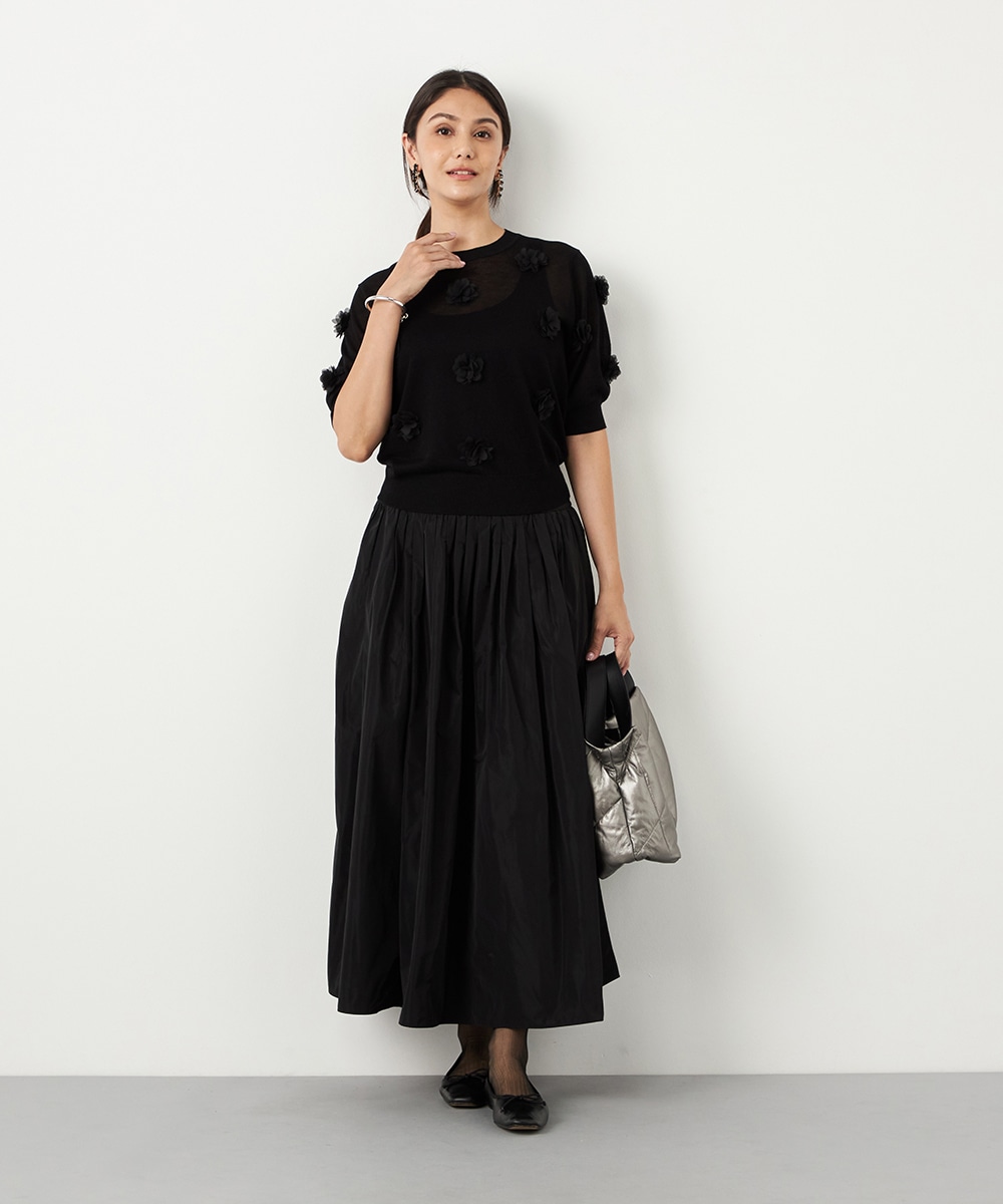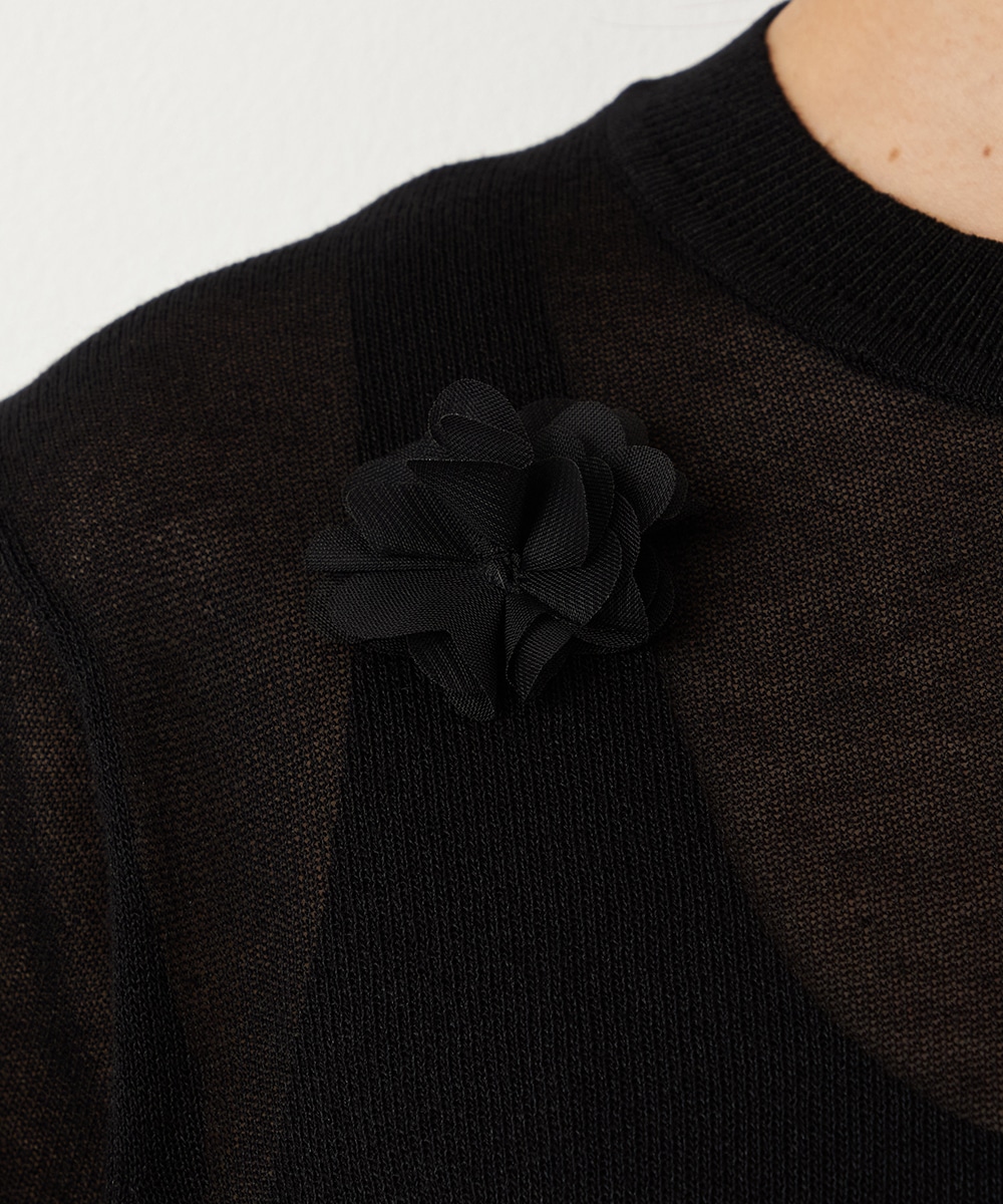 1つずつフラワーモチーフを手付けして、丁寧に仕上げています。編み地は薄手で繊細な透け感が見られ、トレンドライクな印象です。半袖のデザイン×短めの着丈のすっきりと着こなせるフォルム。ボリュームシルエットのスカートと合わせるのもおすすめのアレンジです。