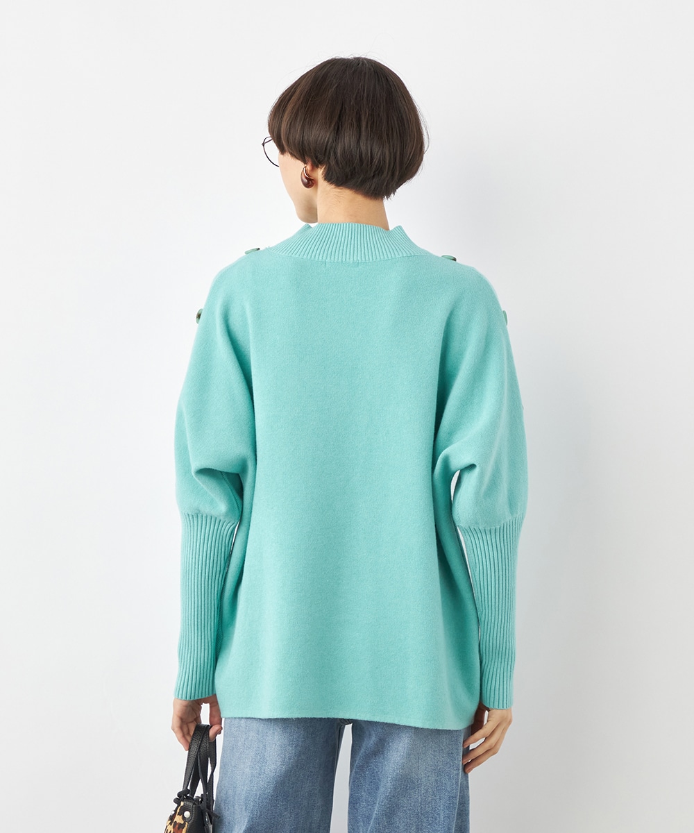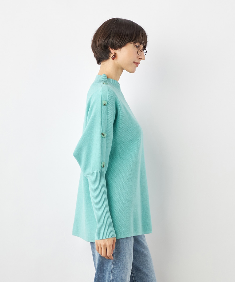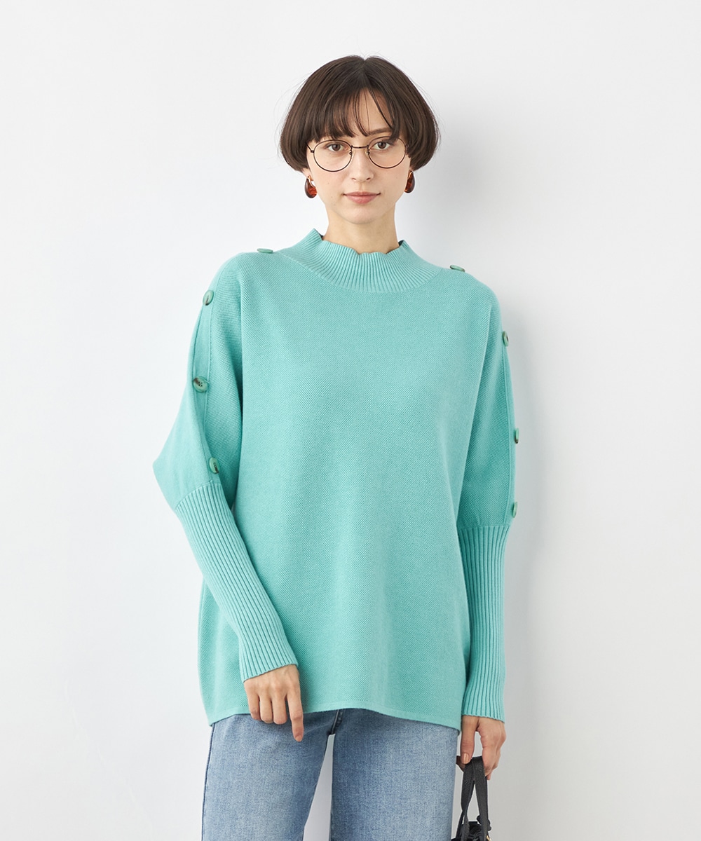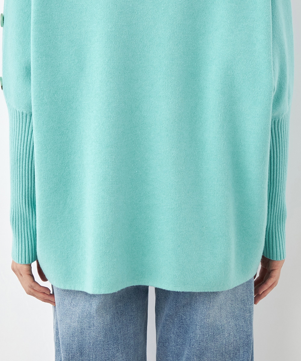肩から袖にあしらったボタンがアクセント。ヒップがさりげなく隠れるのもうれしいニットチュニック。