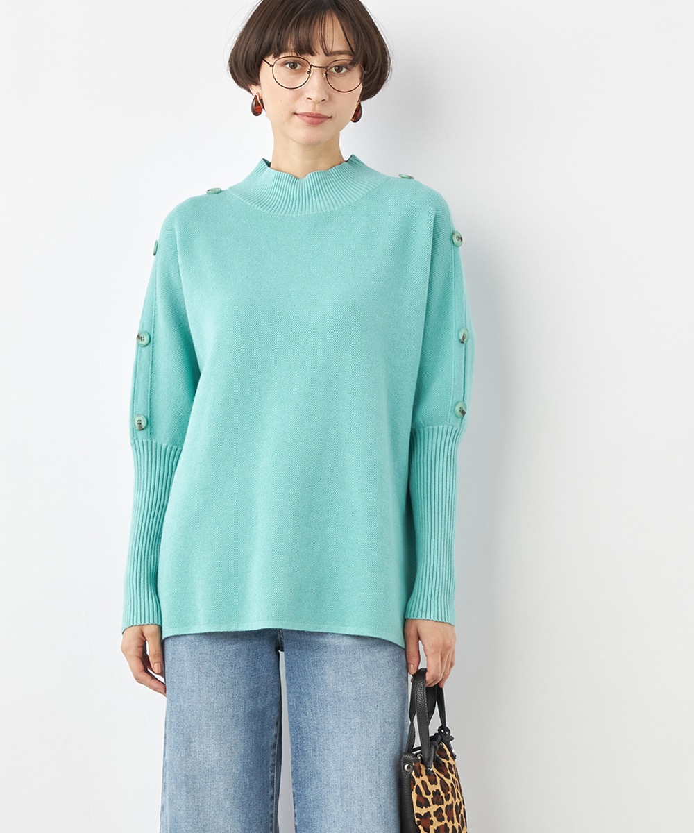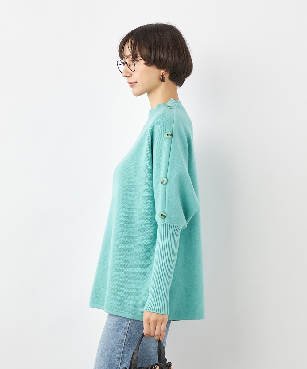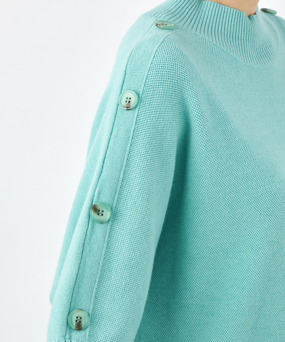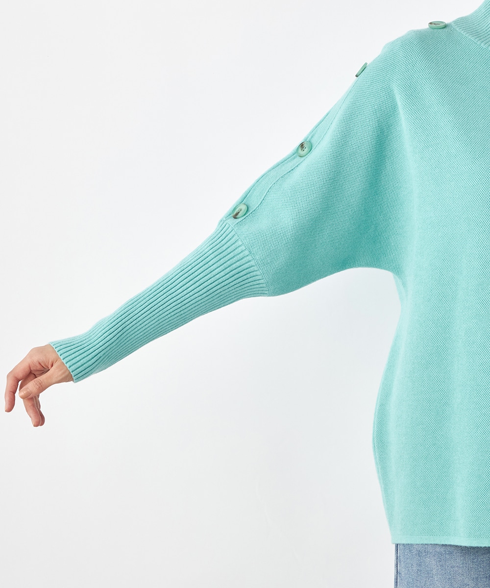 肩から袖にあしらったボタンがアクセント。ヒップがさりげなく隠れるのもうれしいニットチュニック。