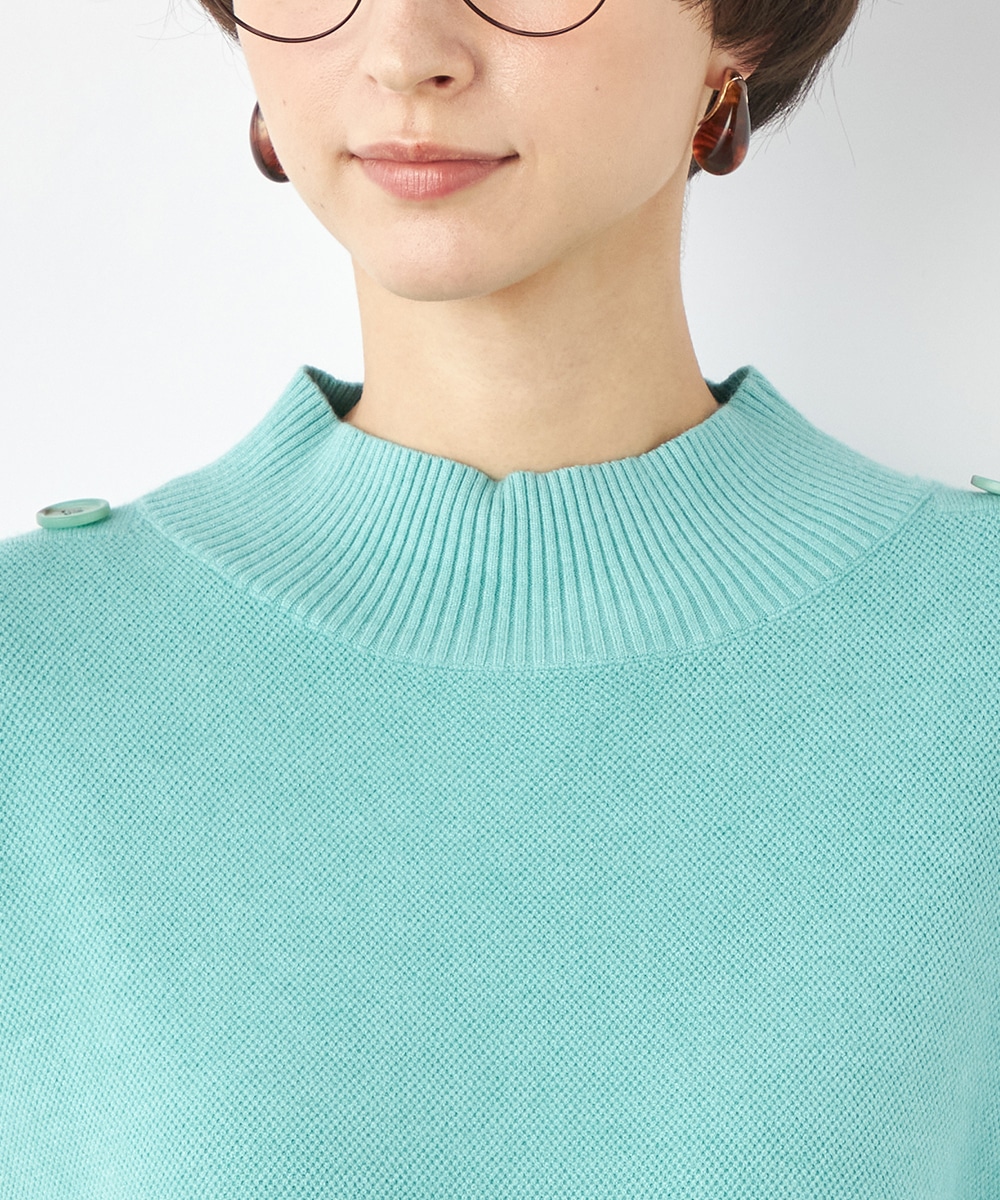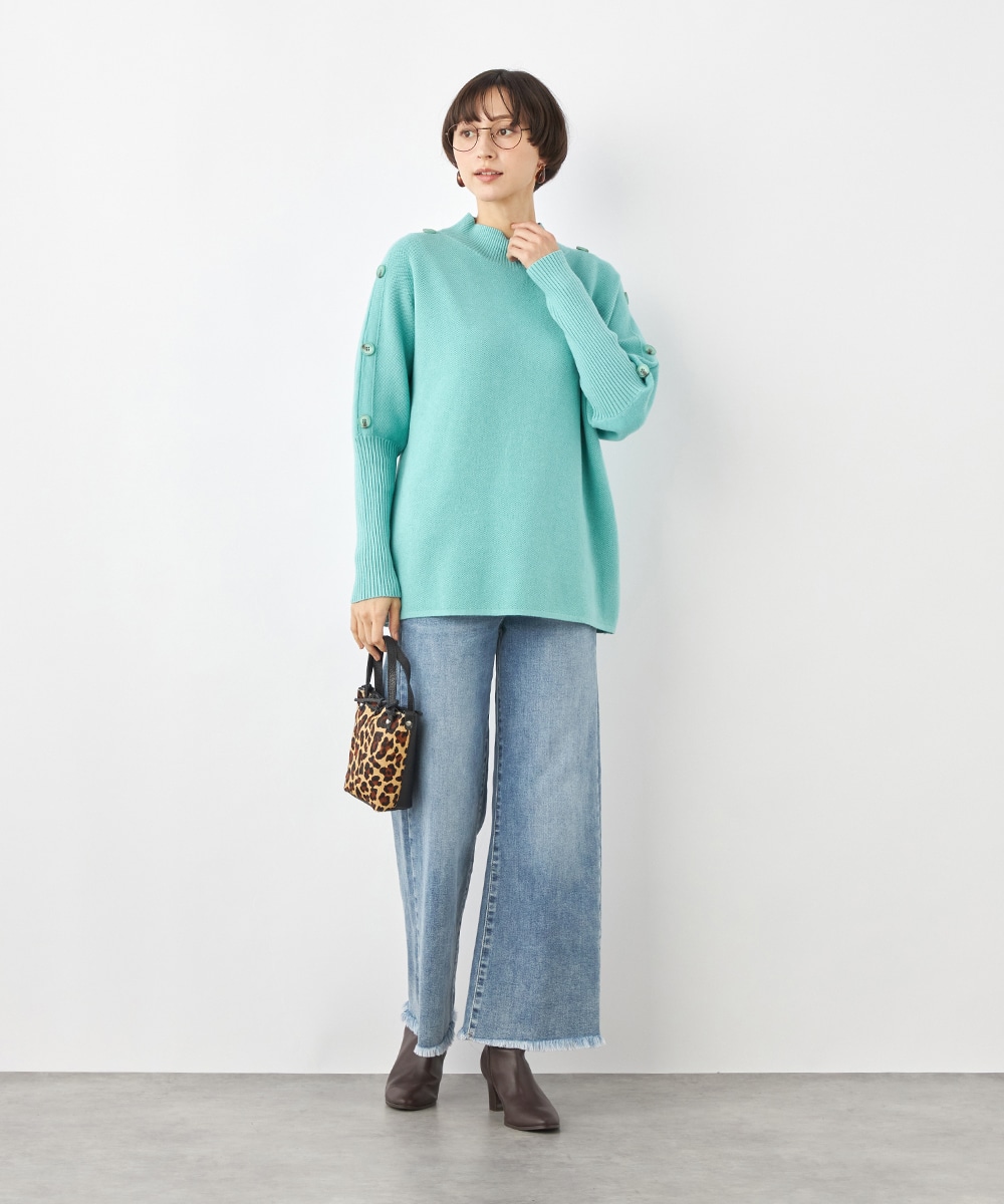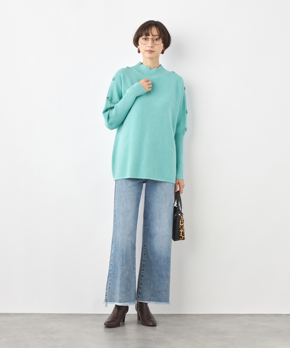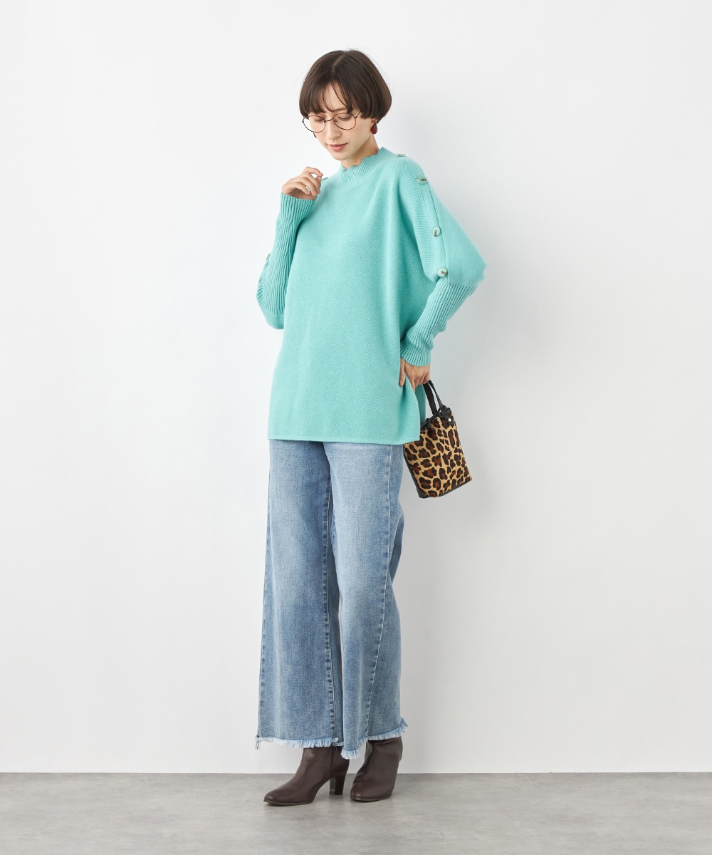 肩から袖にあしらったボタンがアクセント。ヒップがさりげなく隠れるのもうれしいニットチュニック。