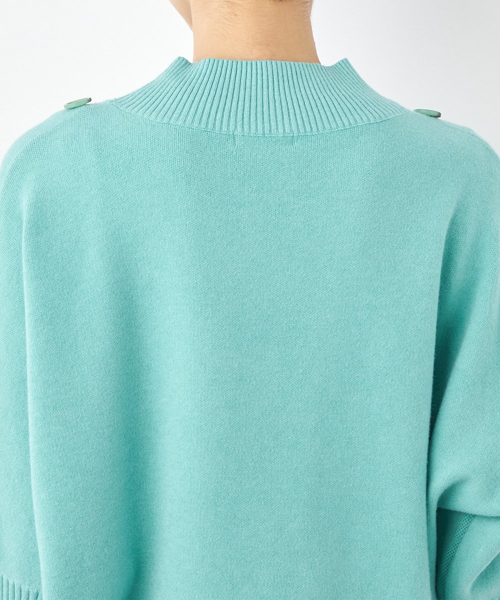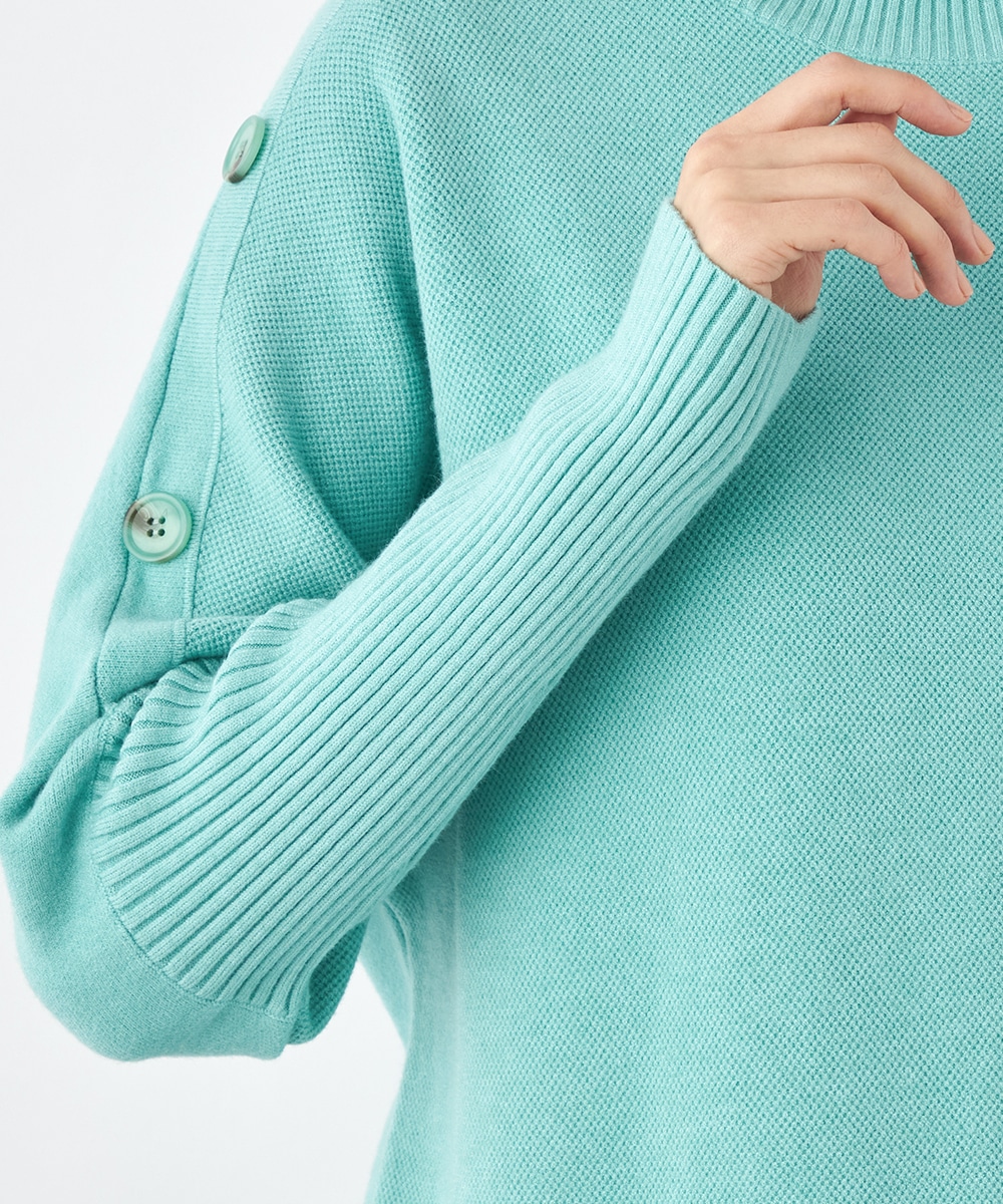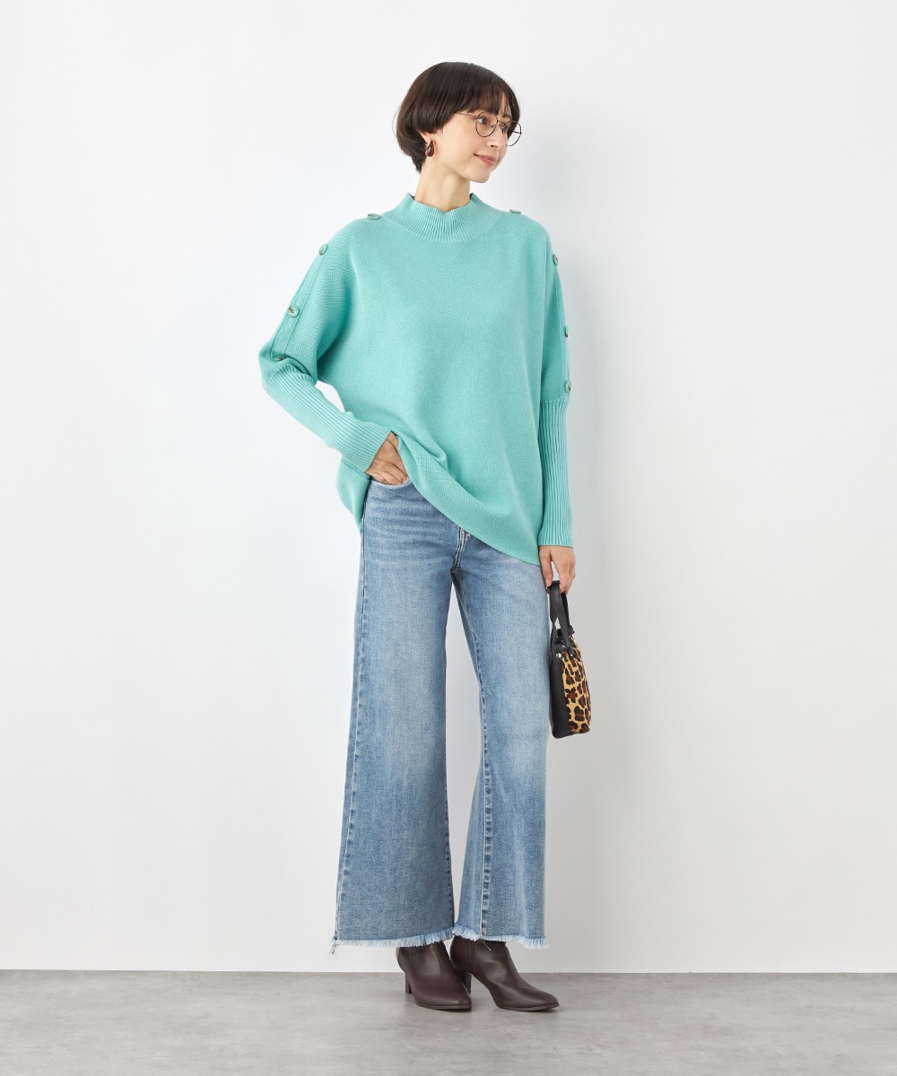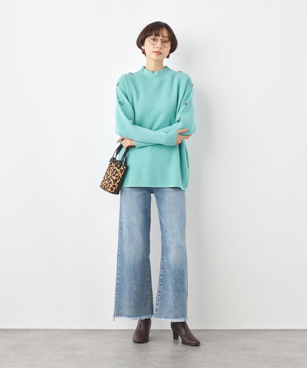 肩から袖にあしらったボタンがアクセント。ヒップがさりげなく隠れるのもうれしいニットチュニック。