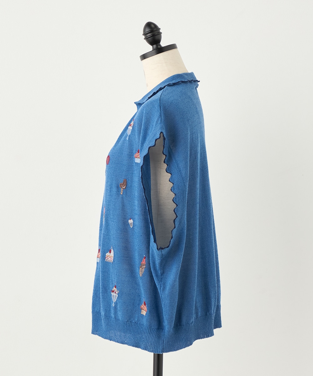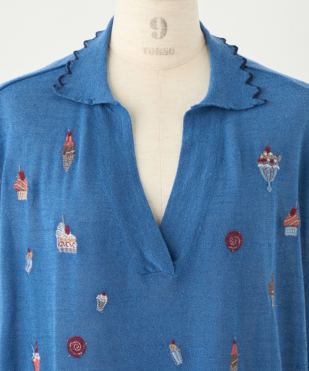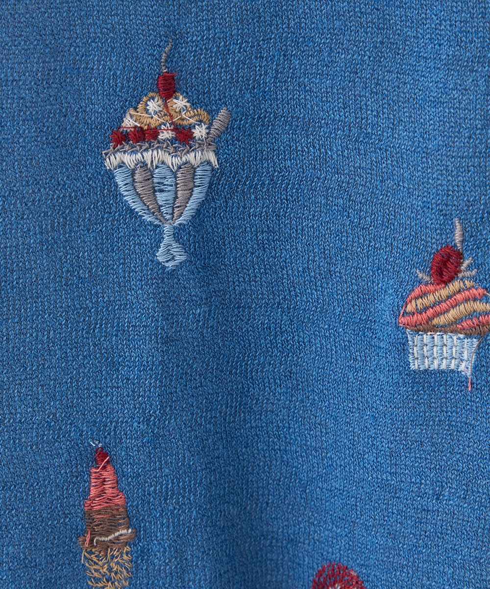 さまざまなスイーツモチーフ刺繍が目を引いて、大人可愛い印象のコーディネートを楽しめます。襟元と袖口を波型にして、細部にまでこだわりを感じる仕上がりです。ネックの深めのカッティングでフェイスラインはすっきりと見えます。シルエットはほどよくゆったりとして、リラックスできる着心地です。