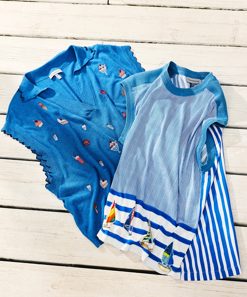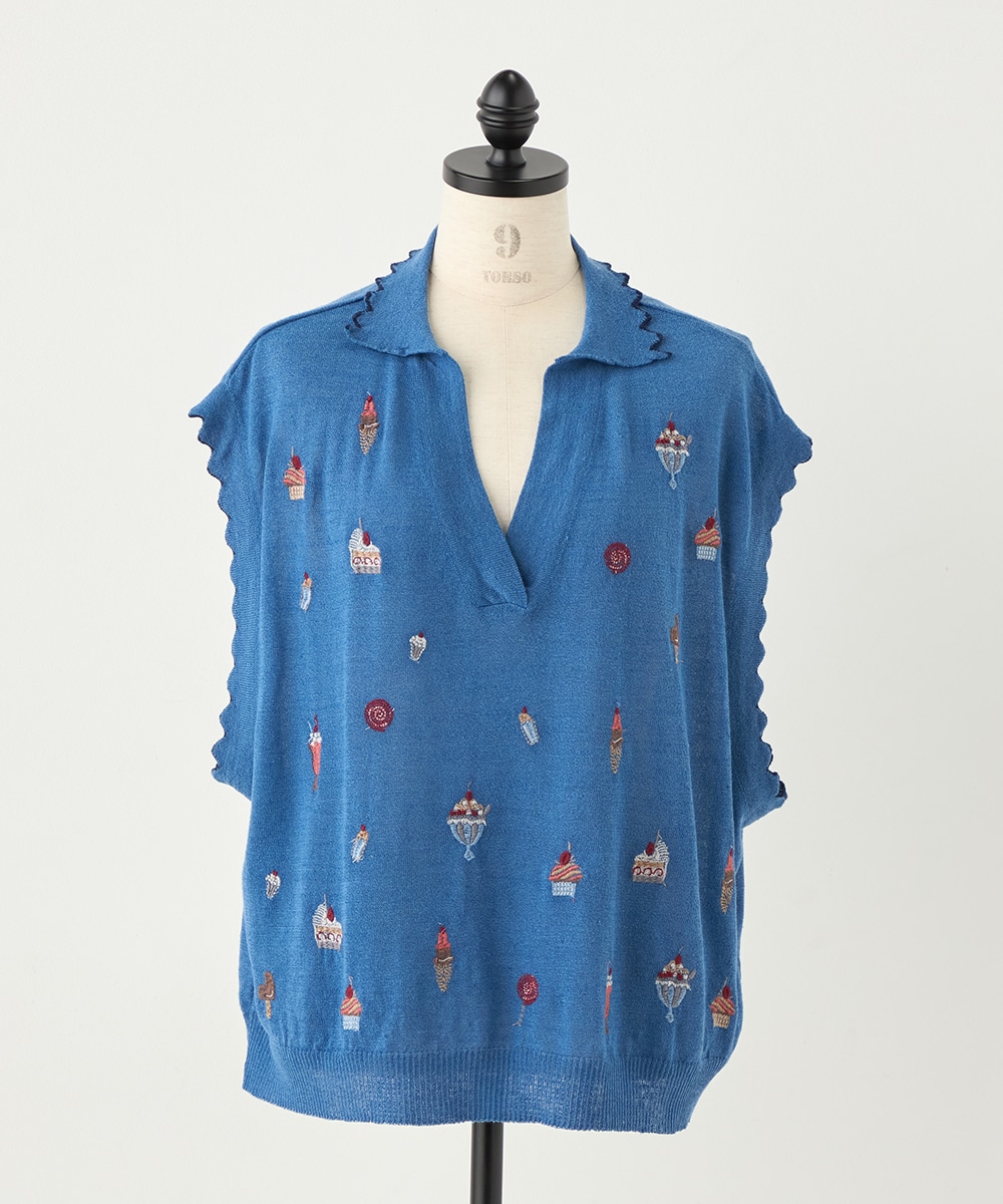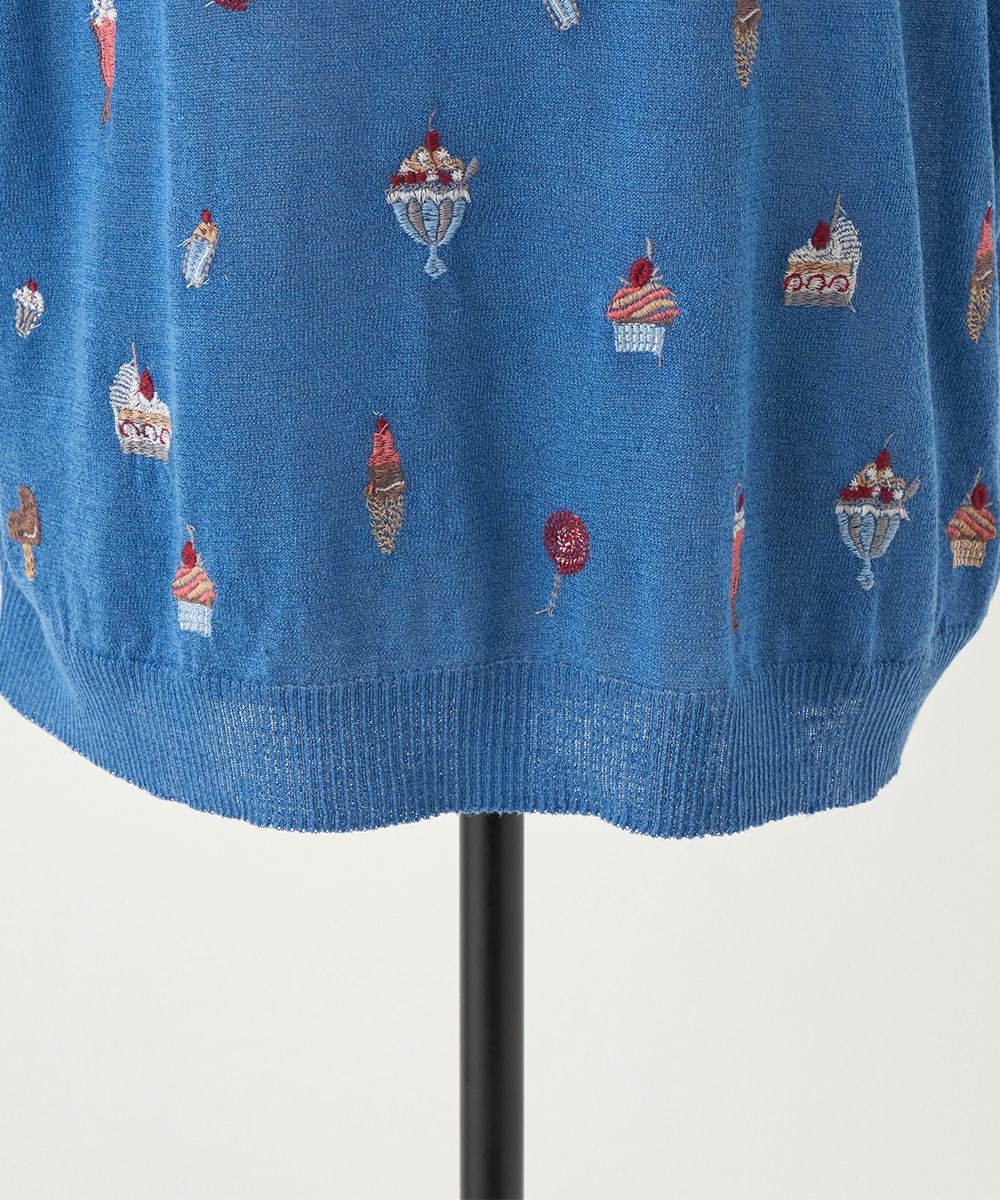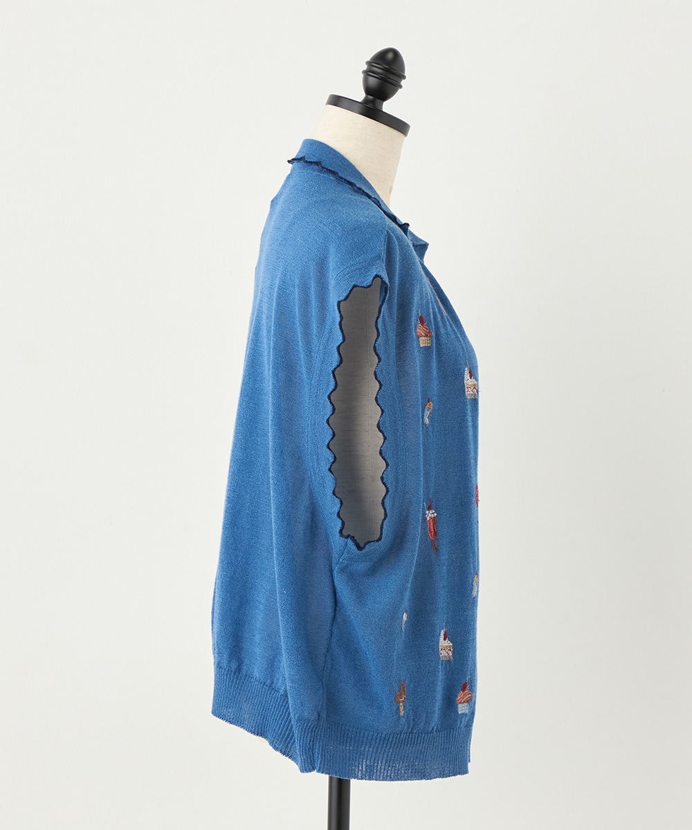 さまざまなスイーツモチーフ刺繍が目を引いて、大人可愛い印象のコーディネートを楽しめます。襟元と袖口を波型にして、細部にまでこだわりを感じる仕上がりです。ネックの深めのカッティングでフェイスラインはすっきりと見えます。シルエットはほどよくゆったりとして、リラックスできる着心地です。