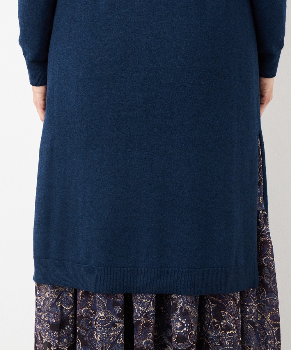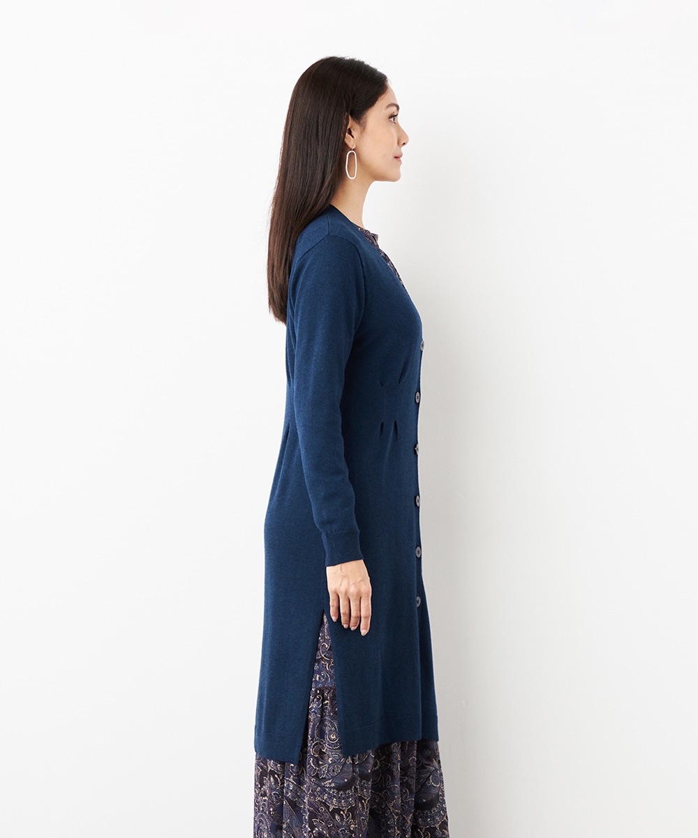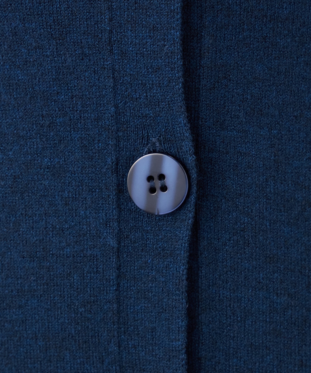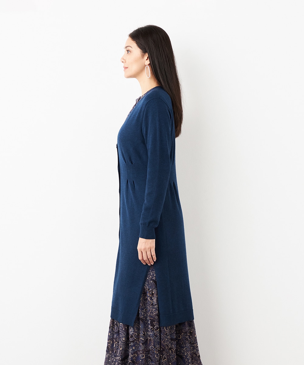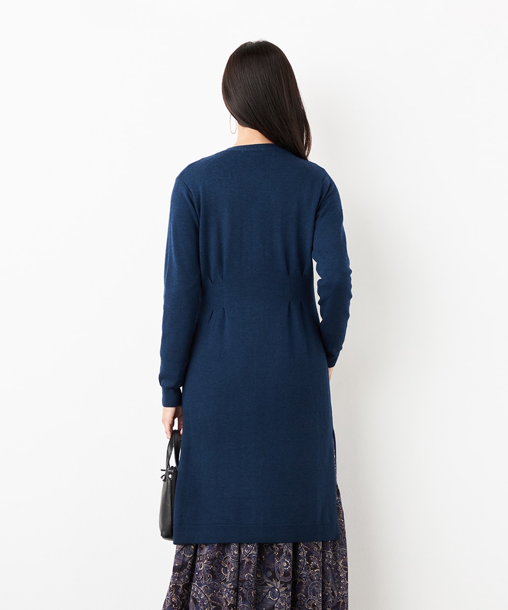 ウエスト位置にはダーツを施して、ボディに沿うきれいなシルエットを作り出しています。深めのサイドスリットがアクセントとしても有効です。ハイゲージニットのなめらかな表面感は上品さのポイント。ほどよい厚みで季節の変わり目の羽織としても使い勝手が良く、幅広く活躍します。