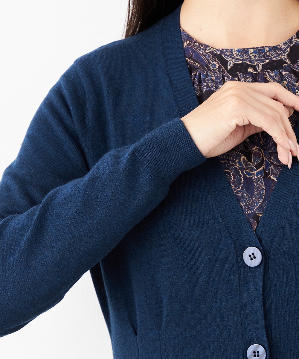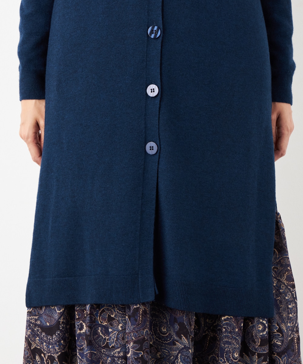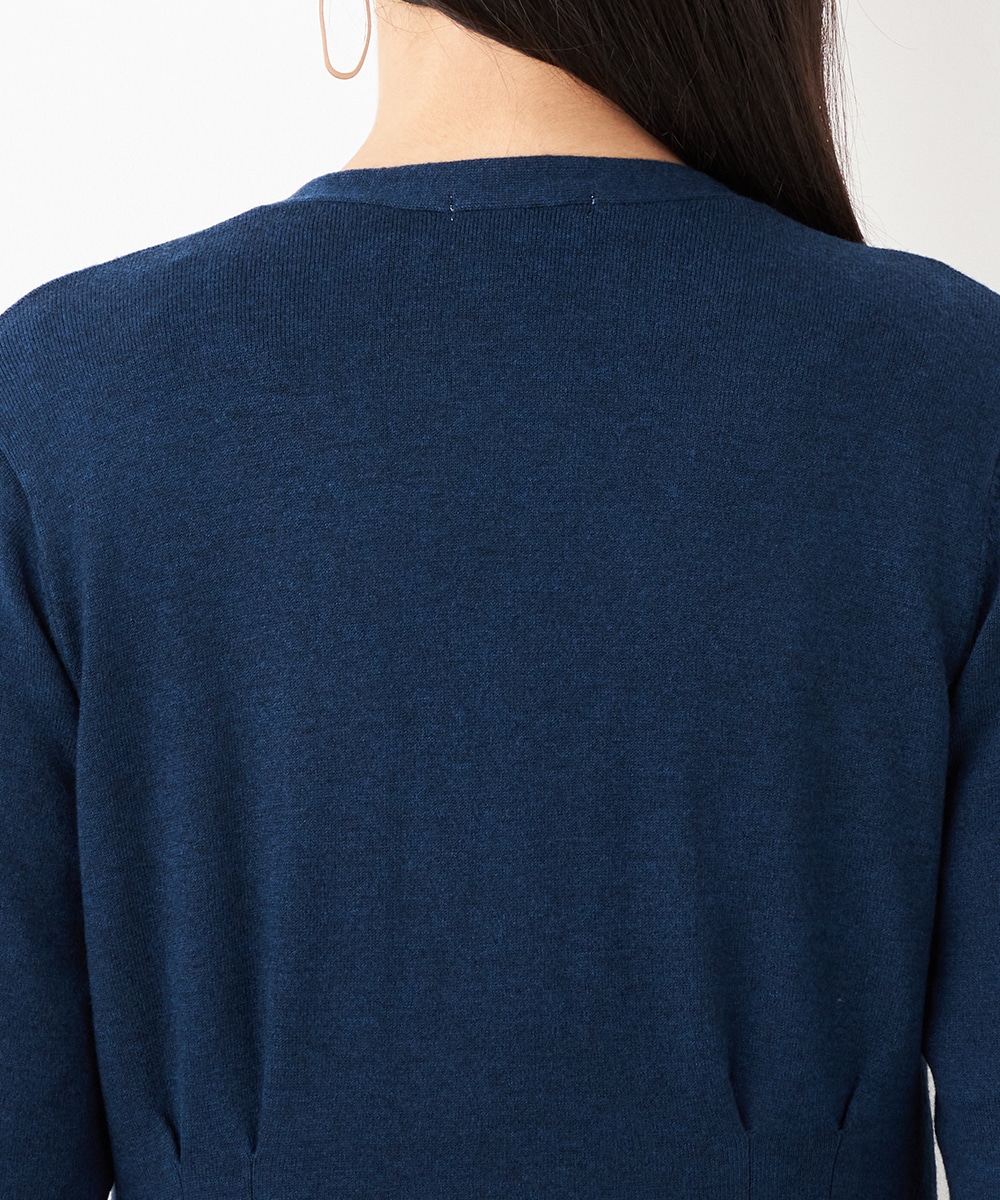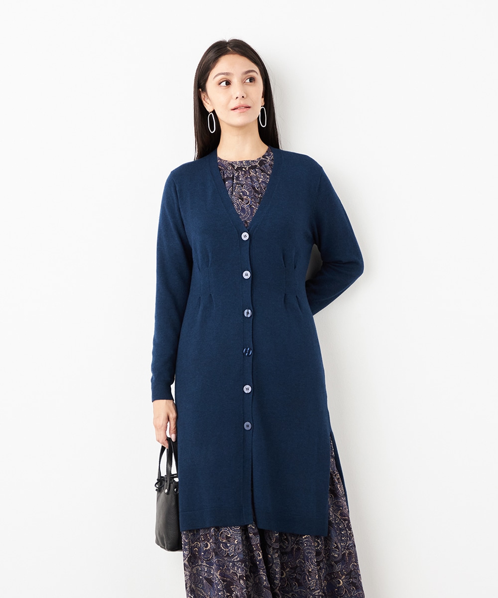 ウエスト位置にはダーツを施して、ボディに沿うきれいなシルエットを作り出しています。深めのサイドスリットがアクセントとしても有効です。ハイゲージニットのなめらかな表面感は上品さのポイント。ほどよい厚みで季節の変わり目の羽織としても使い勝手が良く、幅広く活躍します。