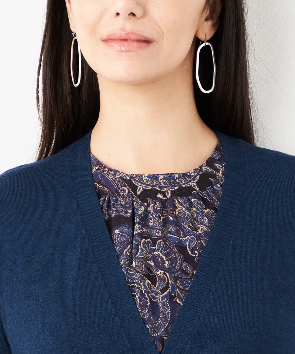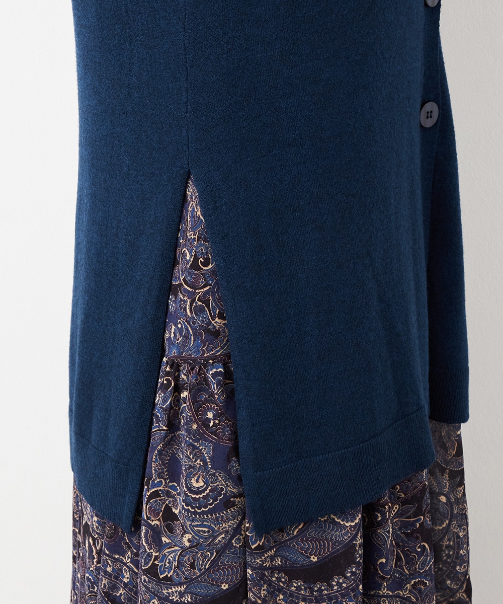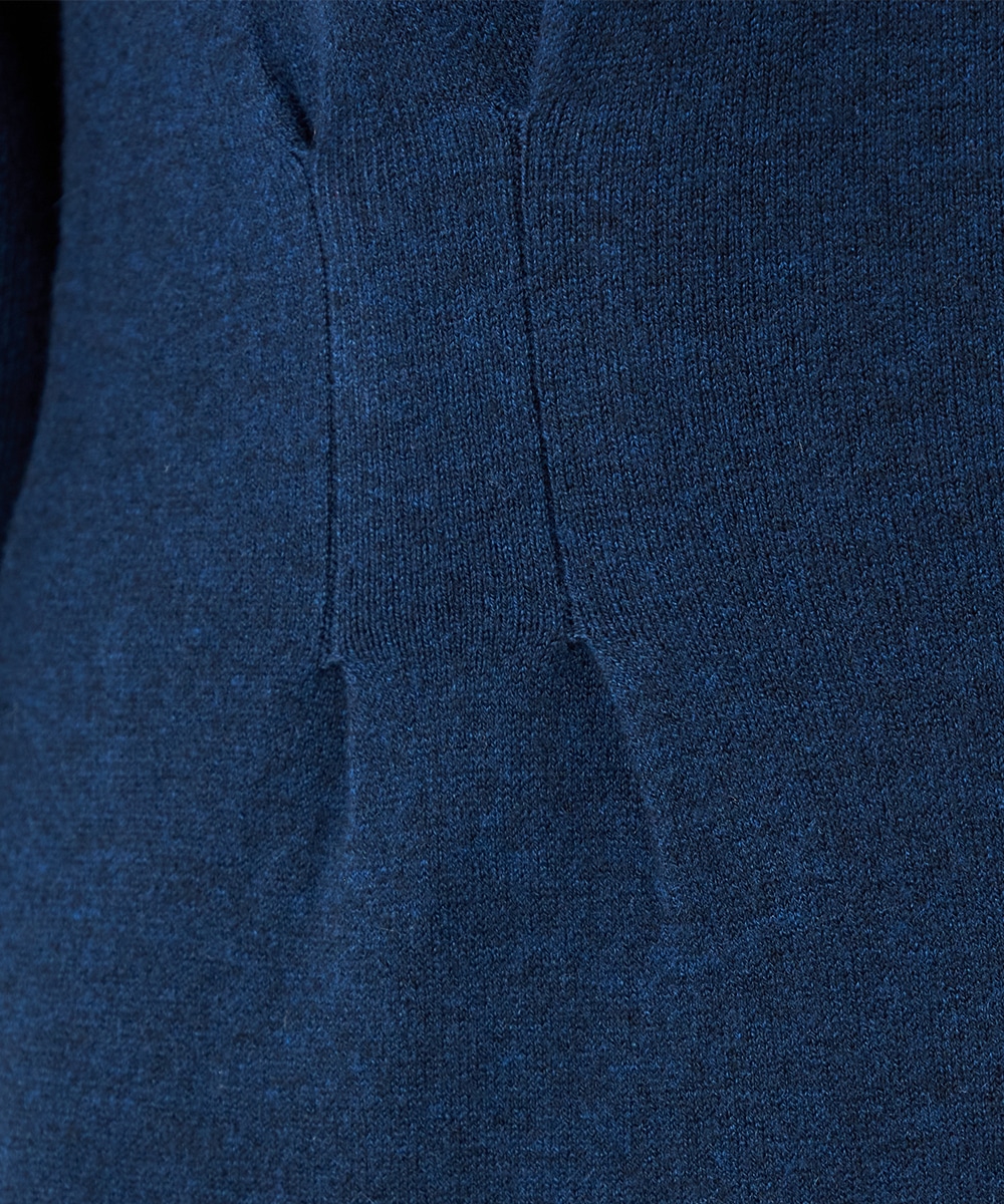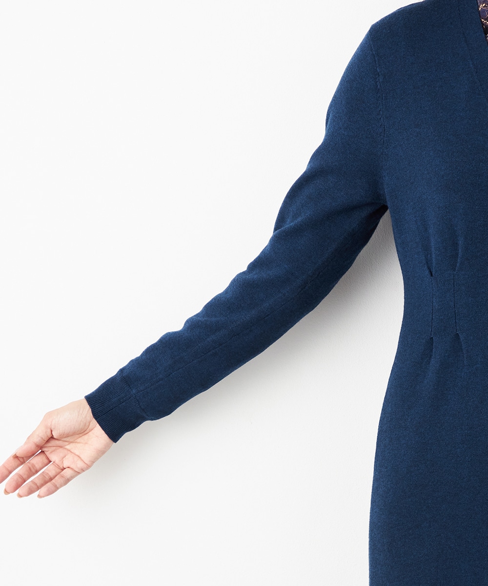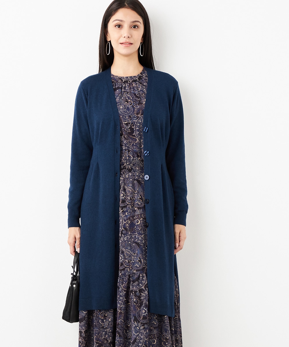 ウエスト位置にはダーツを施して、ボディに沿うきれいなシルエットを作り出しています。深めのサイドスリットがアクセントとしても有効です。ハイゲージニットのなめらかな表面感は上品さのポイント。ほどよい厚みで季節の変わり目の羽織としても使い勝手が良く、幅広く活躍します。