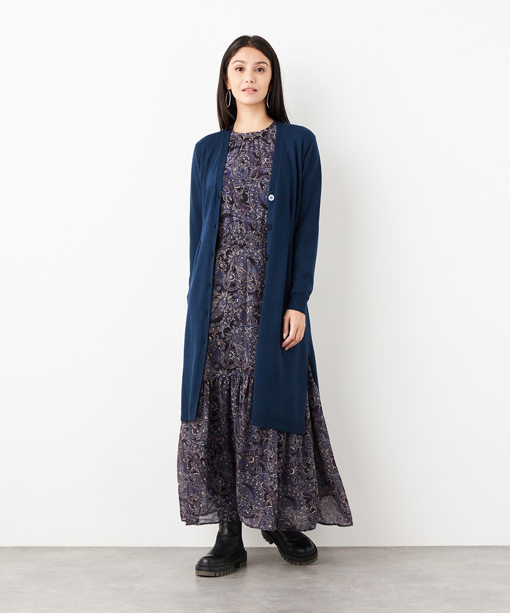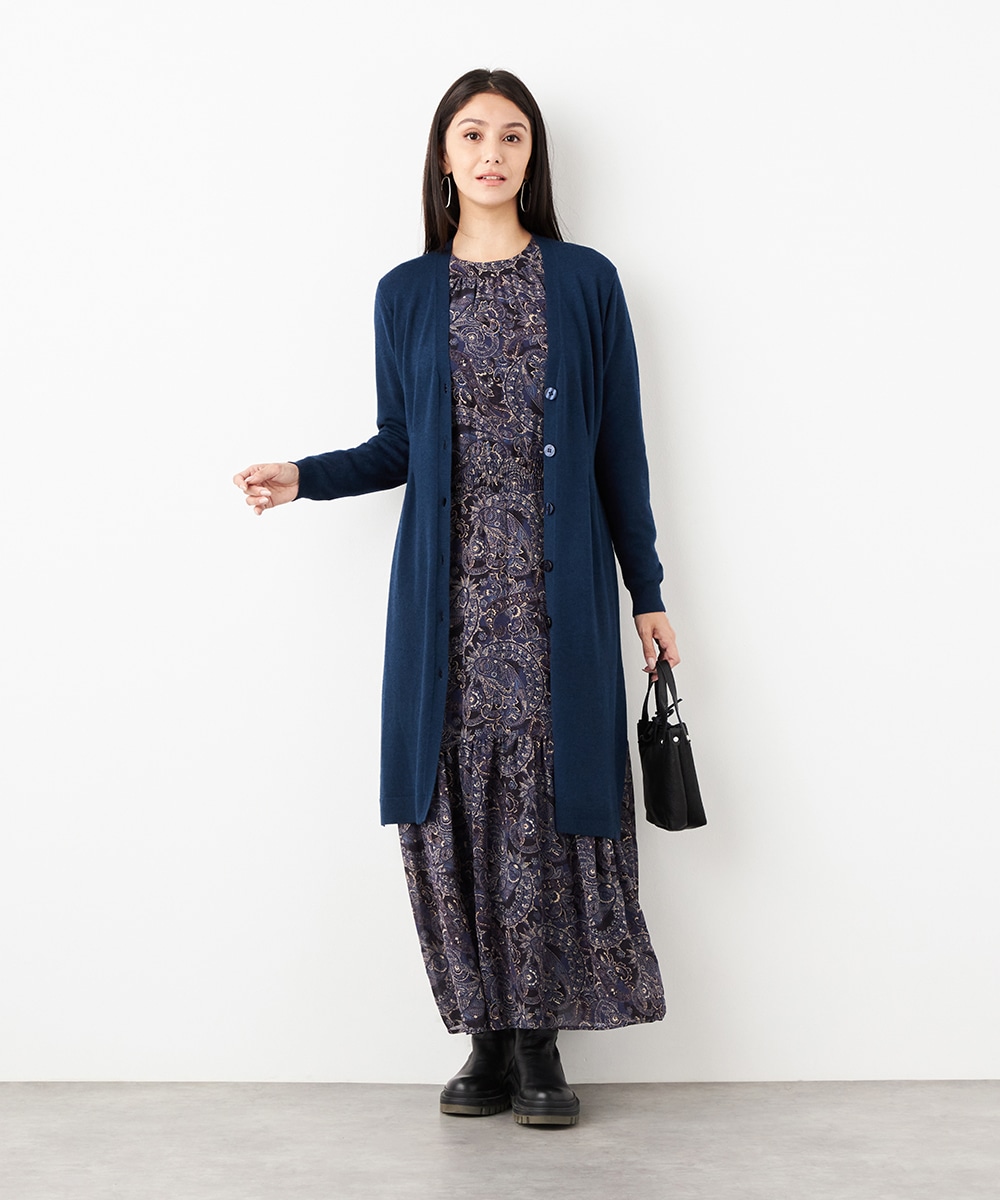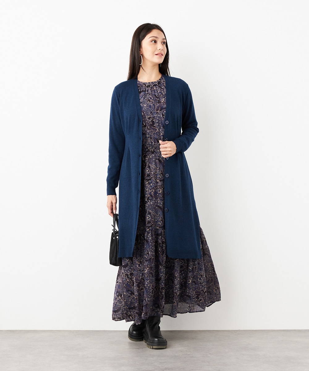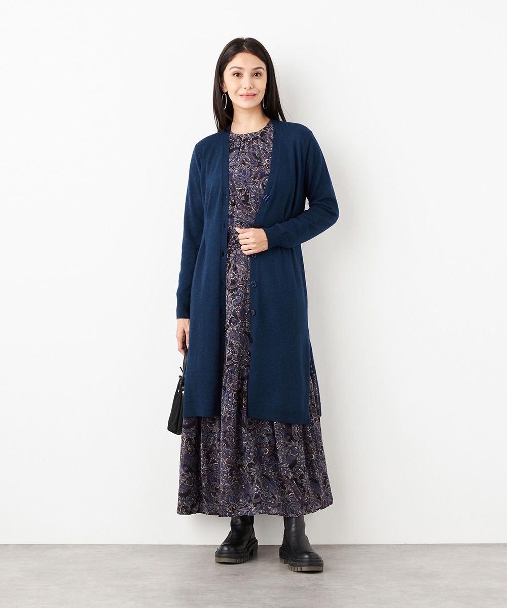 ベーシックカラーにVネックデザイン。着こなしやすいロングカーディガン。
