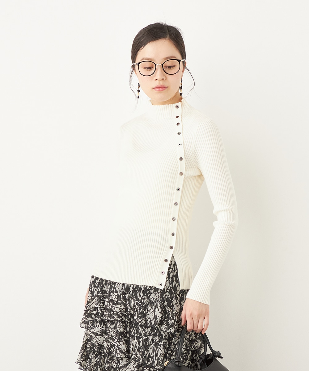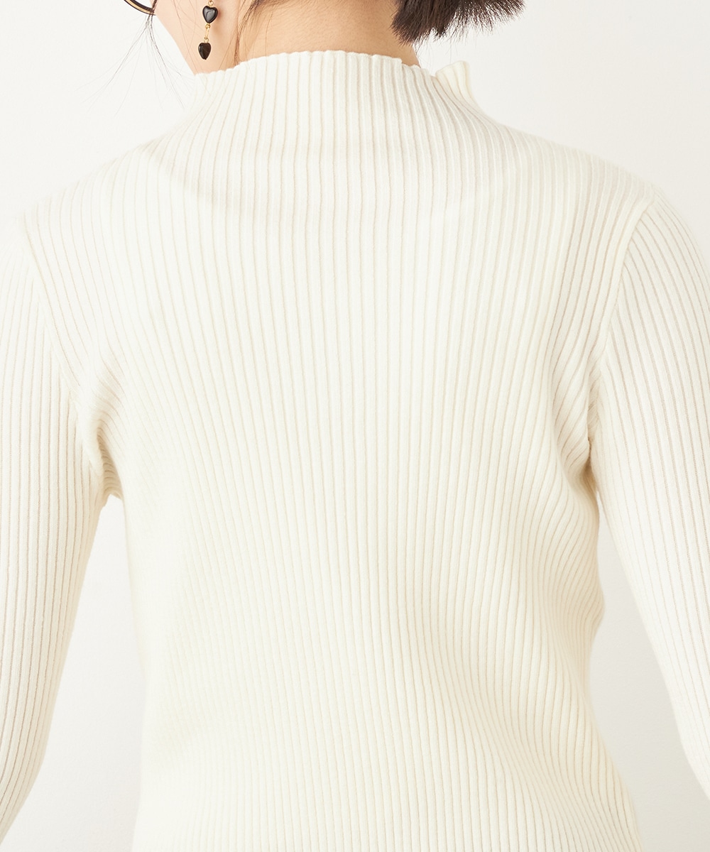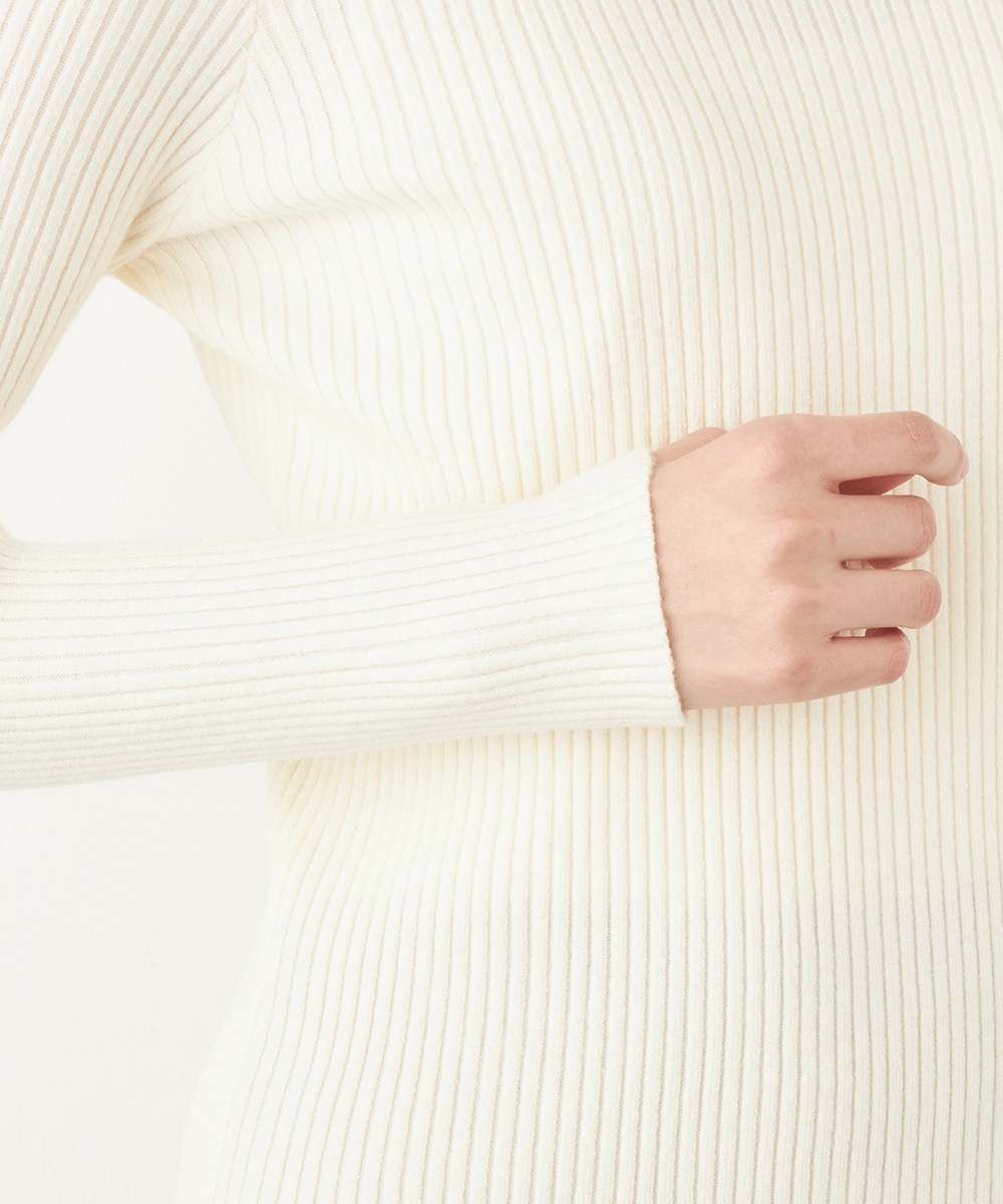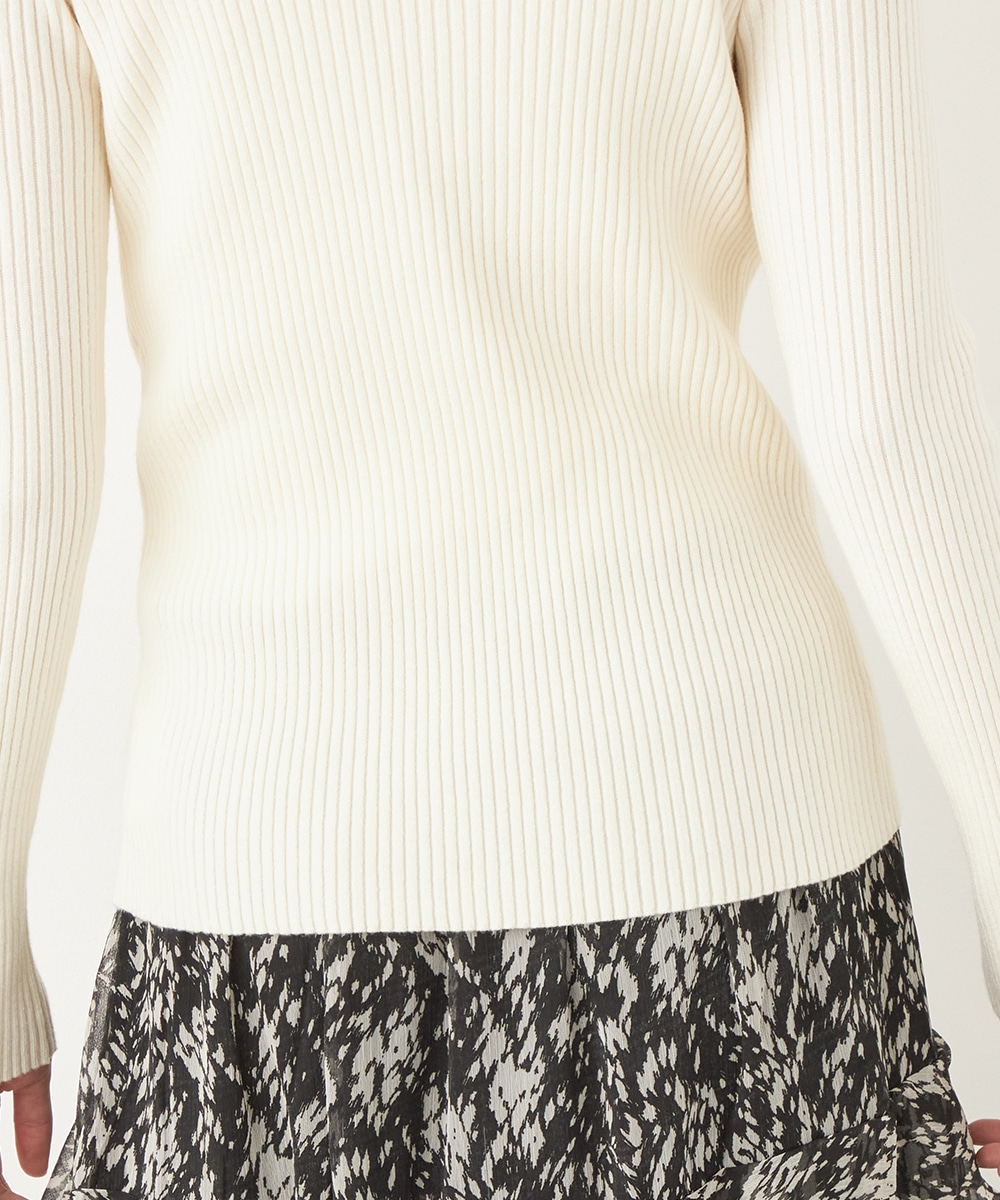 縦ラインを強調するリブ編みに細身のシルエットですっきりと着こなせます。単色使いならではの取り入れやすさやアシンメトリーなデザインのモード感も魅力。ボトムスや羽織のアレンジ次第で普段のカジュアルにも、ちょっとしたお出かけにも活用できる便利なアイテムです。