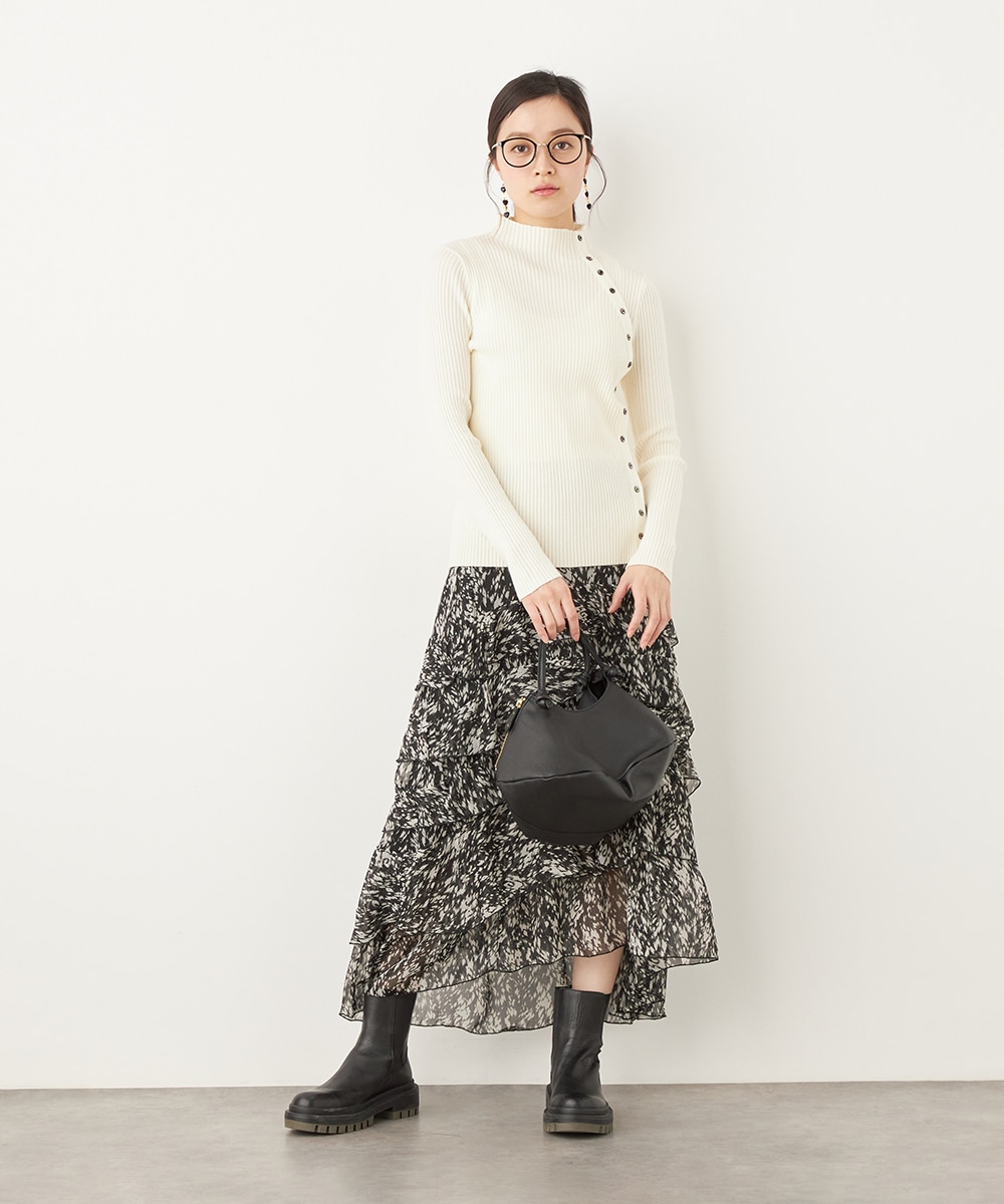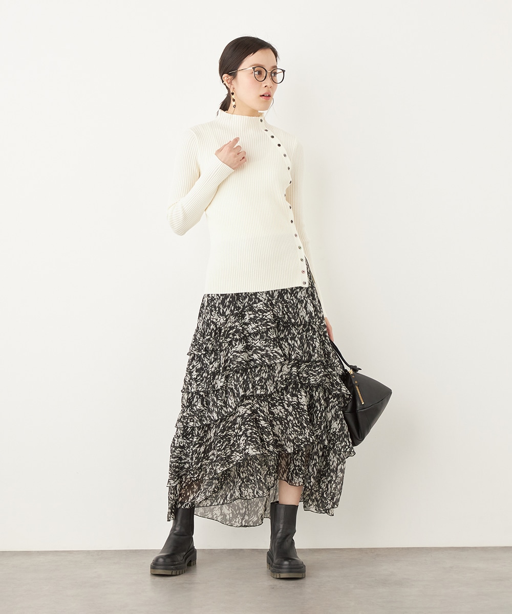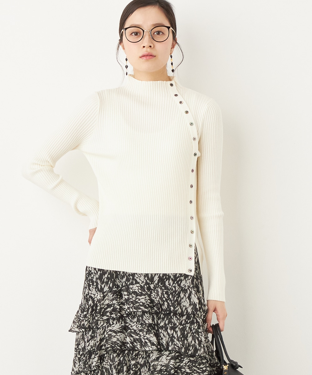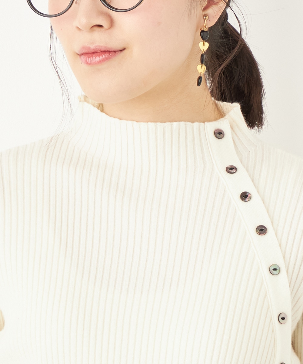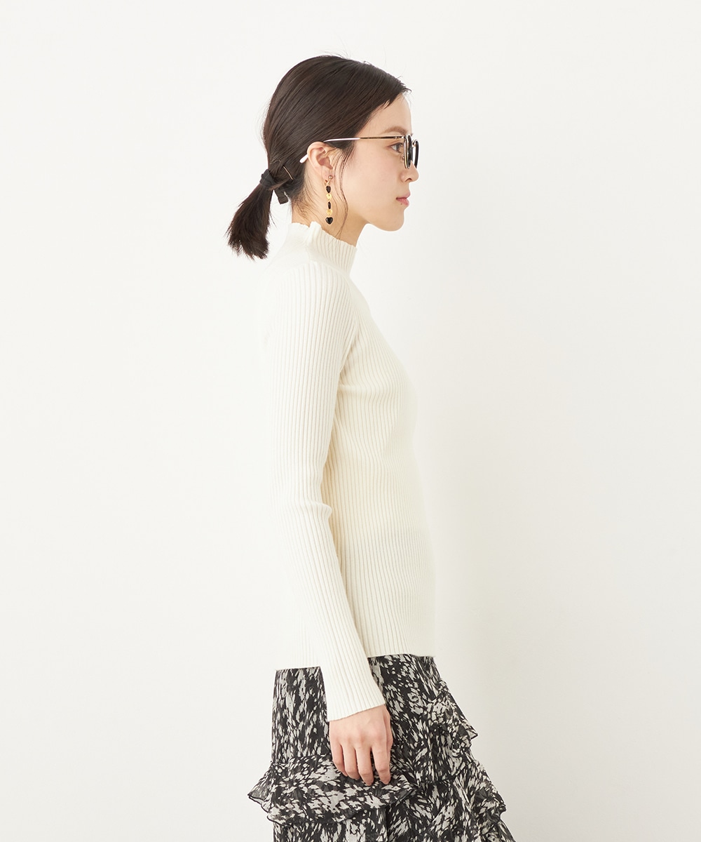 縦ラインを強調するリブ編みに細身のシルエットですっきりと着こなせます。単色使いならではの取り入れやすさやアシンメトリーなデザインのモード感も魅力。ボトムスや羽織のアレンジ次第で普段のカジュアルにも、ちょっとしたお出かけにも活用できる便利なアイテムです。
