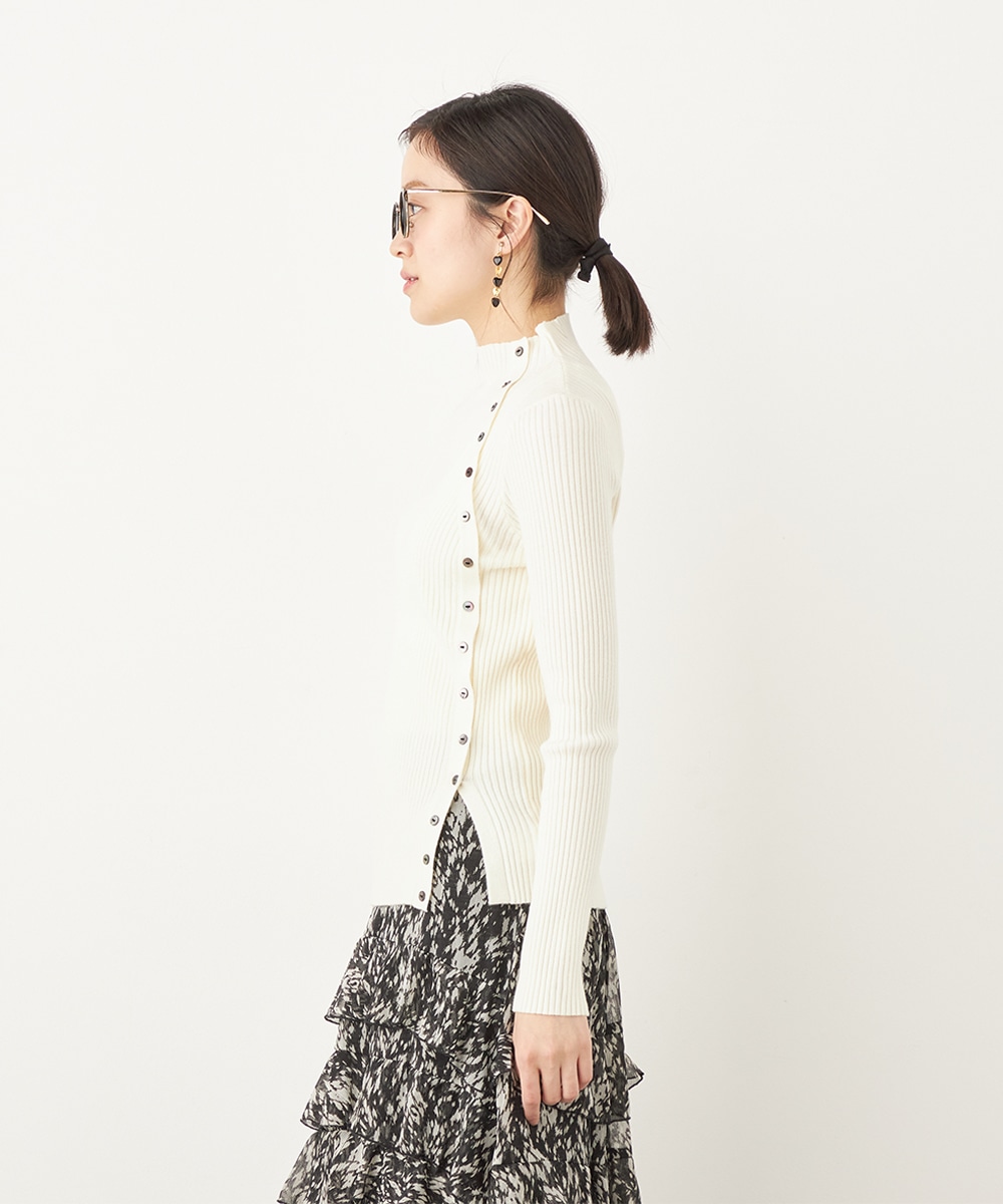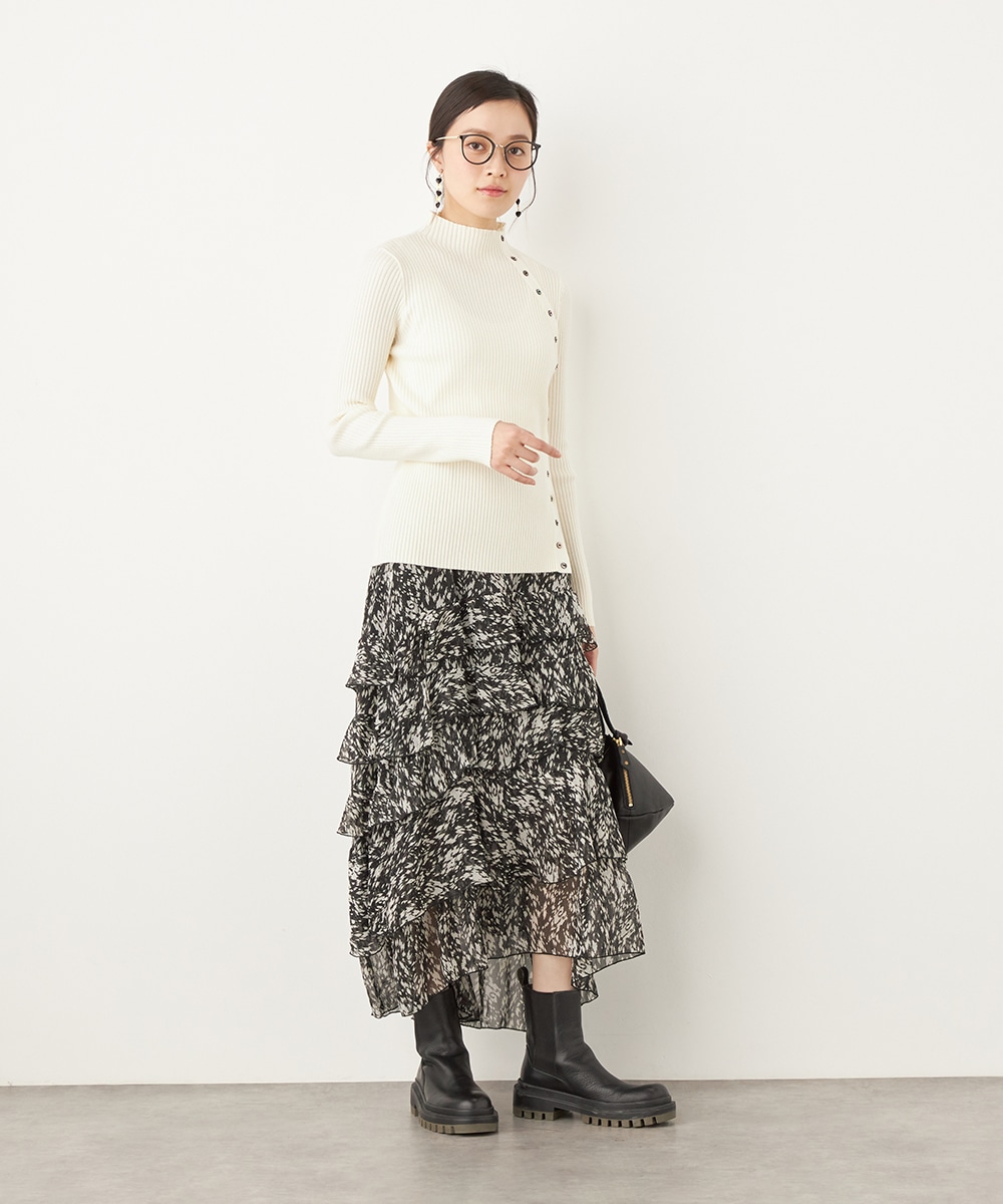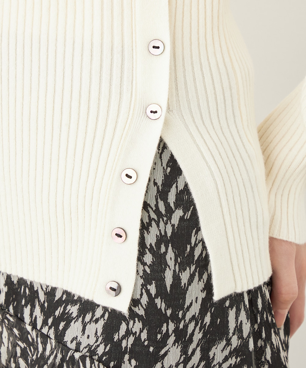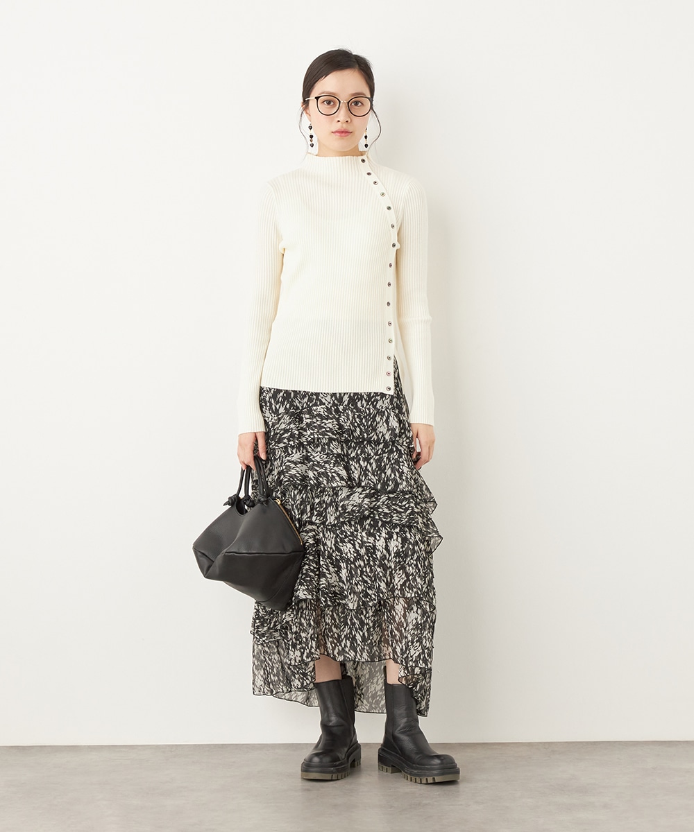 縦ラインを強調するリブ編みに細身のシルエットですっきりと着こなせます。単色使いならではの取り入れやすさやアシンメトリーなデザインのモード感も魅力。ボトムスや羽織のアレンジ次第で普段のカジュアルにも、ちょっとしたお出かけにも活用できる便利なアイテムです。