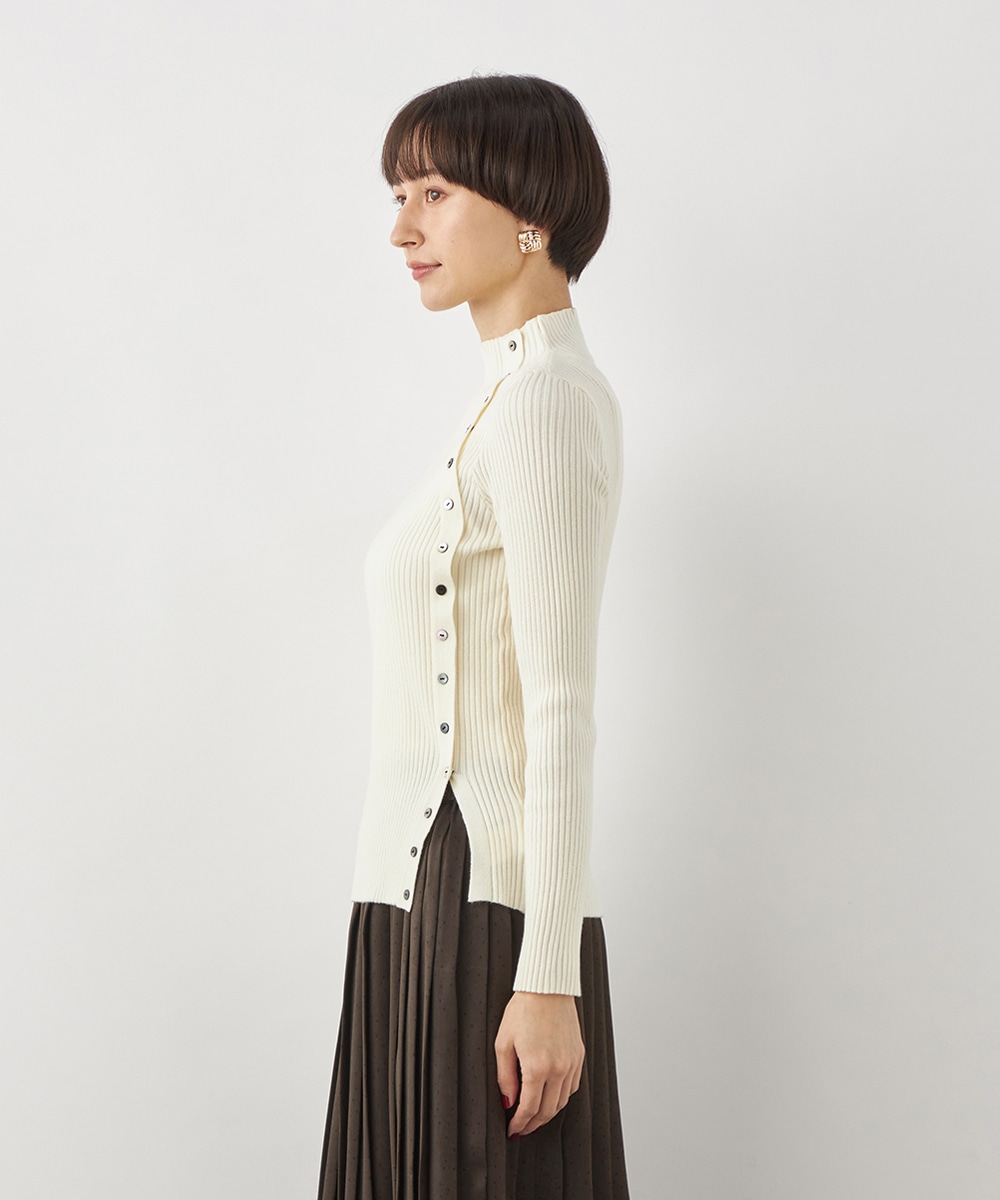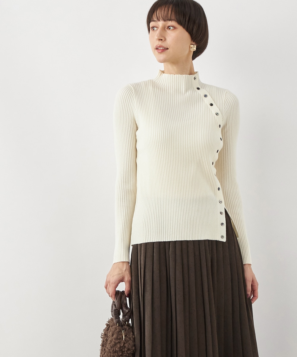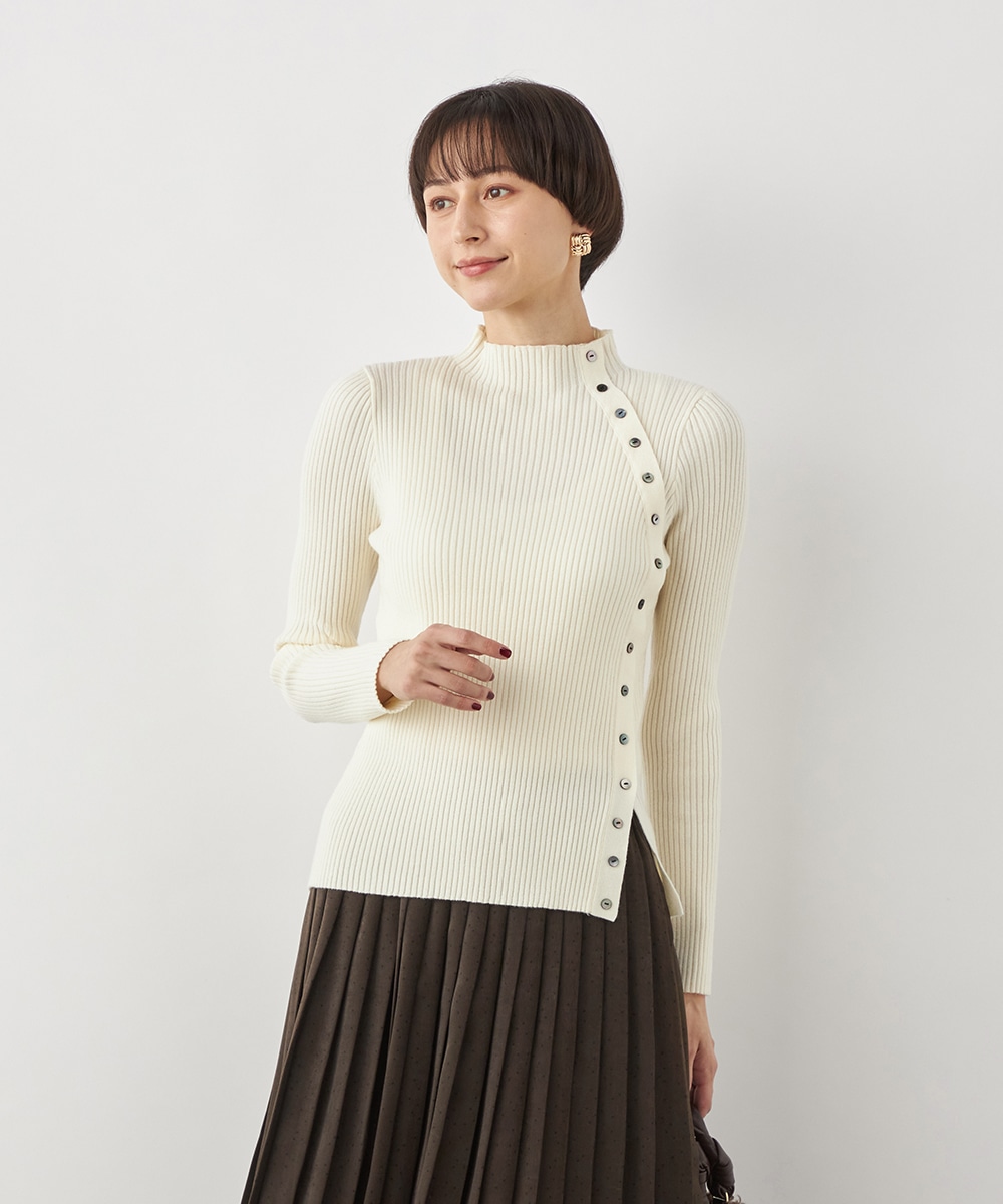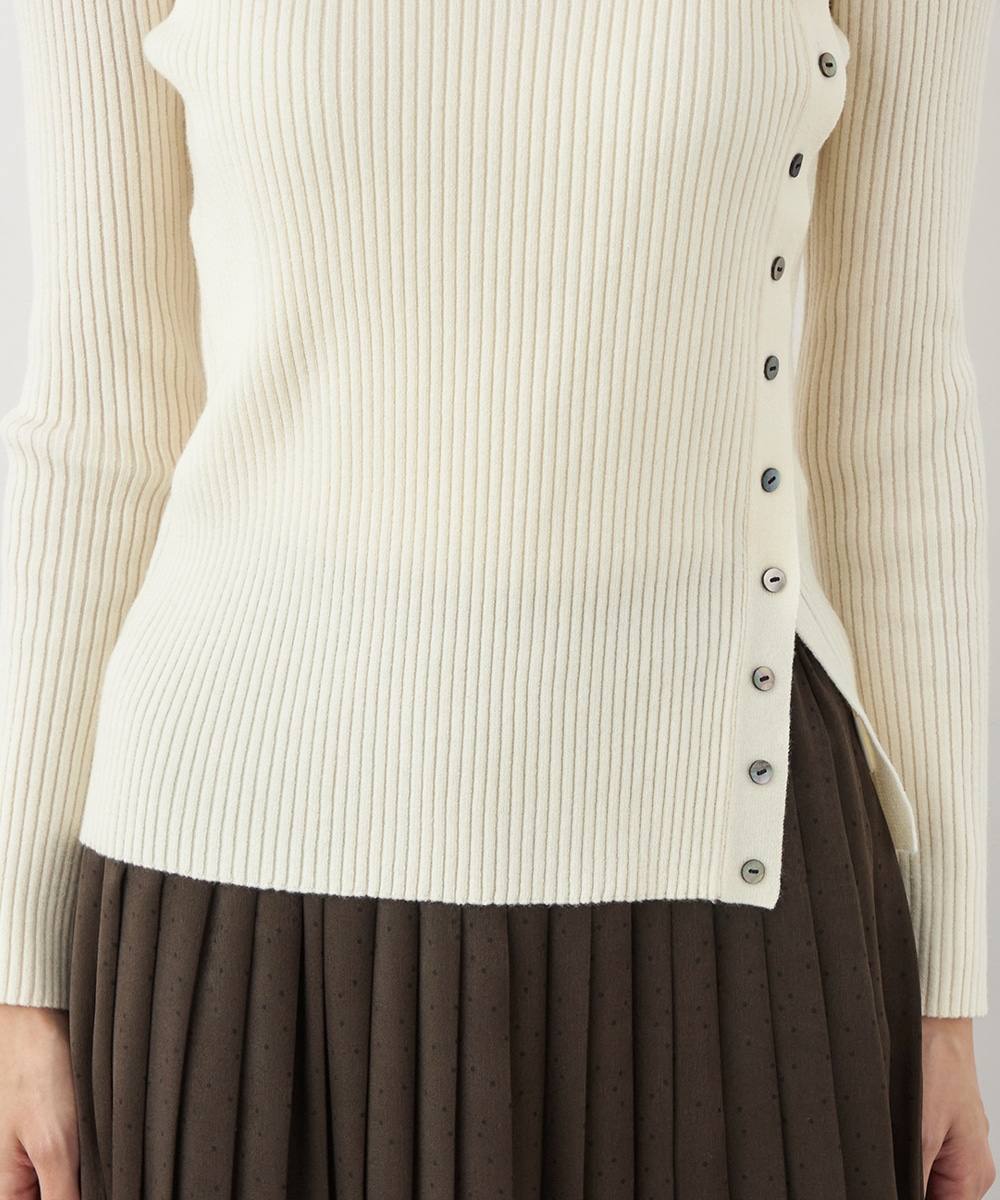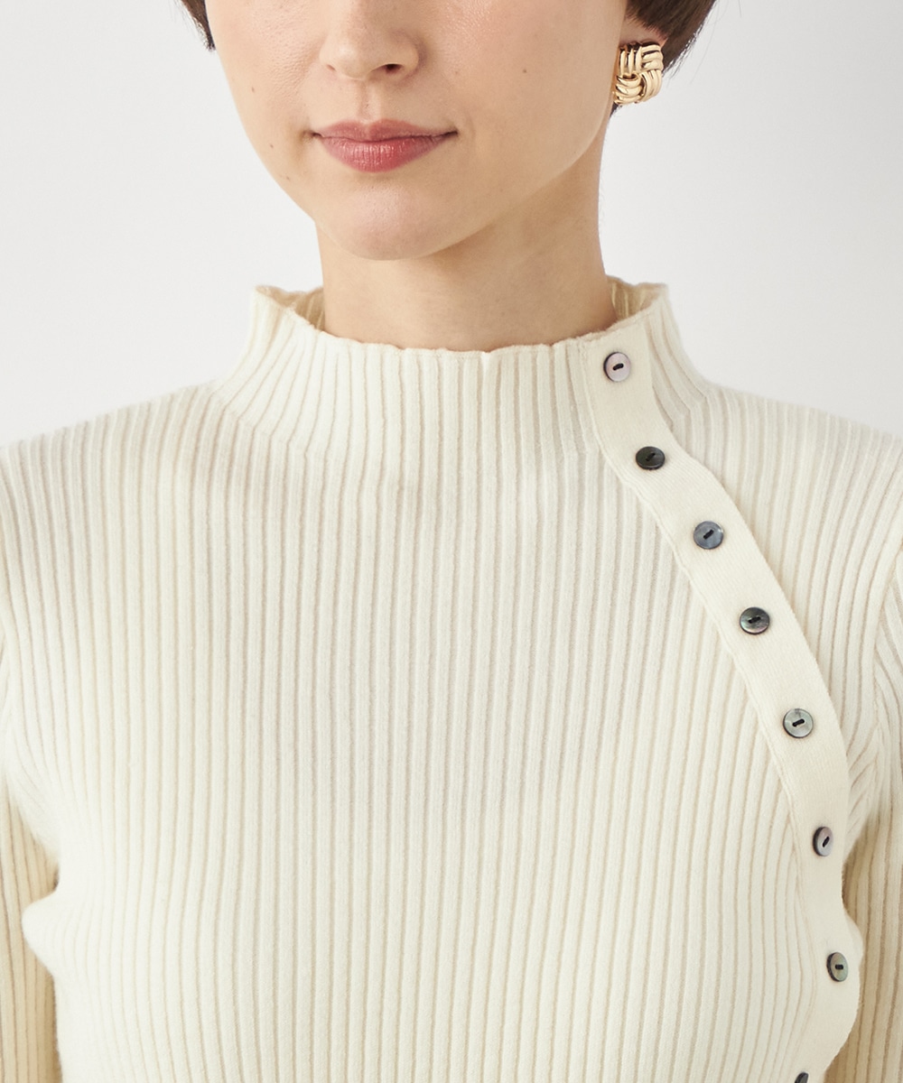 アシンメトリーなルックがモードな印象。ボタンディテールを贅沢に施したリブニット。
