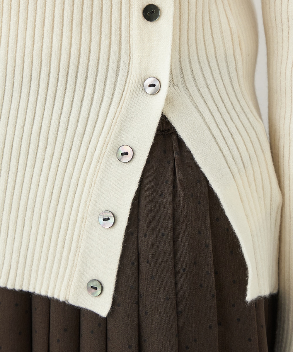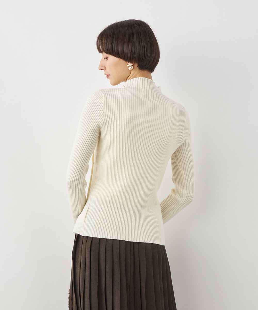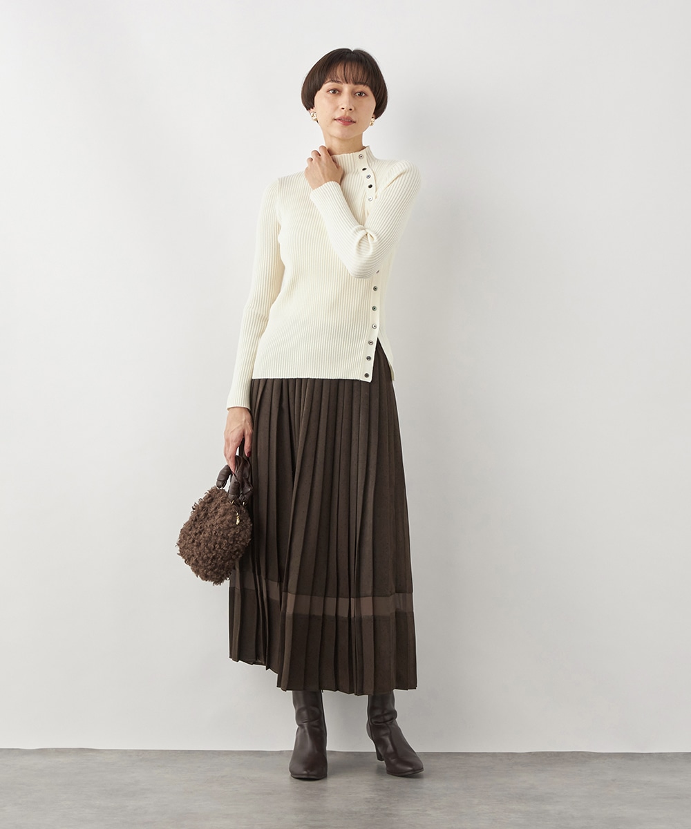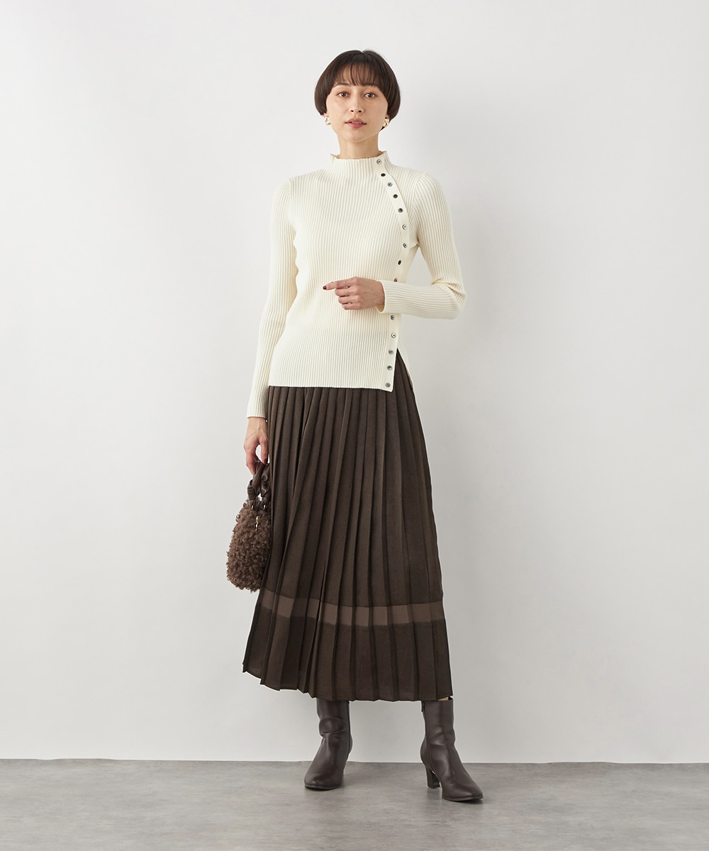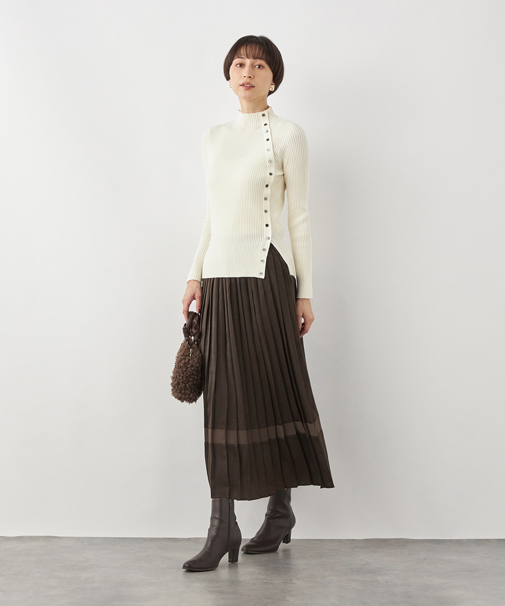 アシンメトリーなルックがモードな印象。ボタンディテールを贅沢に施したリブニット。