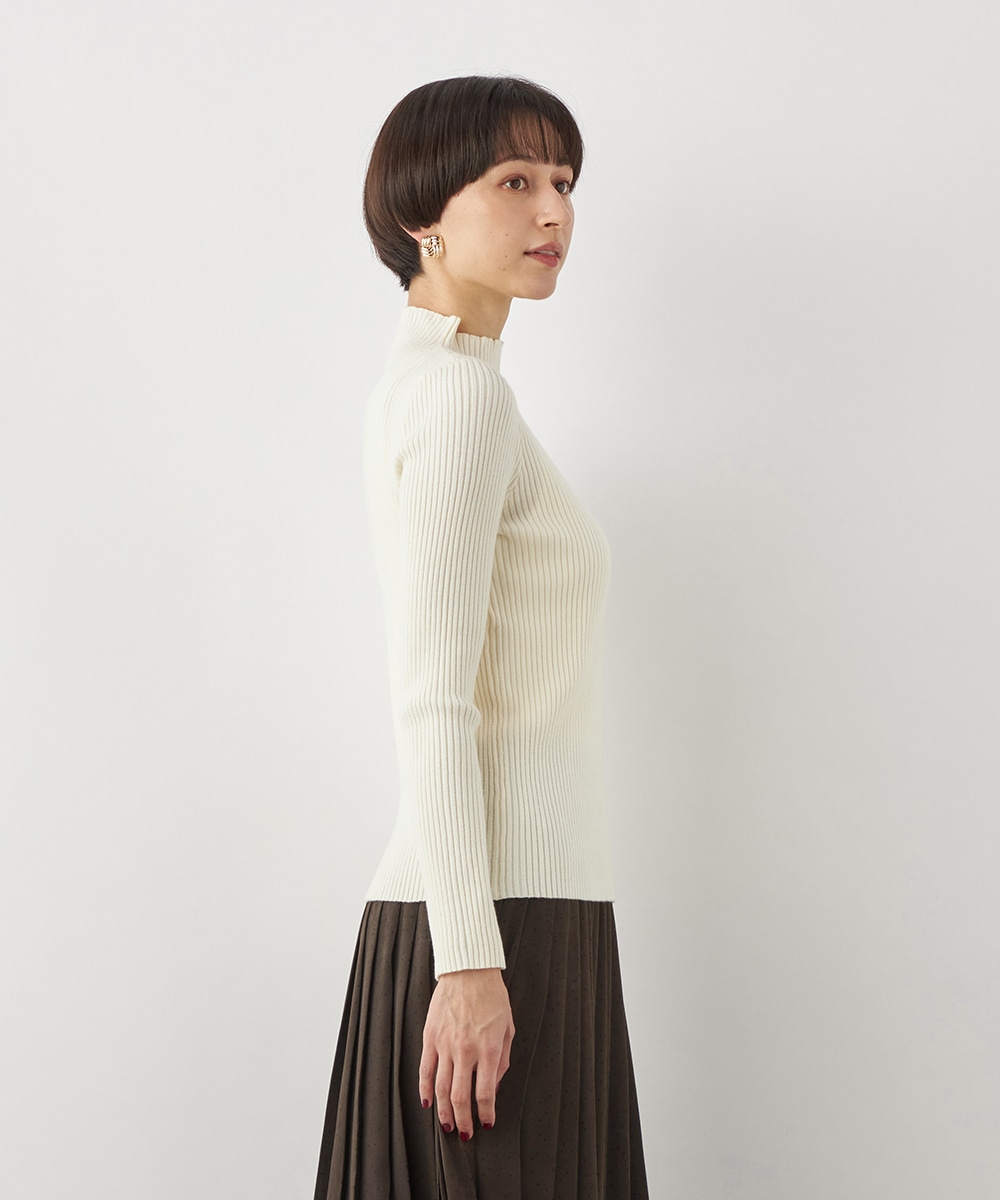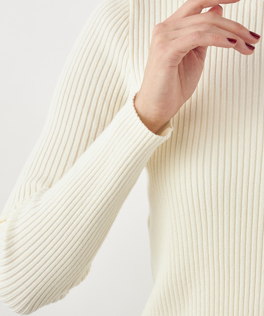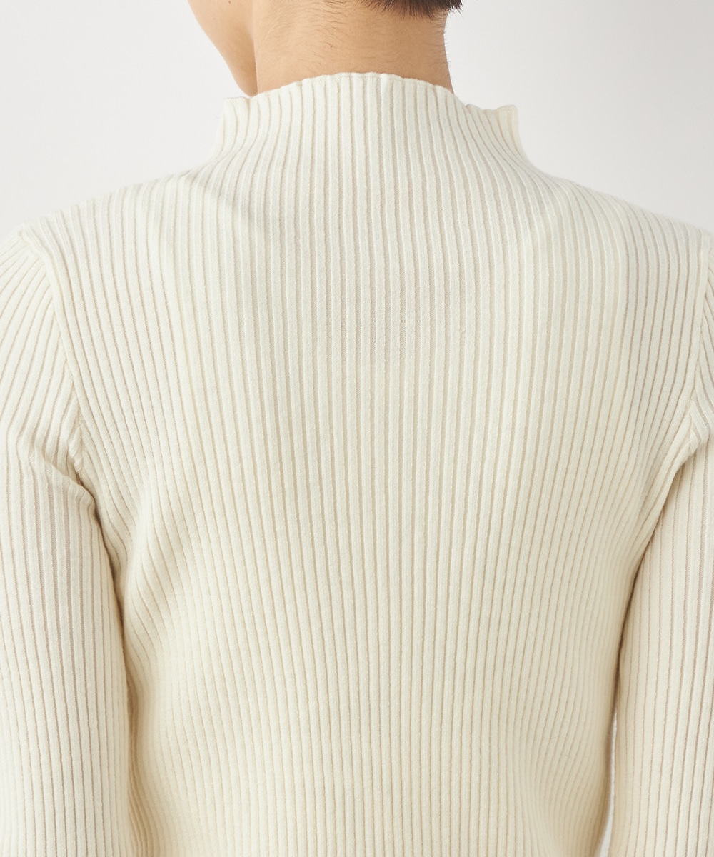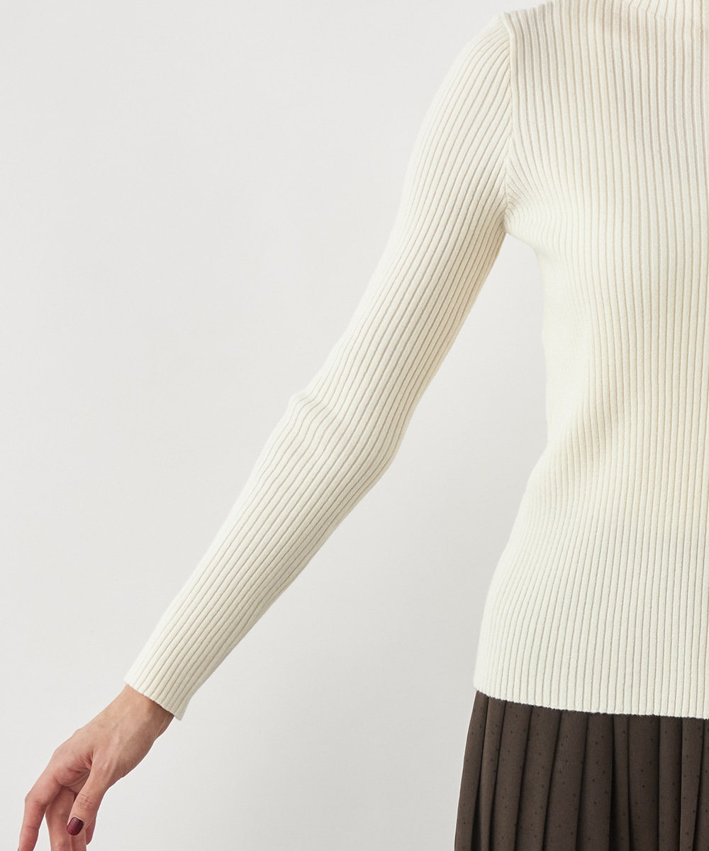 ベーシックな単色使いながらも存在感のあるアイテムです。細幅のリブ編みとタイトなシルエットですっきりと着こなせます。大人っぽくシックにまとまるハイネックを採用。裾にはスリットがデザインされており、ウエストアウトで一枚着として着用するのもおすすめです。