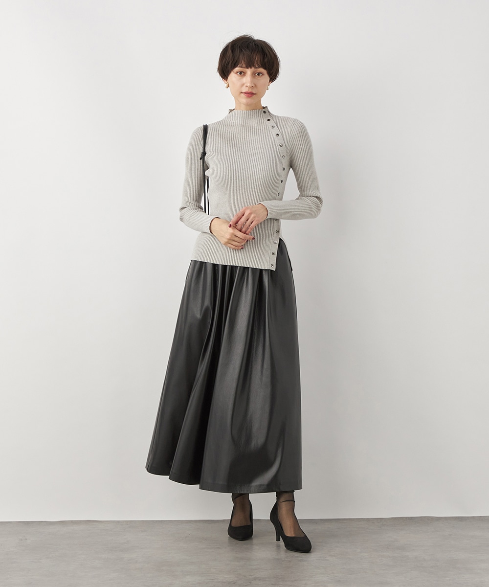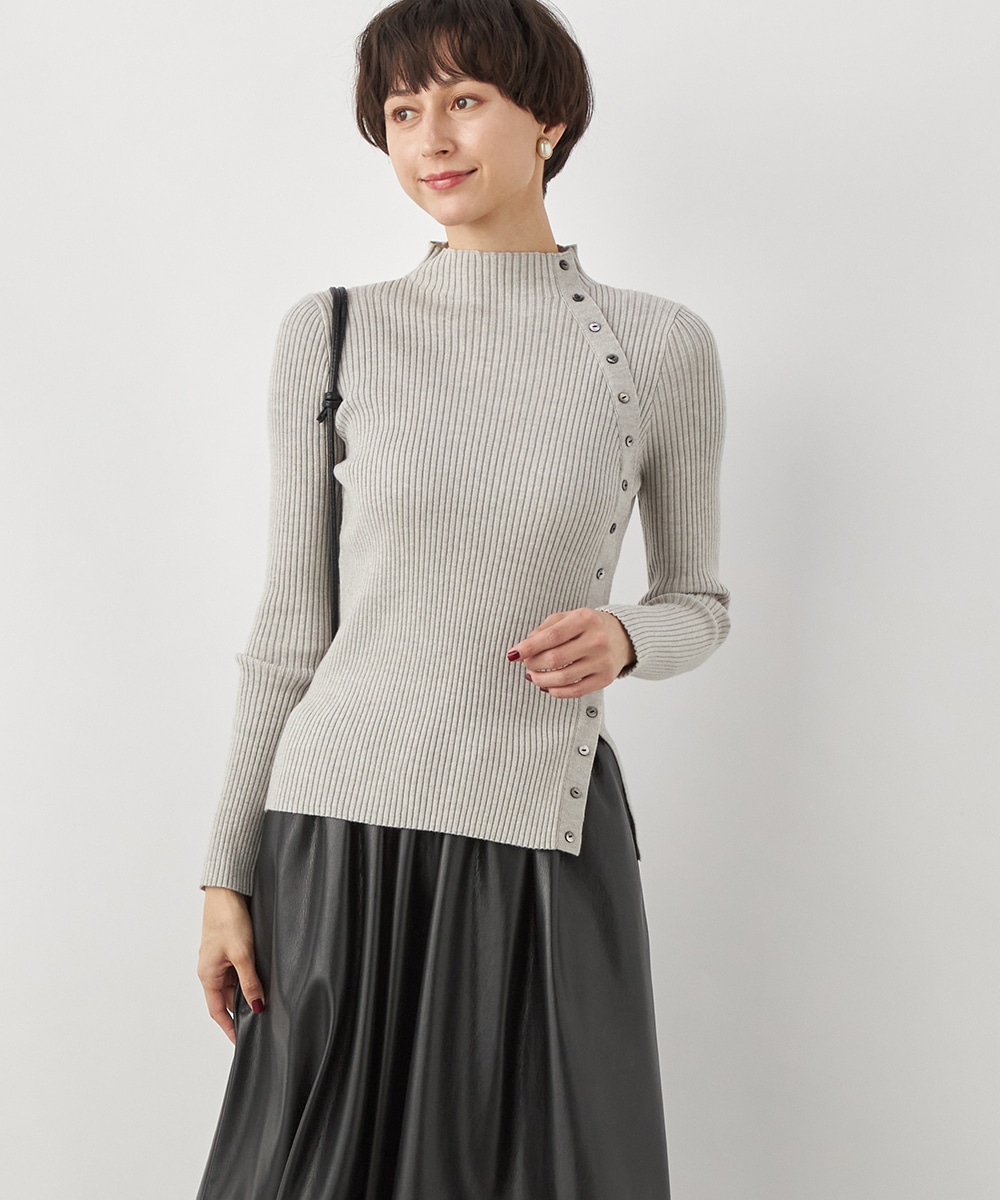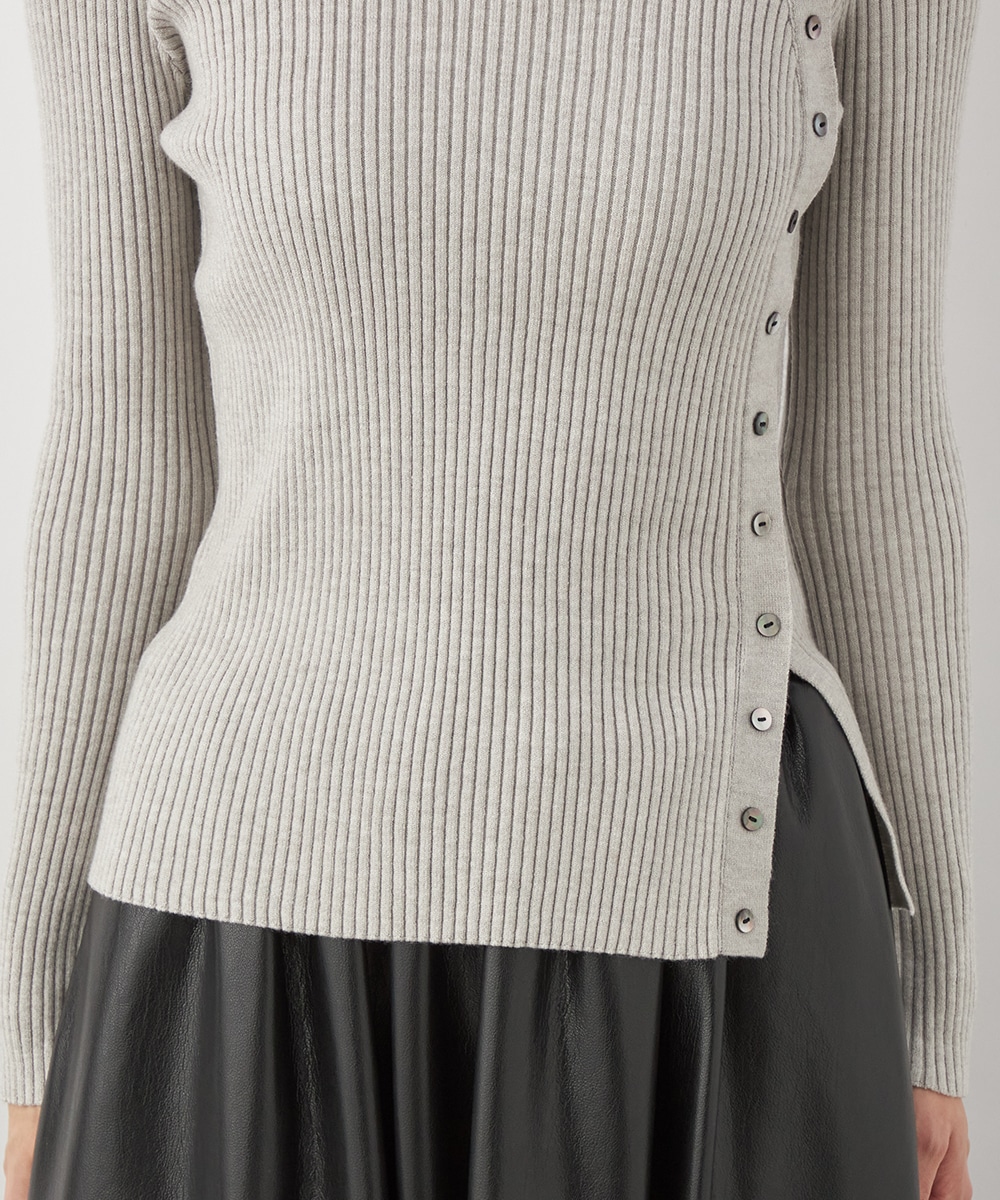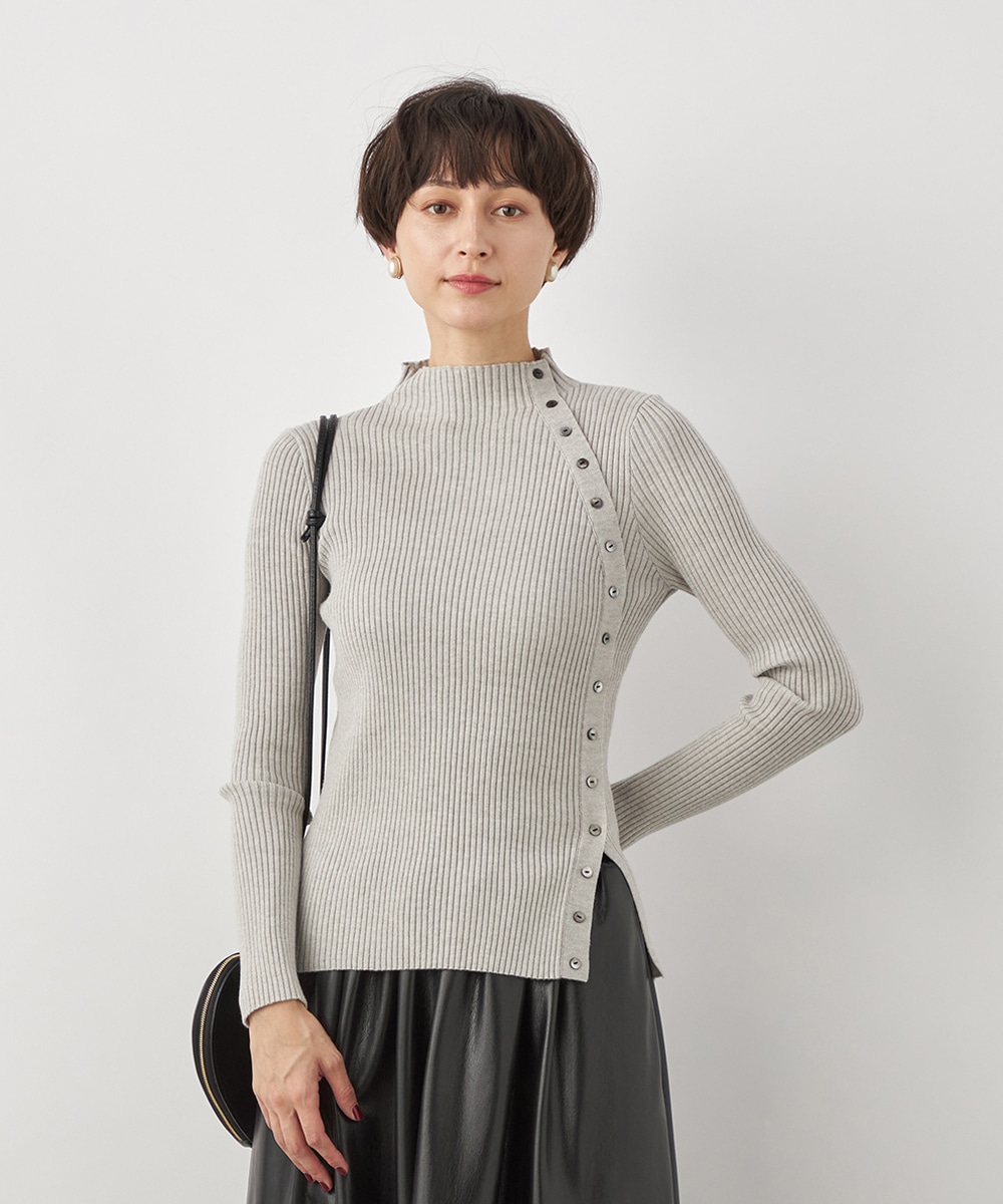 アシンメトリーなルックがモードな印象。ボタンディテールを贅沢に施したリブニット。