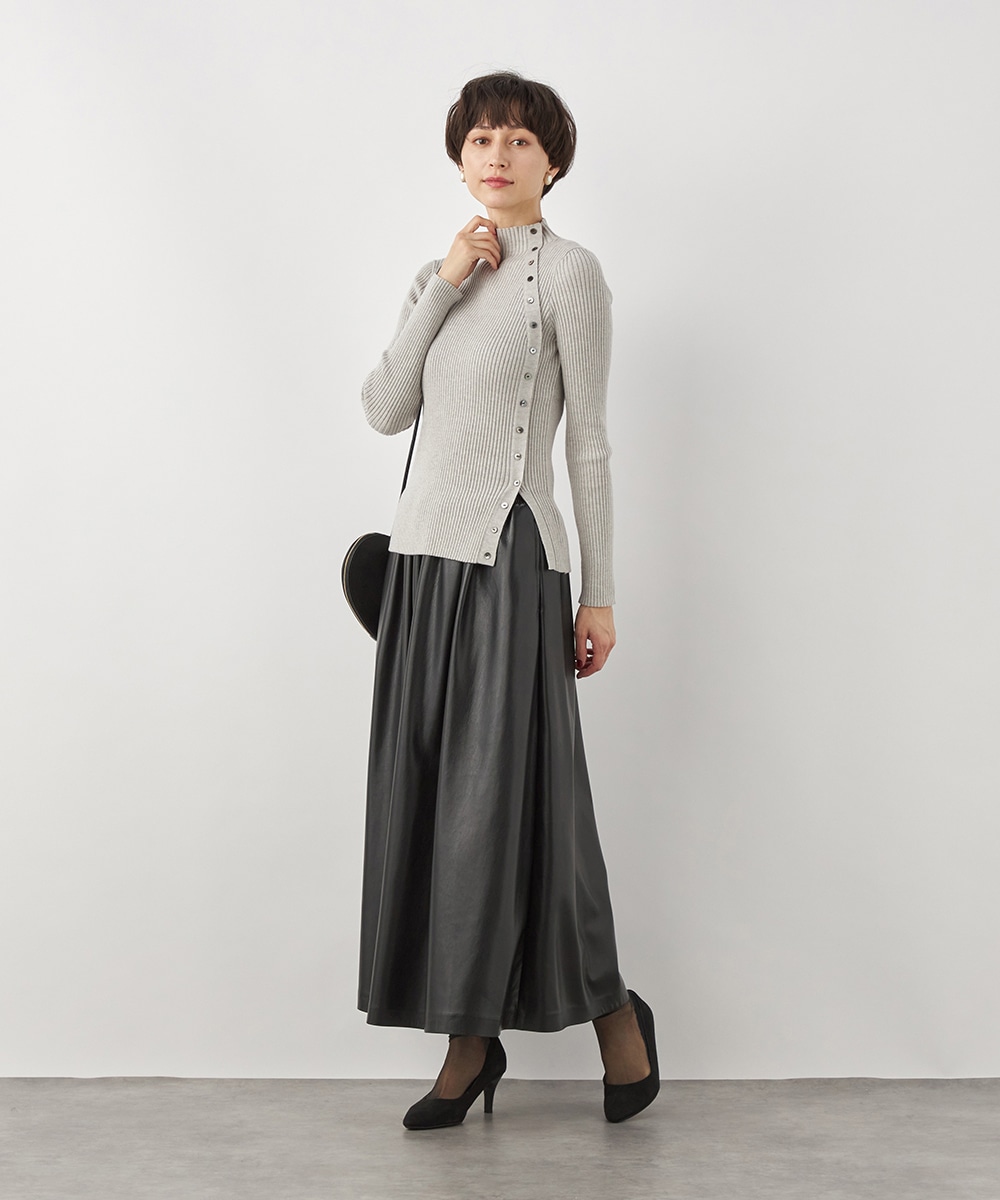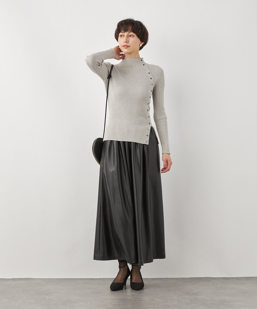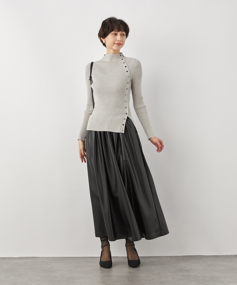 アシンメトリーなルックがモードな印象。ボタンディテールを贅沢に施したリブニット。