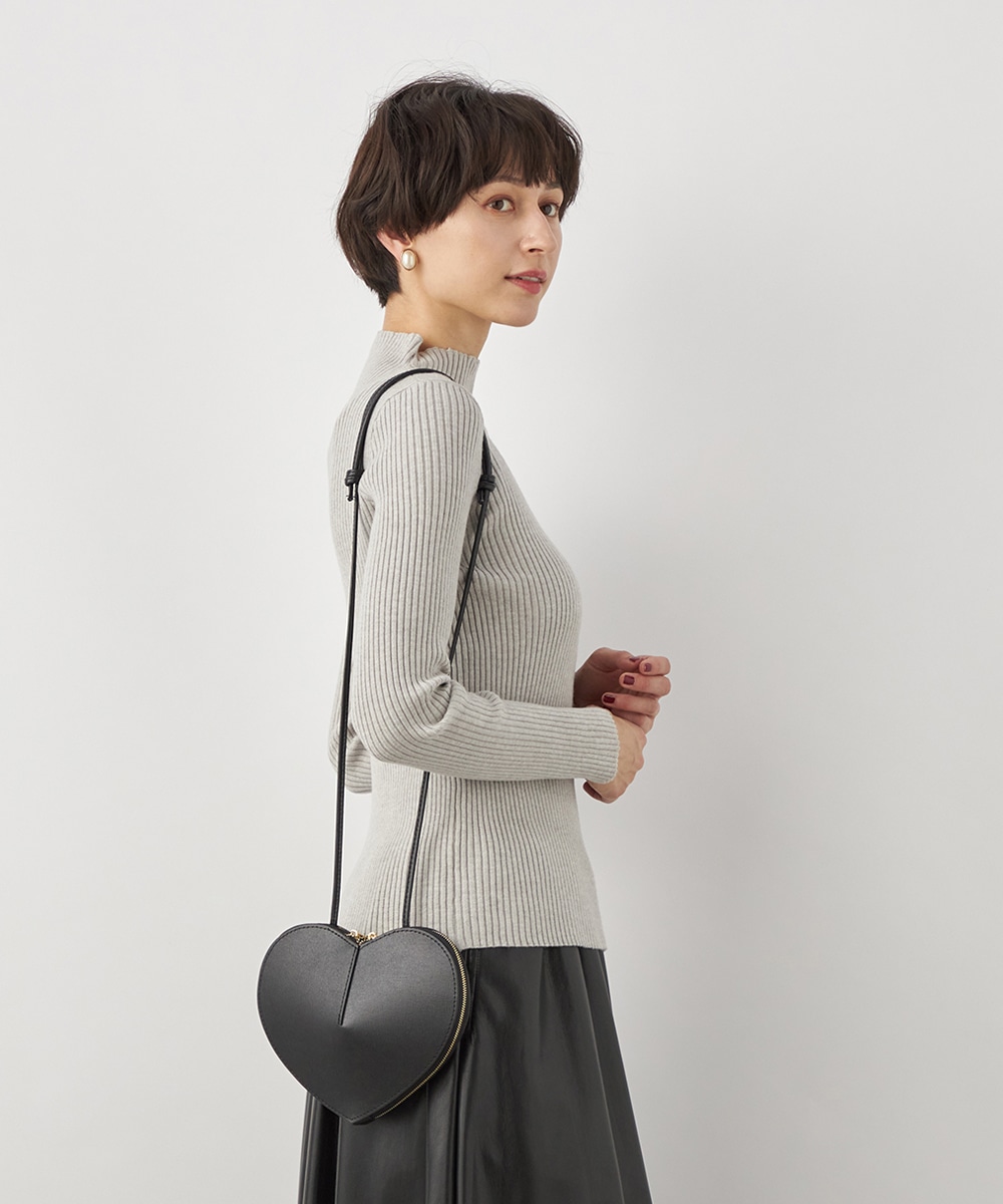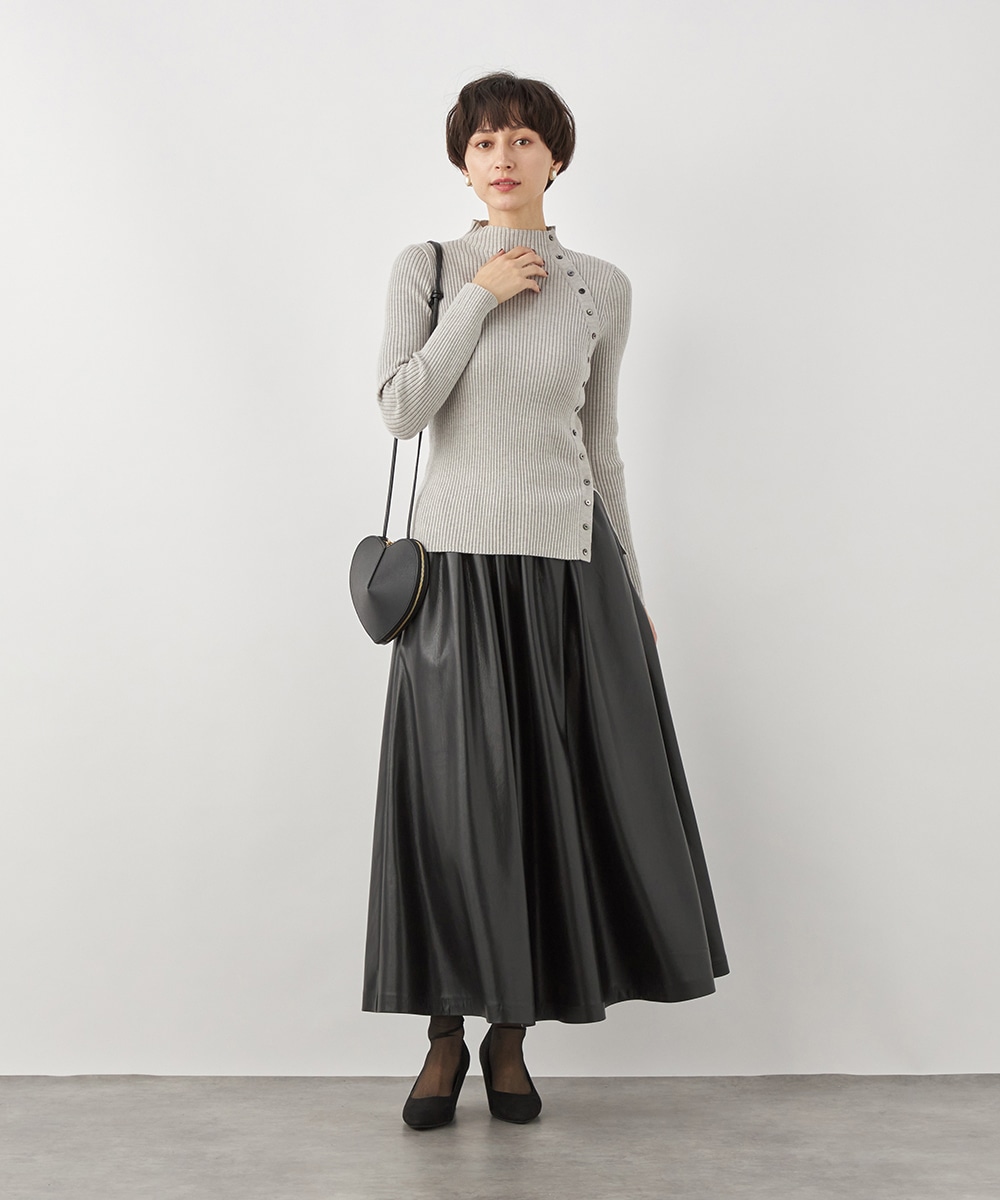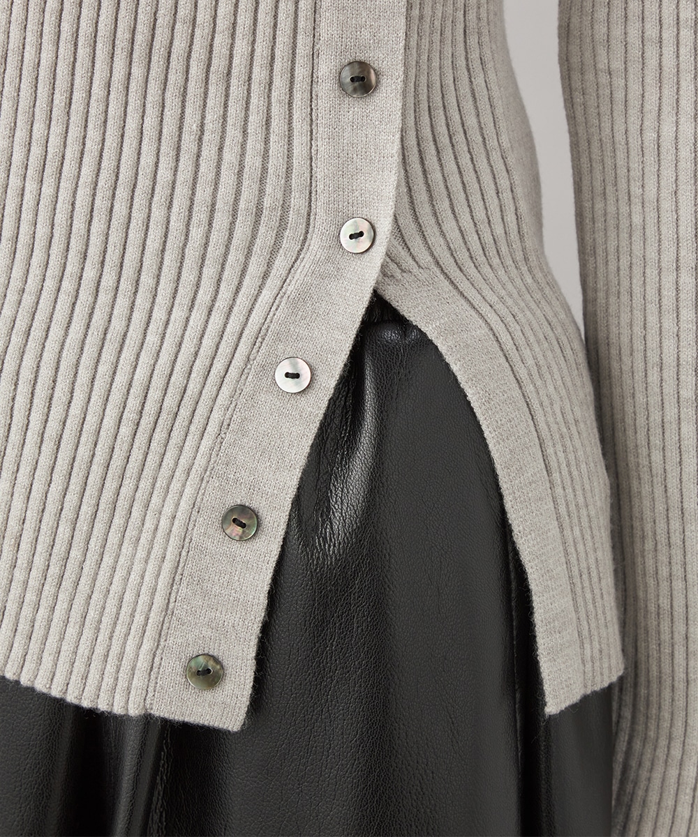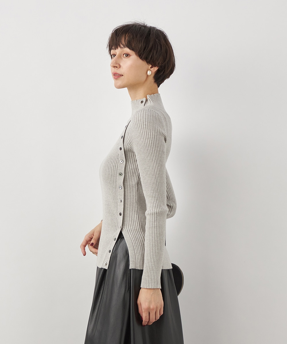 アシンメトリーなルックがモードな印象。ボタンディテールを贅沢に施したリブニット。