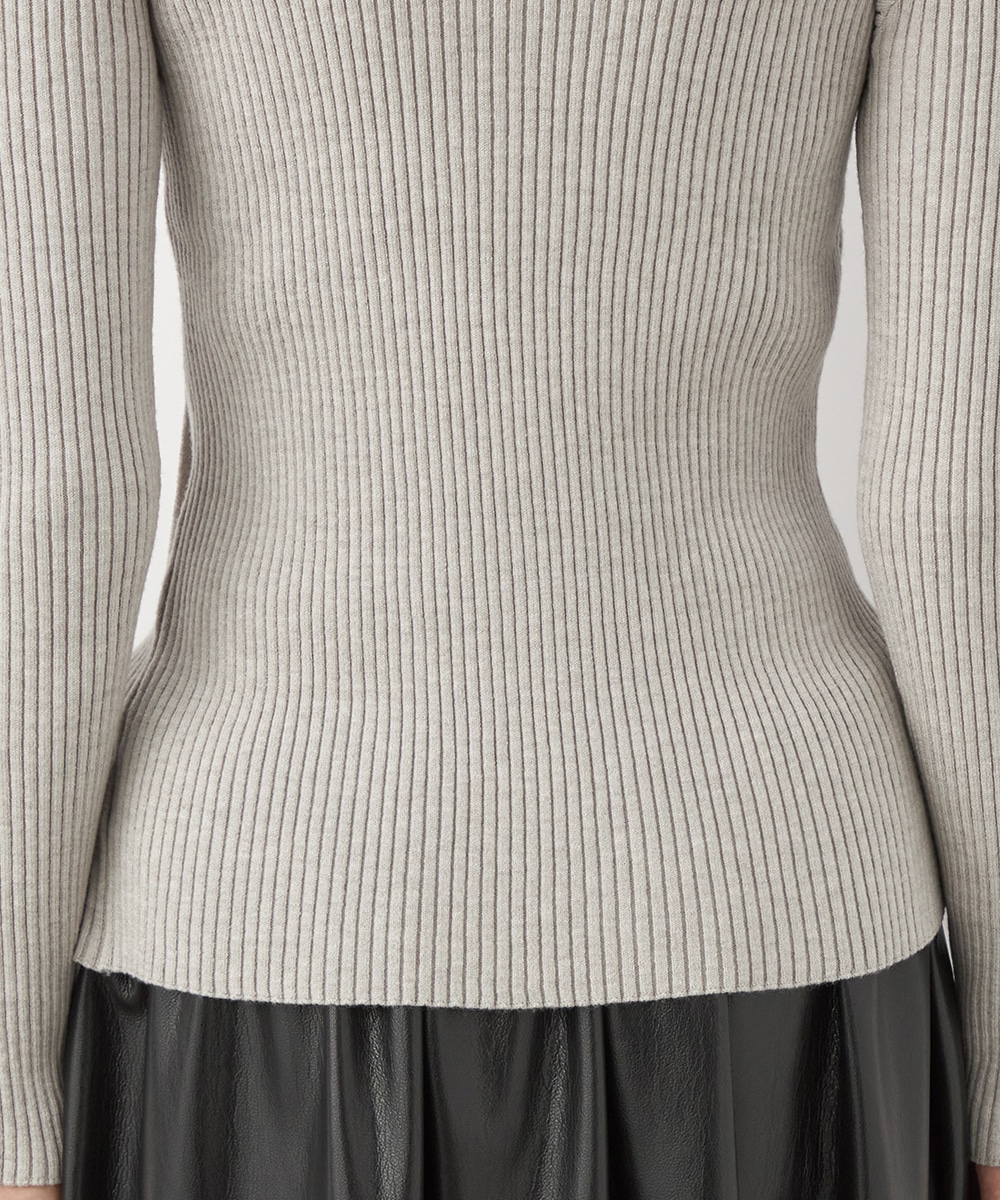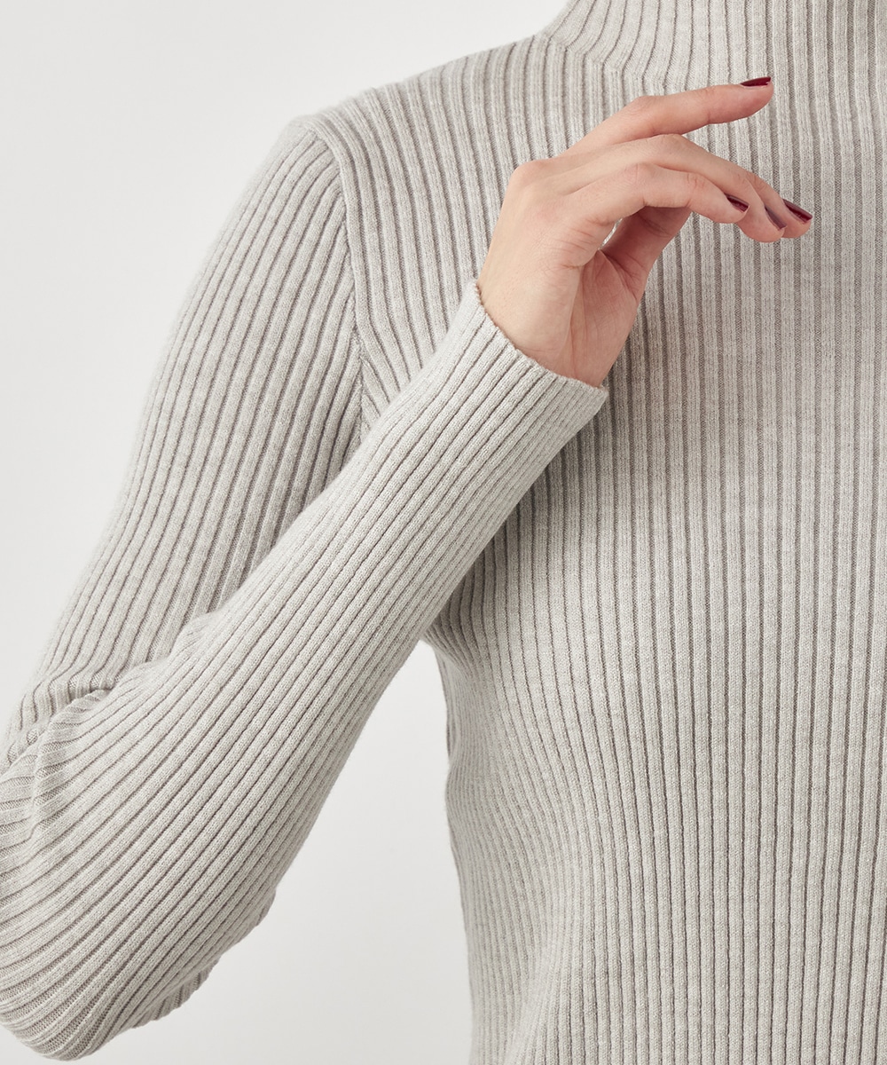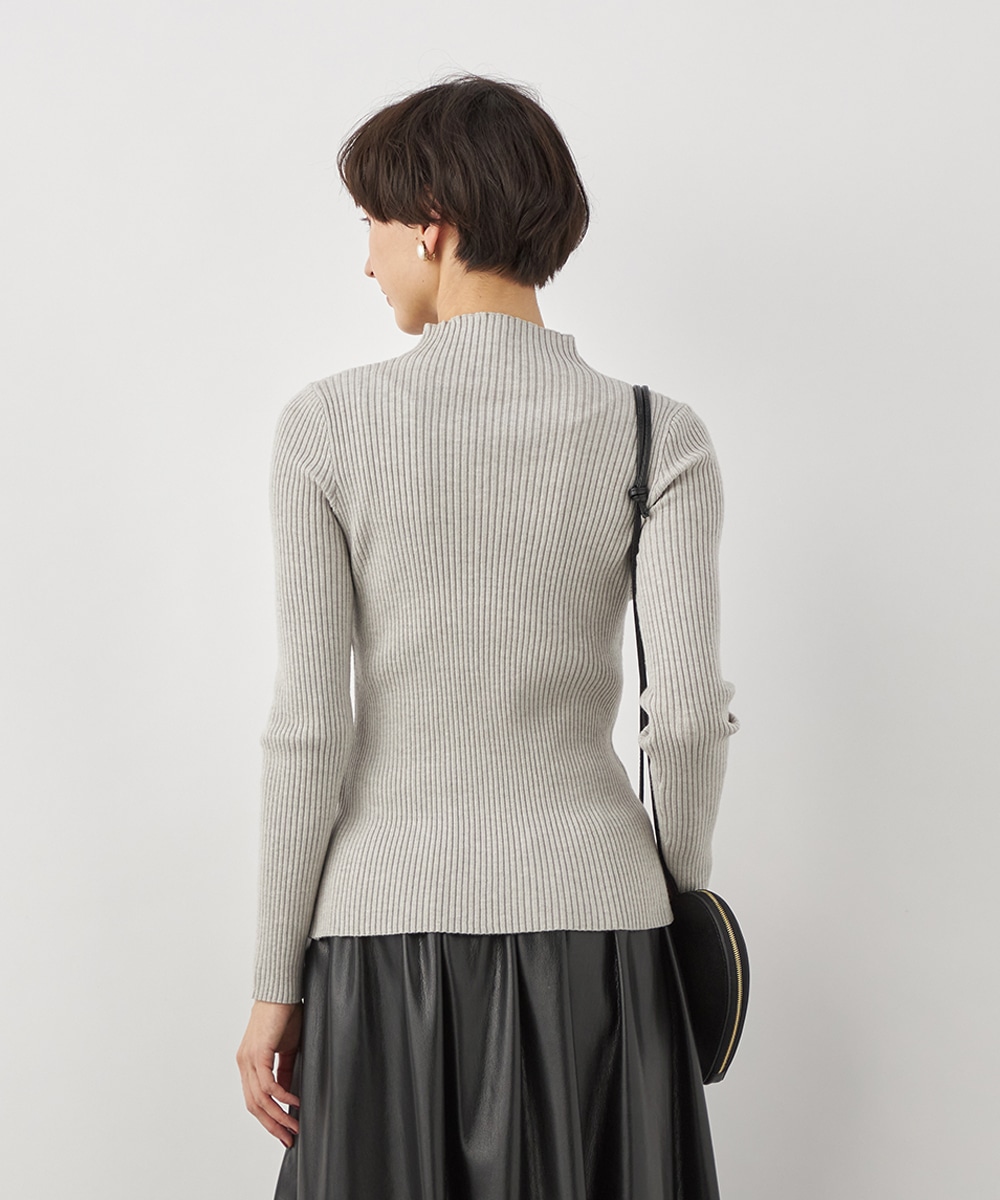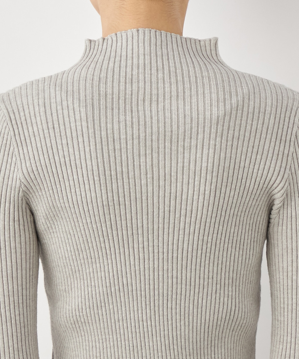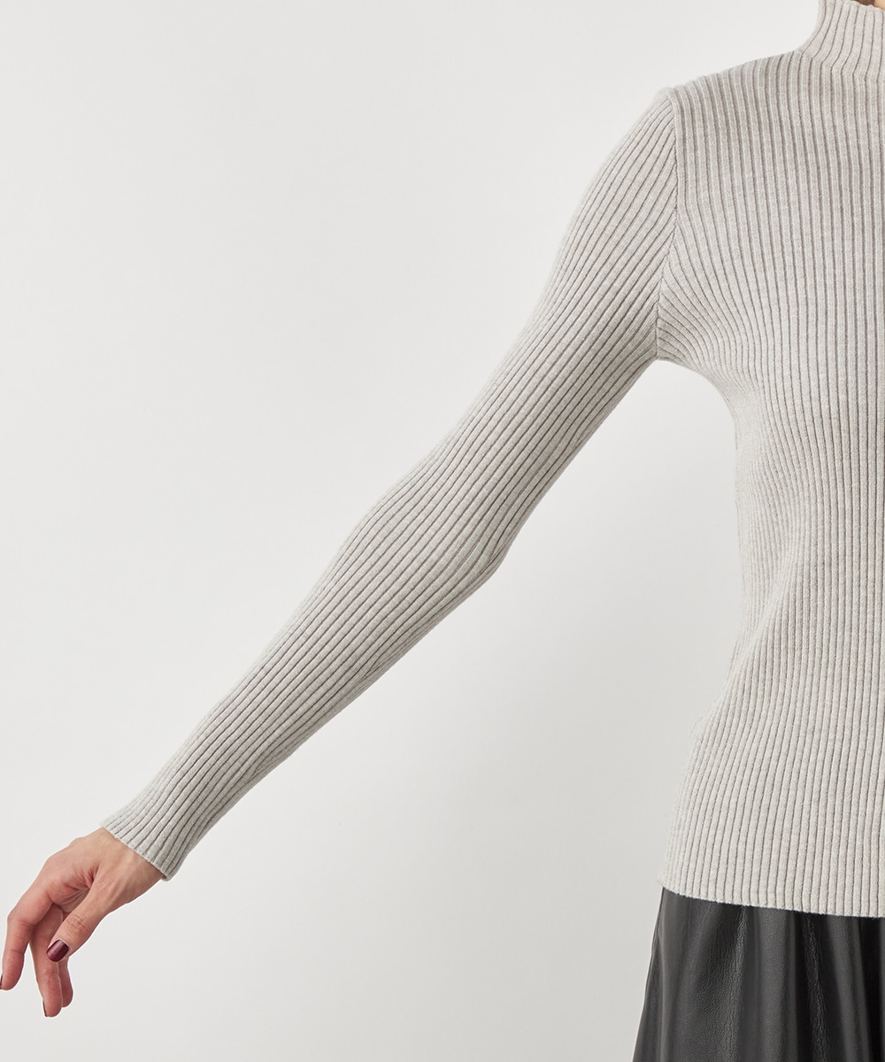 ベーシックな単色使いながらも存在感のあるアイテムです。細幅のリブ編みとタイトなシルエットですっきりと着こなせます。大人っぽくシックにまとまるハイネックを採用。裾にはスリットがデザインされており、ウエストアウトで一枚着として着用するのもおすすめです。