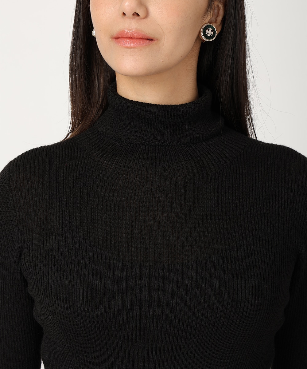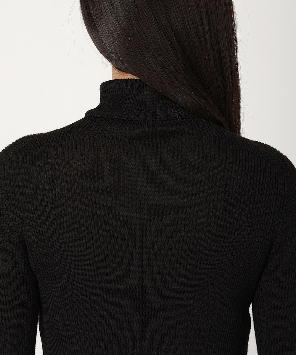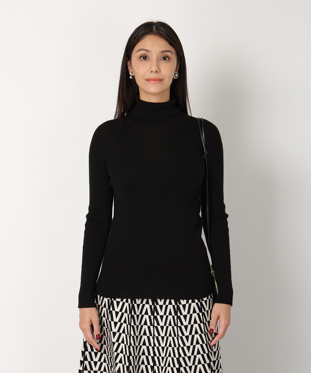 縫い目のないホールガーメント製法は、ふっくらと立体感があり優しい着心地が魅力です。程よい高さのタートルネックが顔周りを華やかに魅せ、ブラックカラーが引き締め効果にも。一枚やレイヤードなど、ロングシーズンに重宝します。