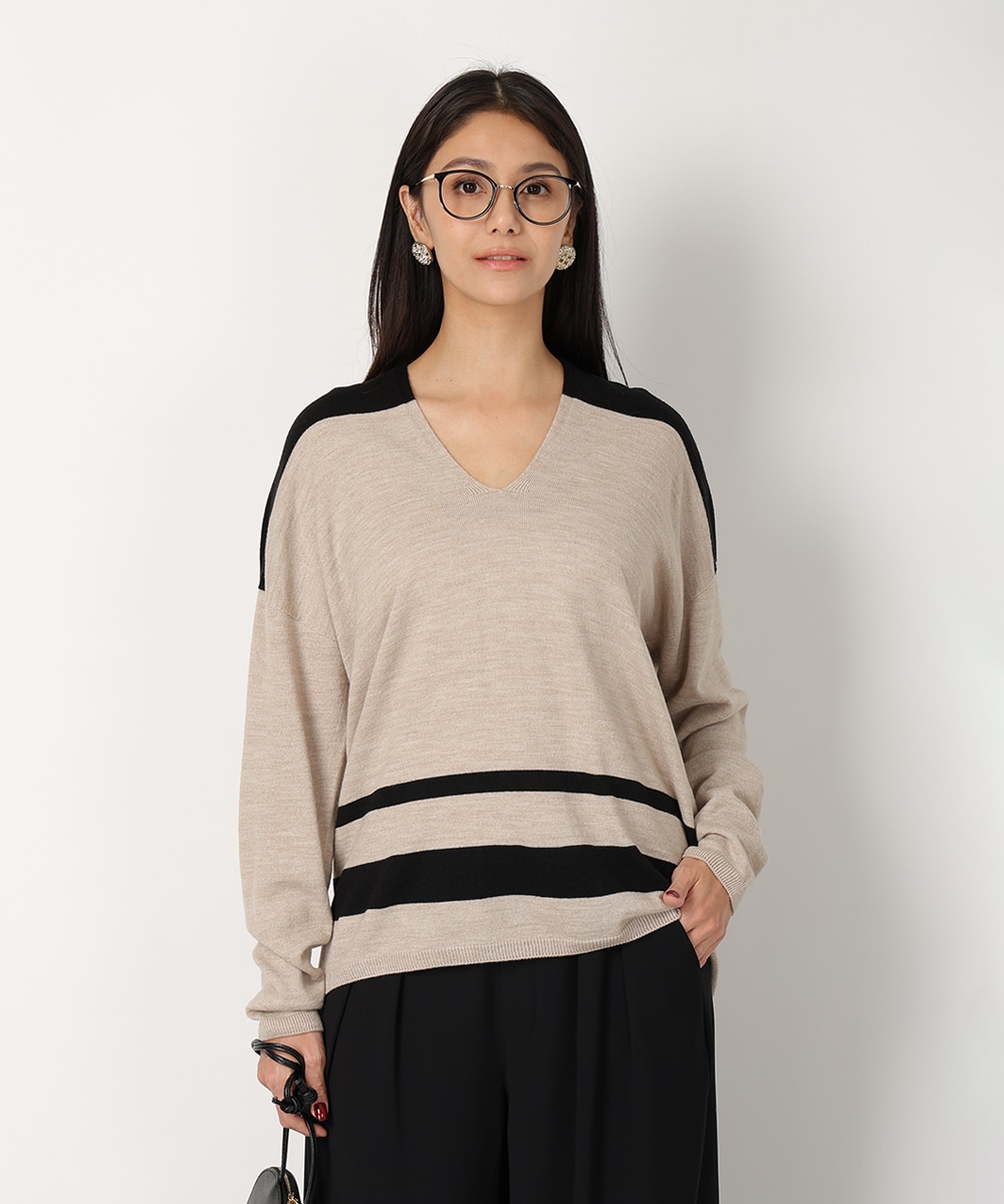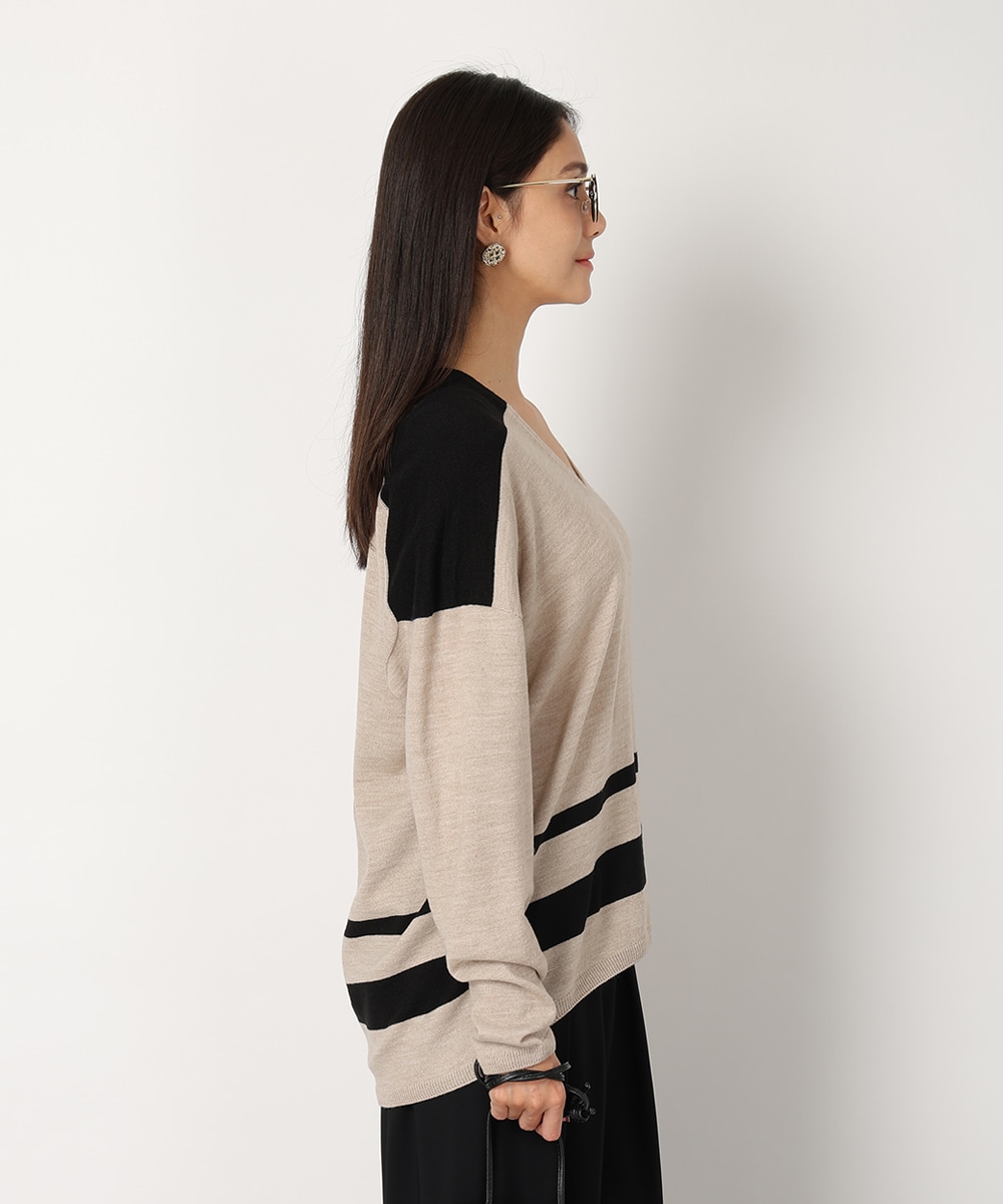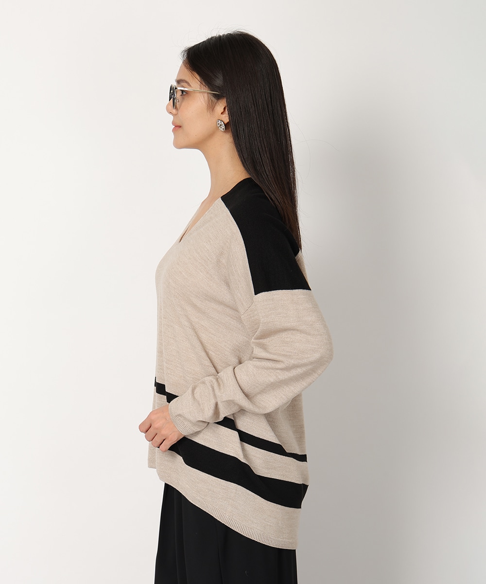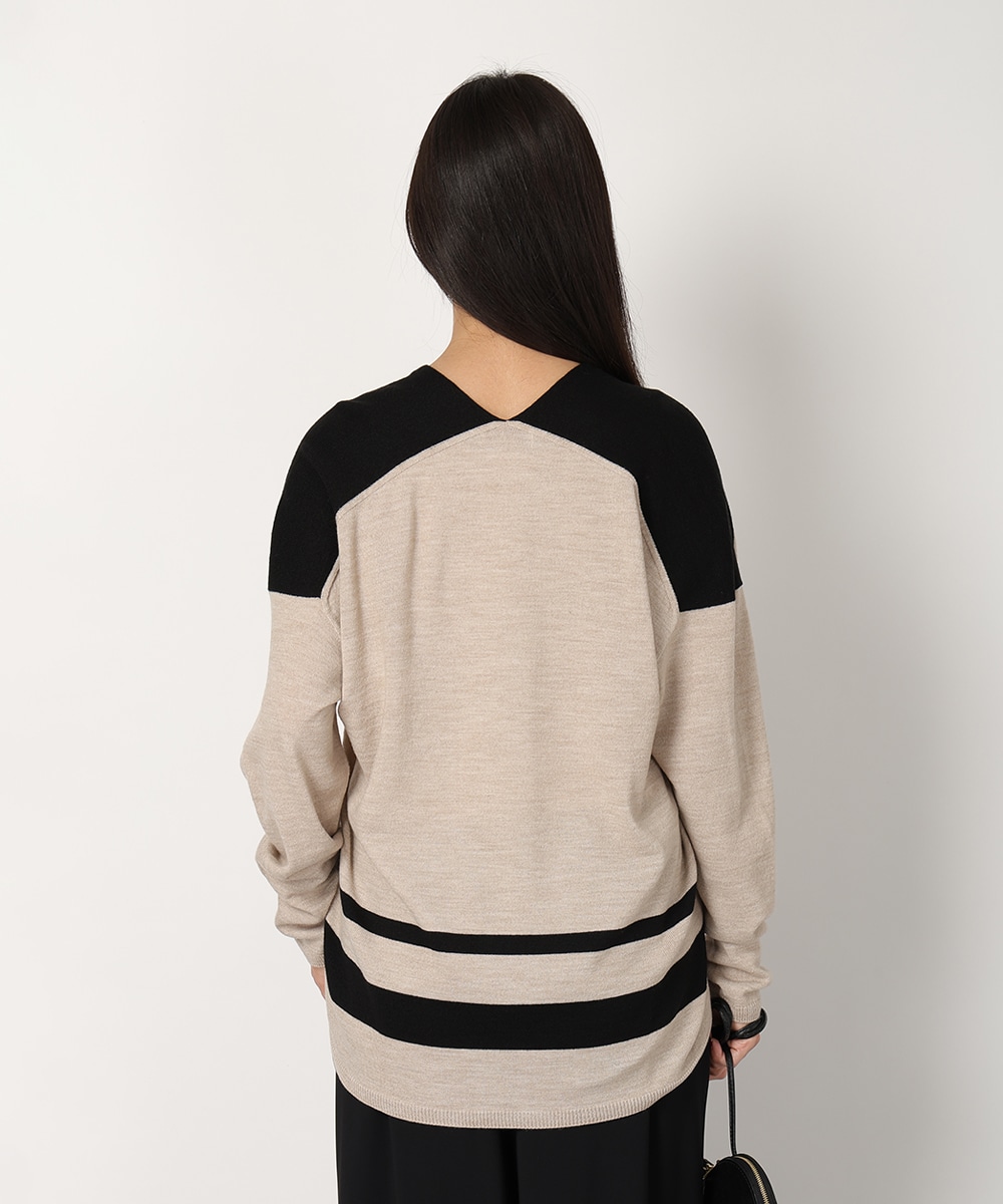 大人っぽく着こなせる落ち着いたバイカラーのパネルボーダーで仕上げました。首元からデコルテラインを美しく魅せる絶妙なVネックがポイント。縫い目のないホールガーメント製法は美しいシルエットを生み出し、さらりとした着心地を提供。リラックス感のあるパンツと合わせるだけでも、こなれた雰囲気をプラスします。