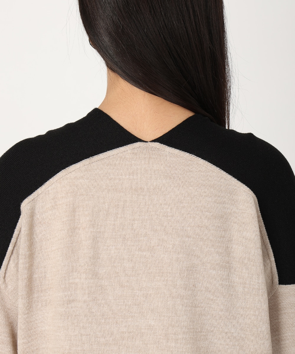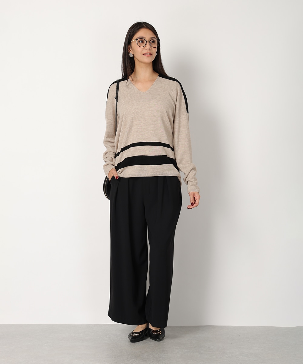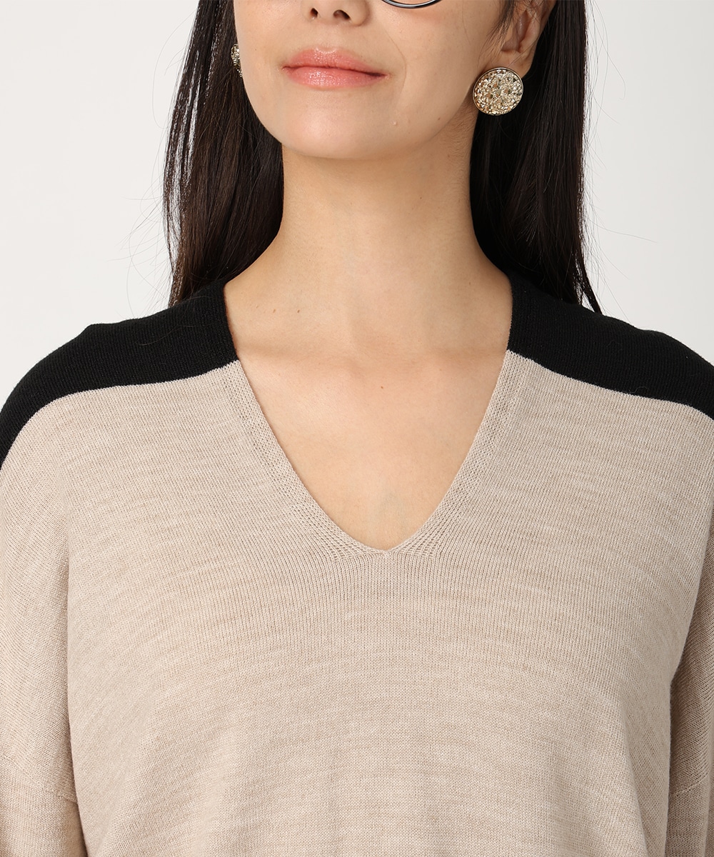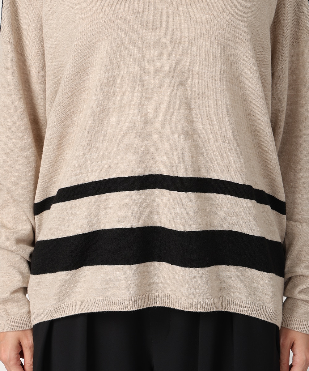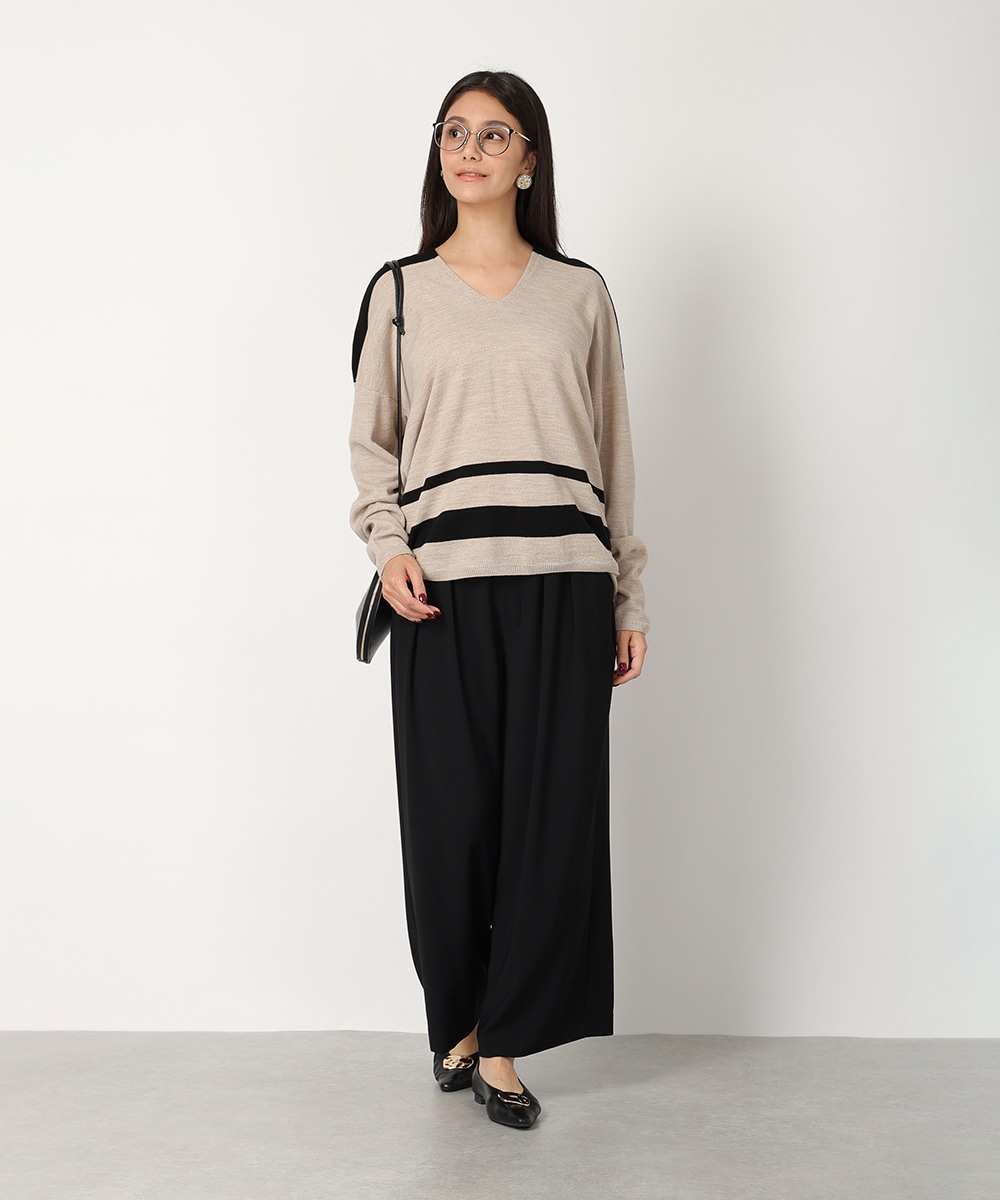 大人っぽく着こなせる落ち着いたバイカラーのパネルボーダーで仕上げました。首元からデコルテラインを美しく魅せる絶妙なVネックがポイント。縫い目のないホールガーメント製法は美しいシルエットを生み出し、さらりとした着心地を提供。リラックス感のあるパンツと合わせるだけでも、こなれた雰囲気をプラスします。