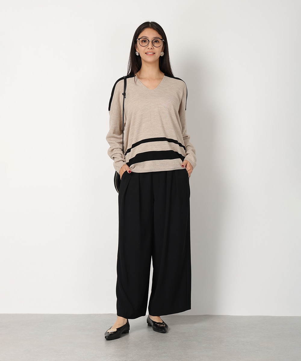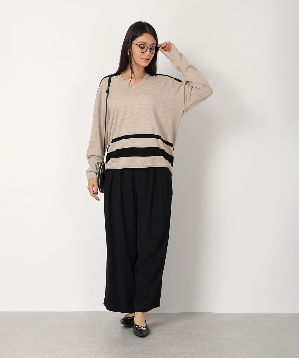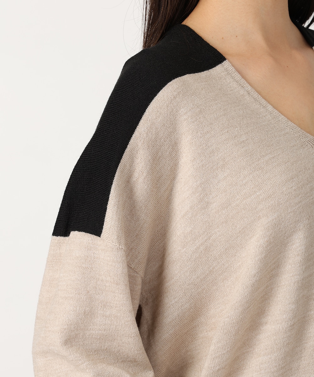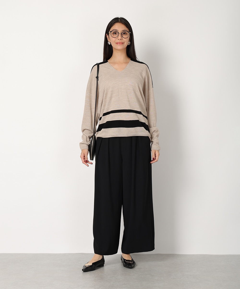 大人っぽく着こなせる落ち着いたバイカラーのパネルボーダーで仕上げました。首元からデコルテラインを美しく魅せる絶妙なVネックがポイント。縫い目のないホールガーメント製法は美しいシルエットを生み出し、さらりとした着心地を提供。リラックス感のあるパンツと合わせるだけでも、こなれた雰囲気をプラスします。
