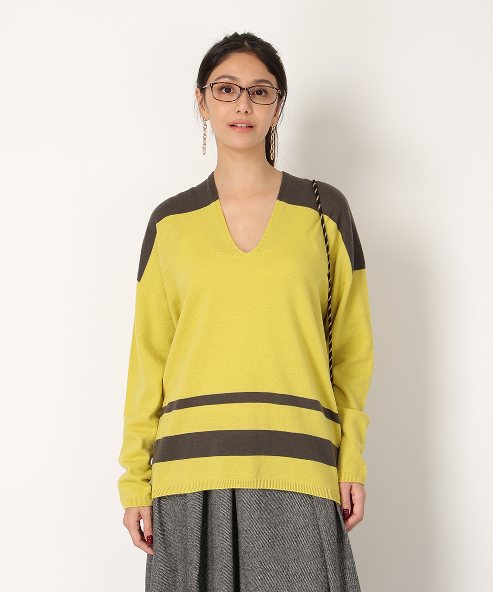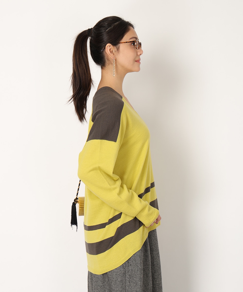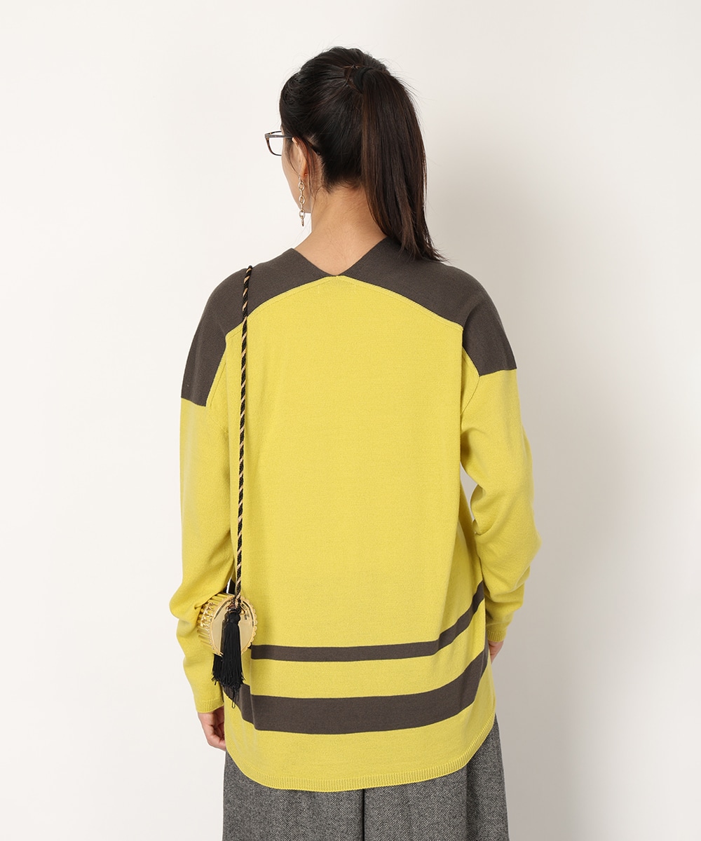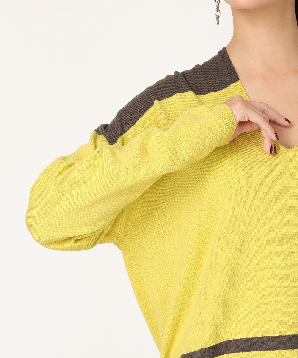 ビビットなバイカラーのパネルボーダーで華やかに仕上げました。首元からデコルテラインを美しく魅せる絶妙なVネックがポイント。縫い目のないホールガーメント製法は美しいシルエットを生み出し、さらりとした着心地を提供。リラックス感のあるボトムスと合わせるだけでも、こなれた雰囲気をプラスします。