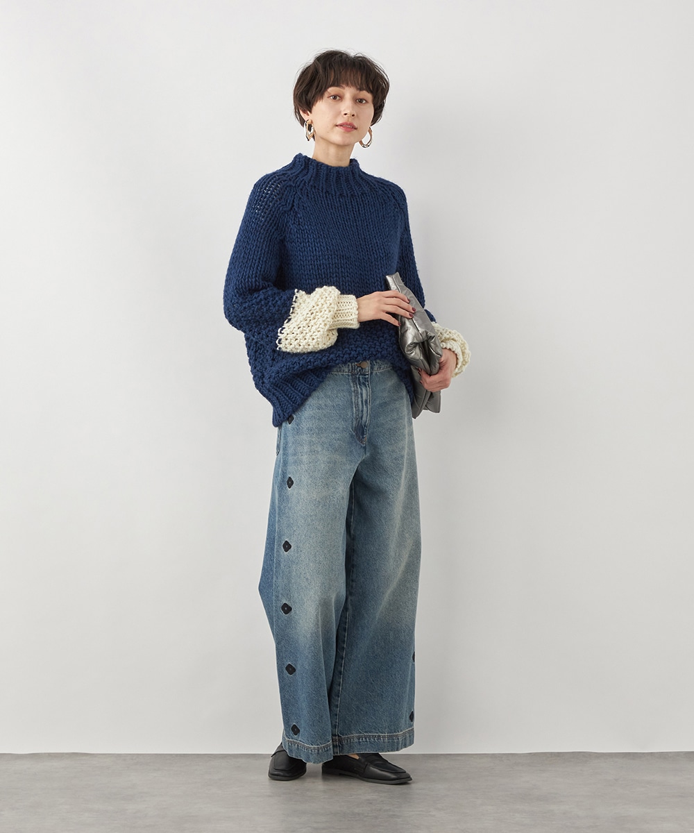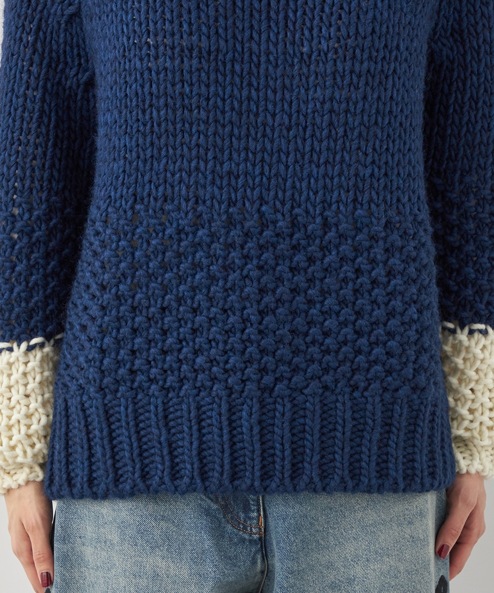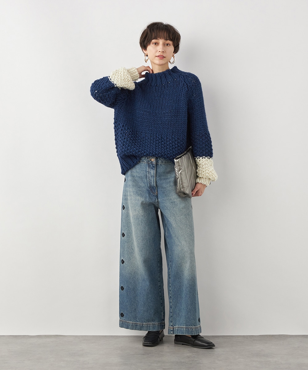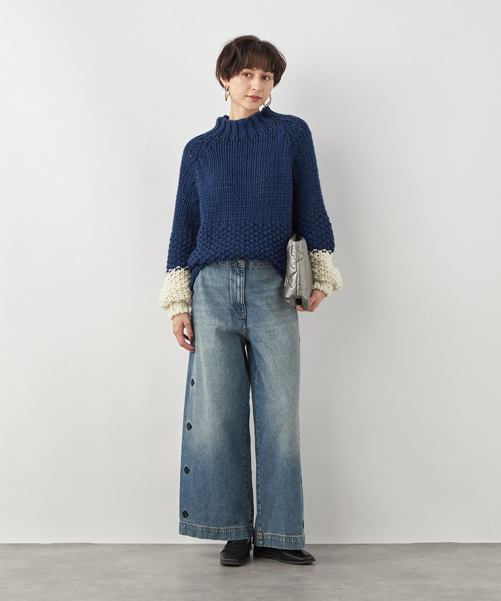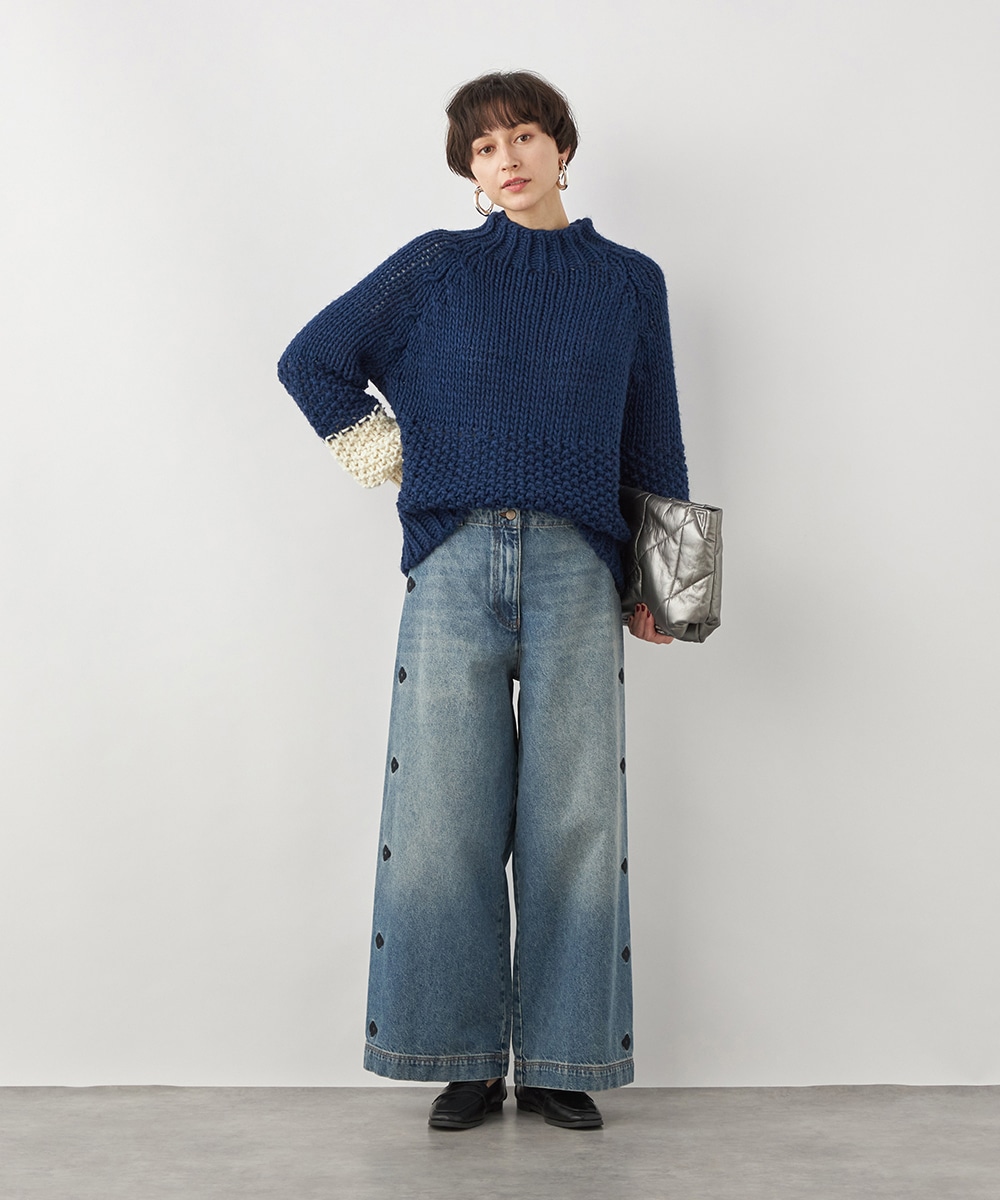 太めの糸を編み立てており、ナチュラル感のある表情に仕上がっています。編み方の違いのさりげないメリハリもこだわりのポイントです。見た目も着心地も暖かなハイネックを採用しています。シルエットは適度にゆったりとして動きやすく、普段のカジュアルにぴったりです。
