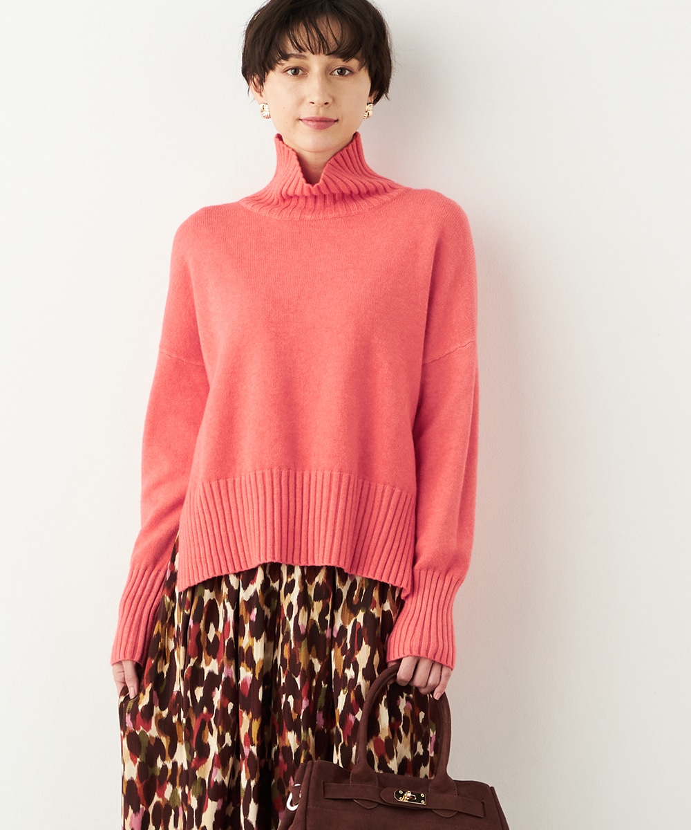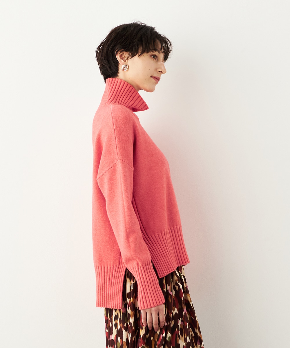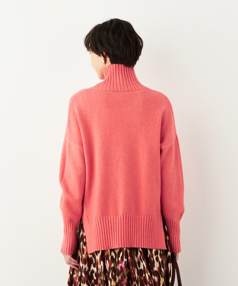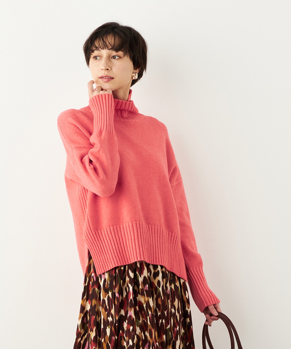 前後差のある着丈がモードな印象。秋冬コーディネートにおすすめのタートルニット。
